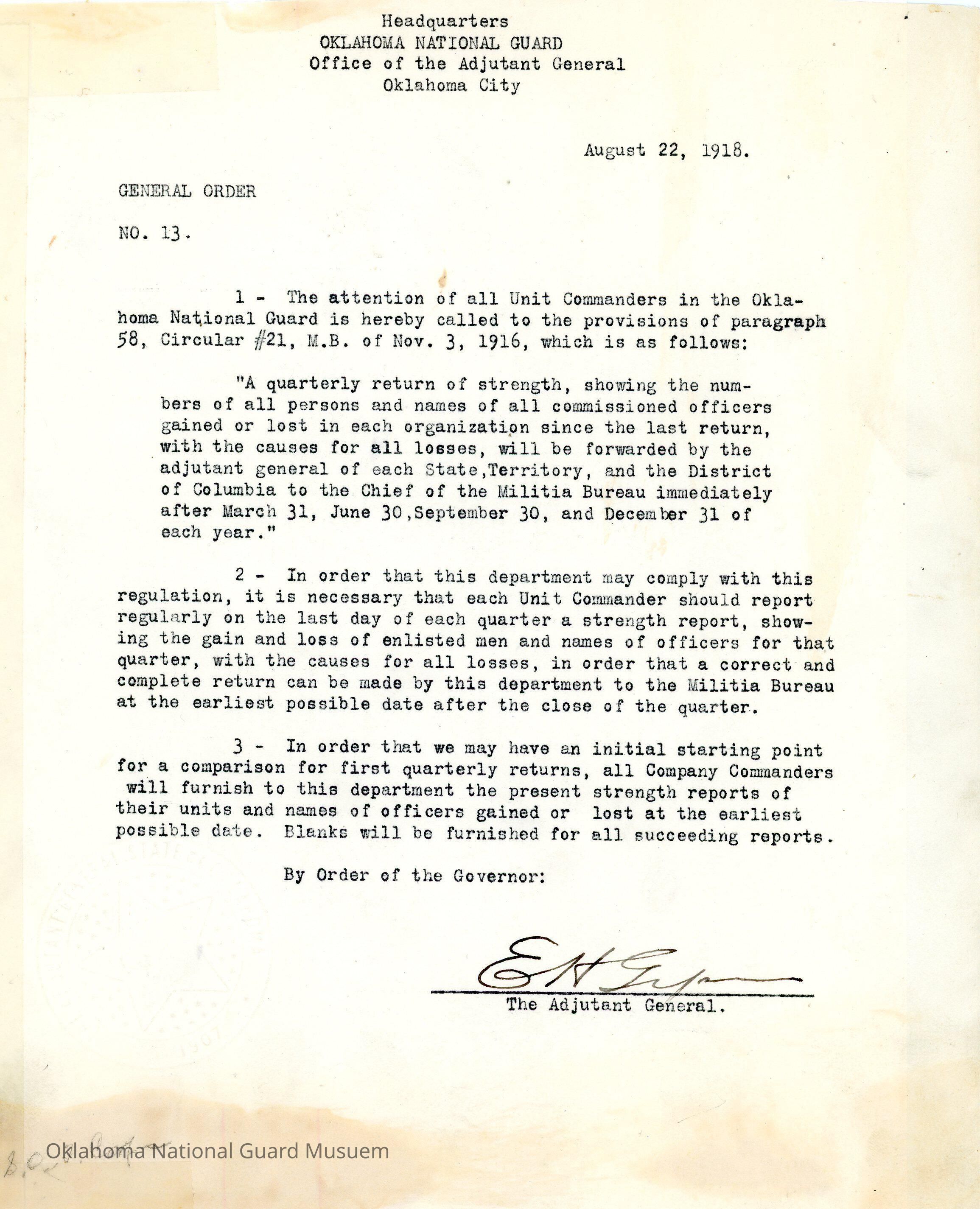 General Order #13 from Headquarters Adjutant General's Office in Oklahoma City. The order requires all Unit Commanders provide a strength report on the last day of each quarter.Date(s) of Creation