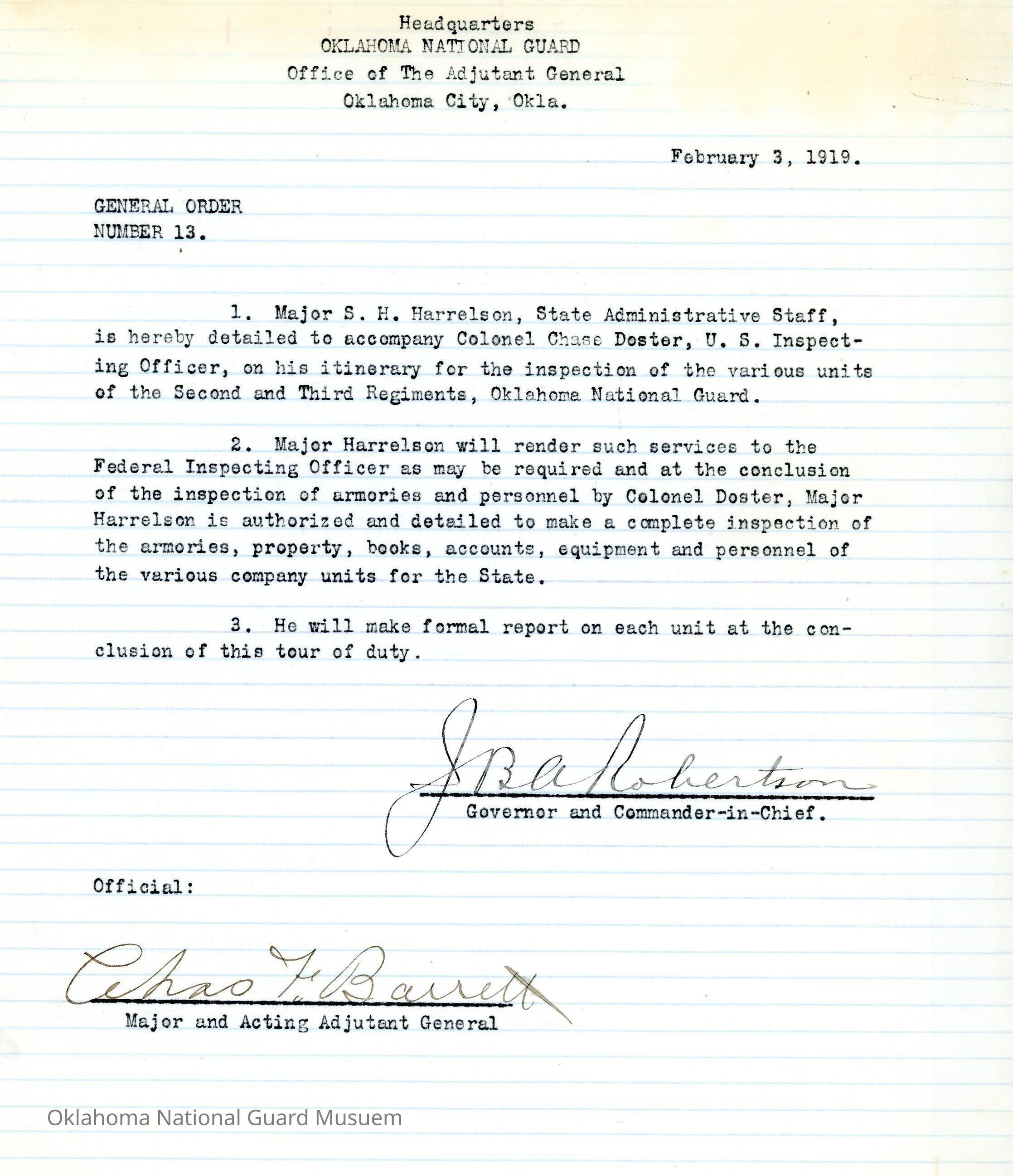 General Order #13 from Headquarters Adjutant General's Office in Oklahoma City. The order instructs S.H. Harrelson to accompany Chase Doster on his itinerary for the inspection of the various units of the Second and Third Regiments of the Oklahoma National Guard.Date(s) of Creation