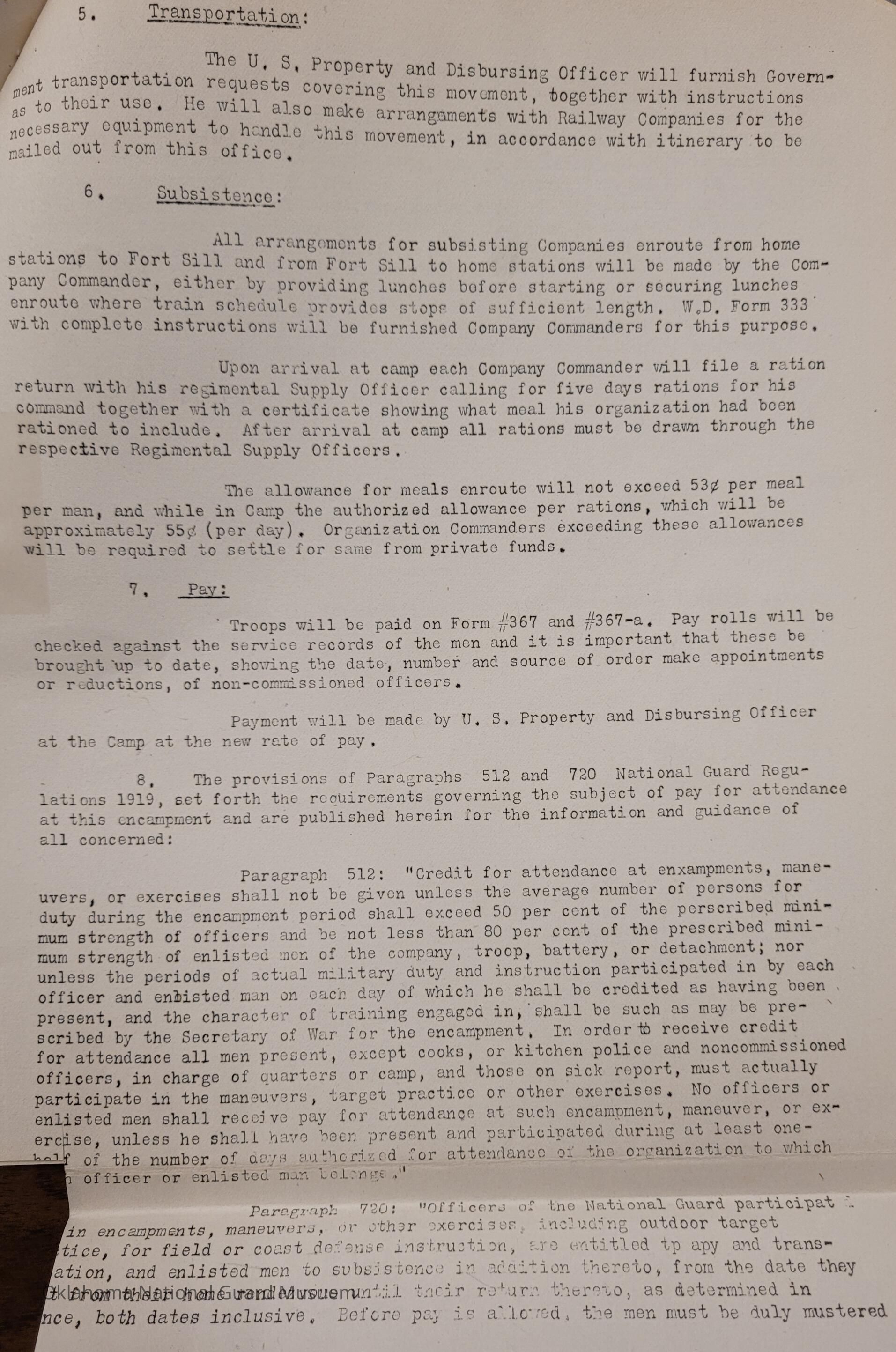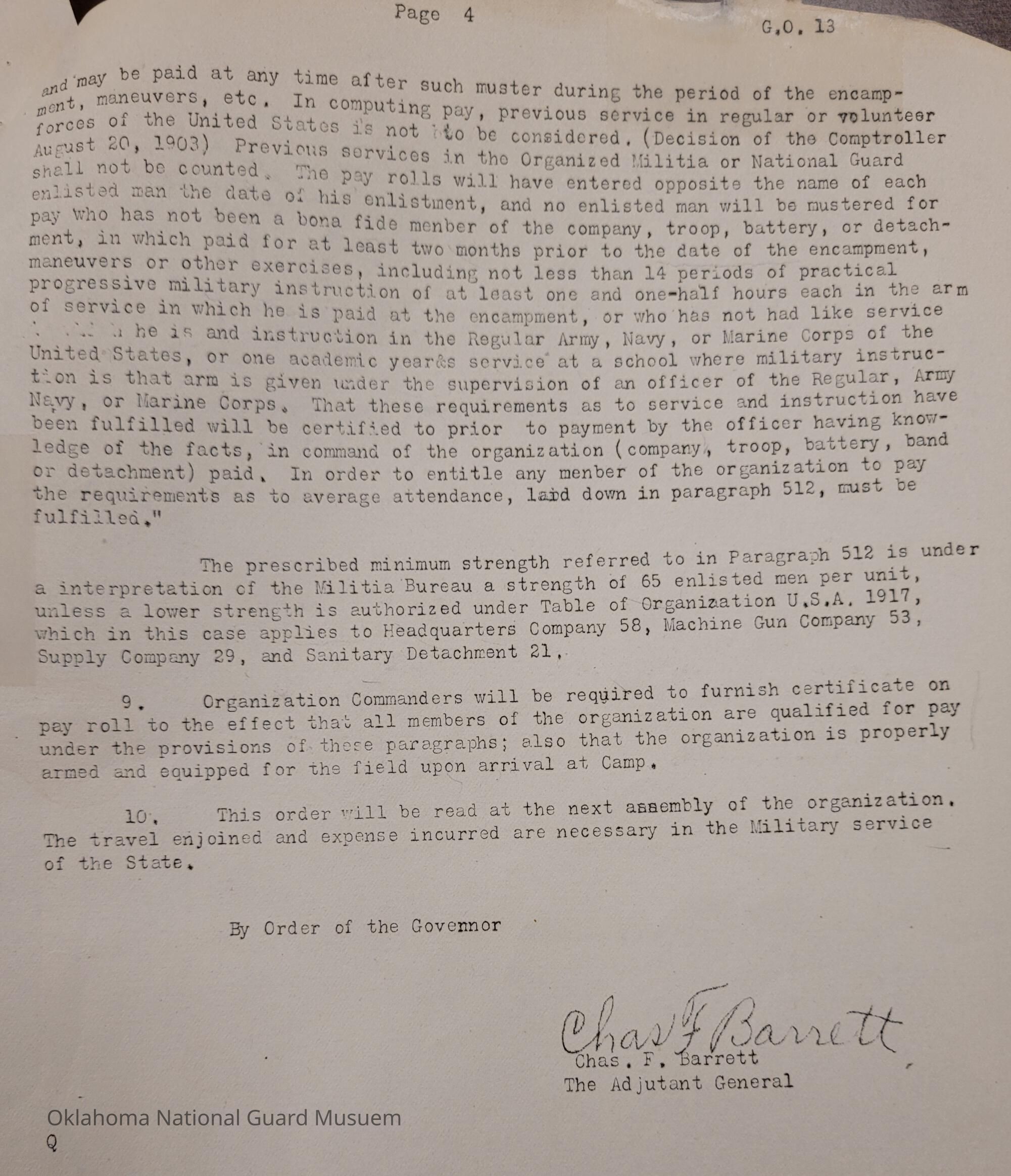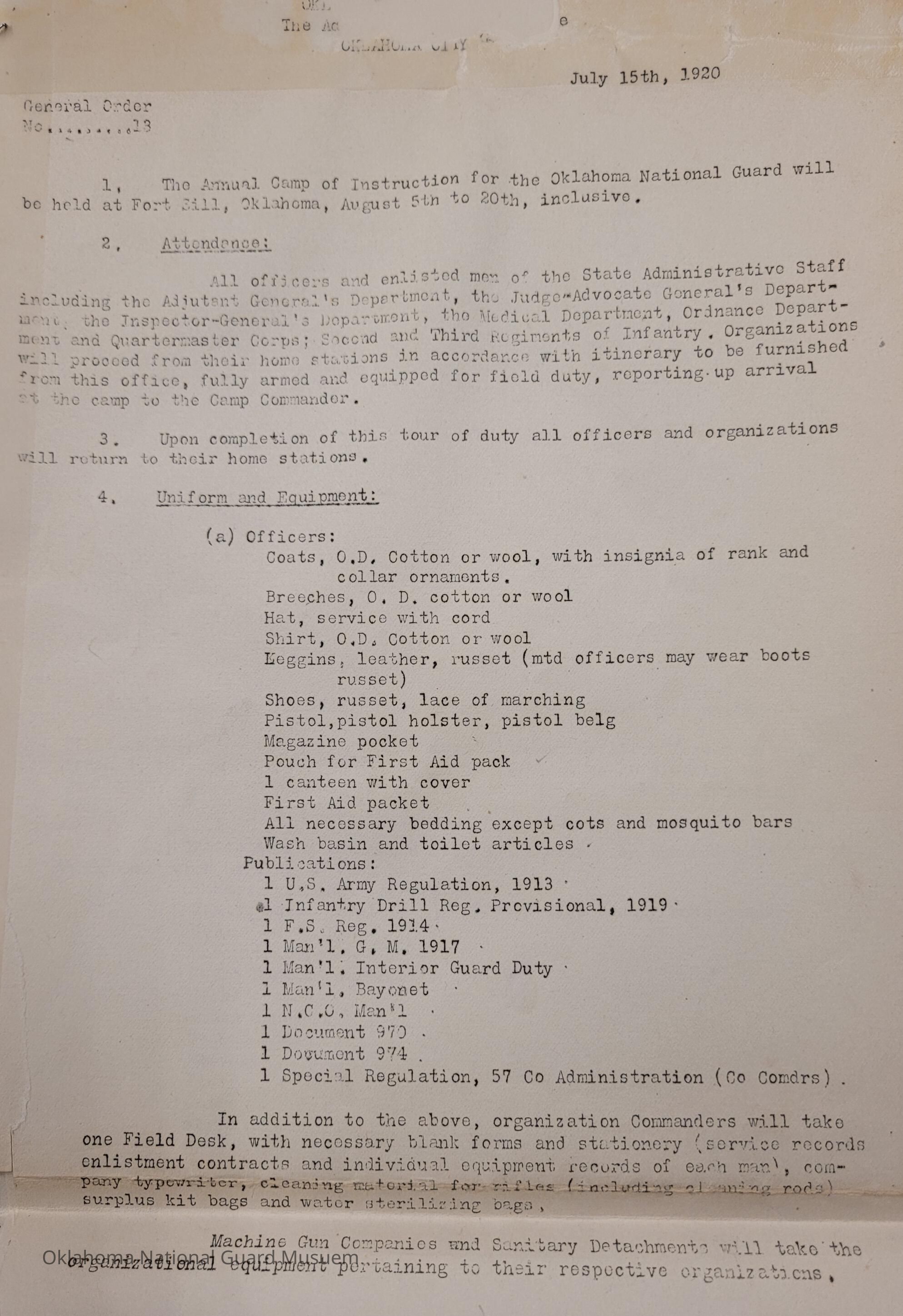 General Order #13 from Headquarters Adjutant General's Office in Oklahoma City. The order details the uniform, equipment, transportation, and pay requirements related to the annual Camp of Instruction at Fort Sill.Date(s) of Creation