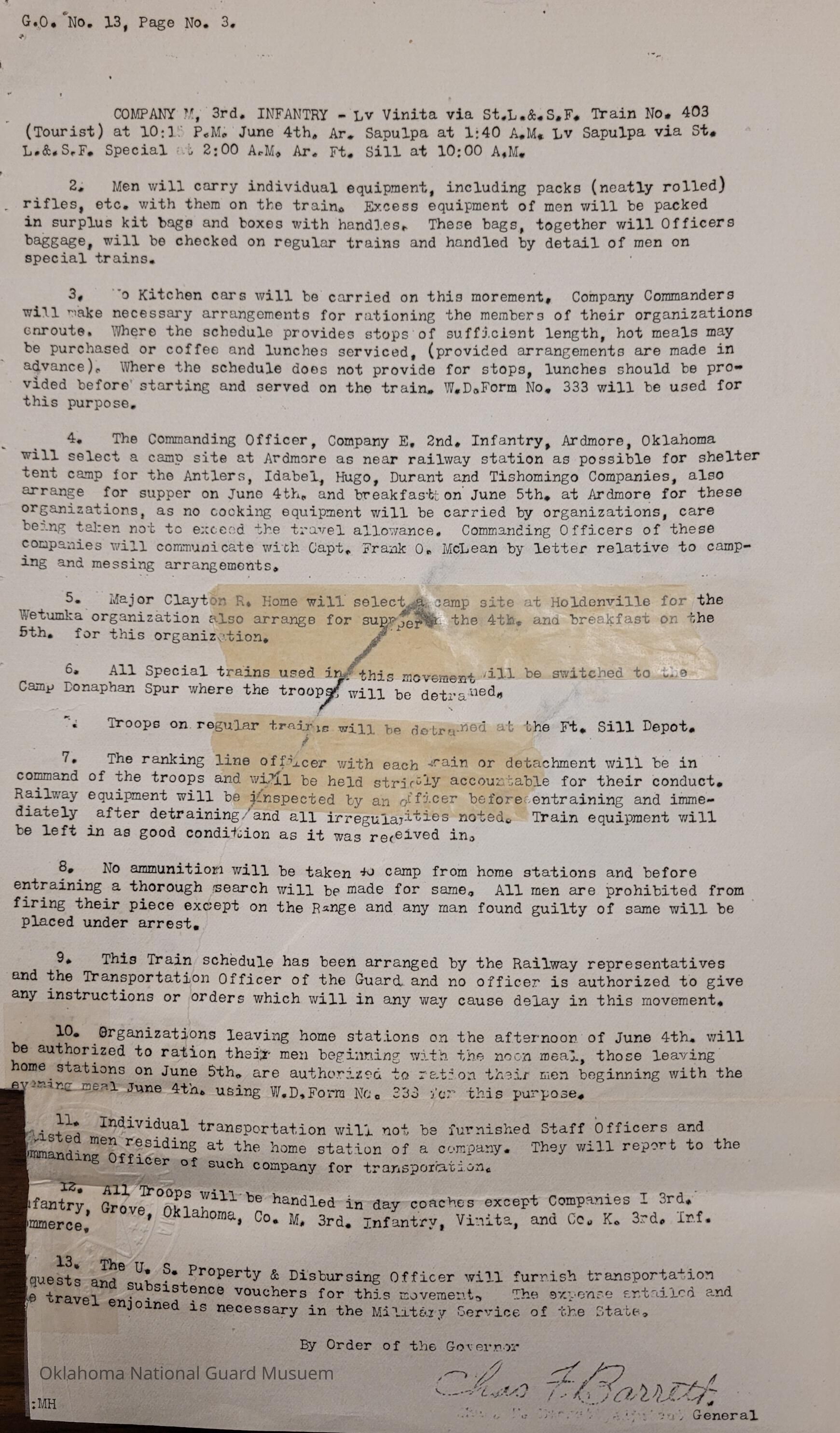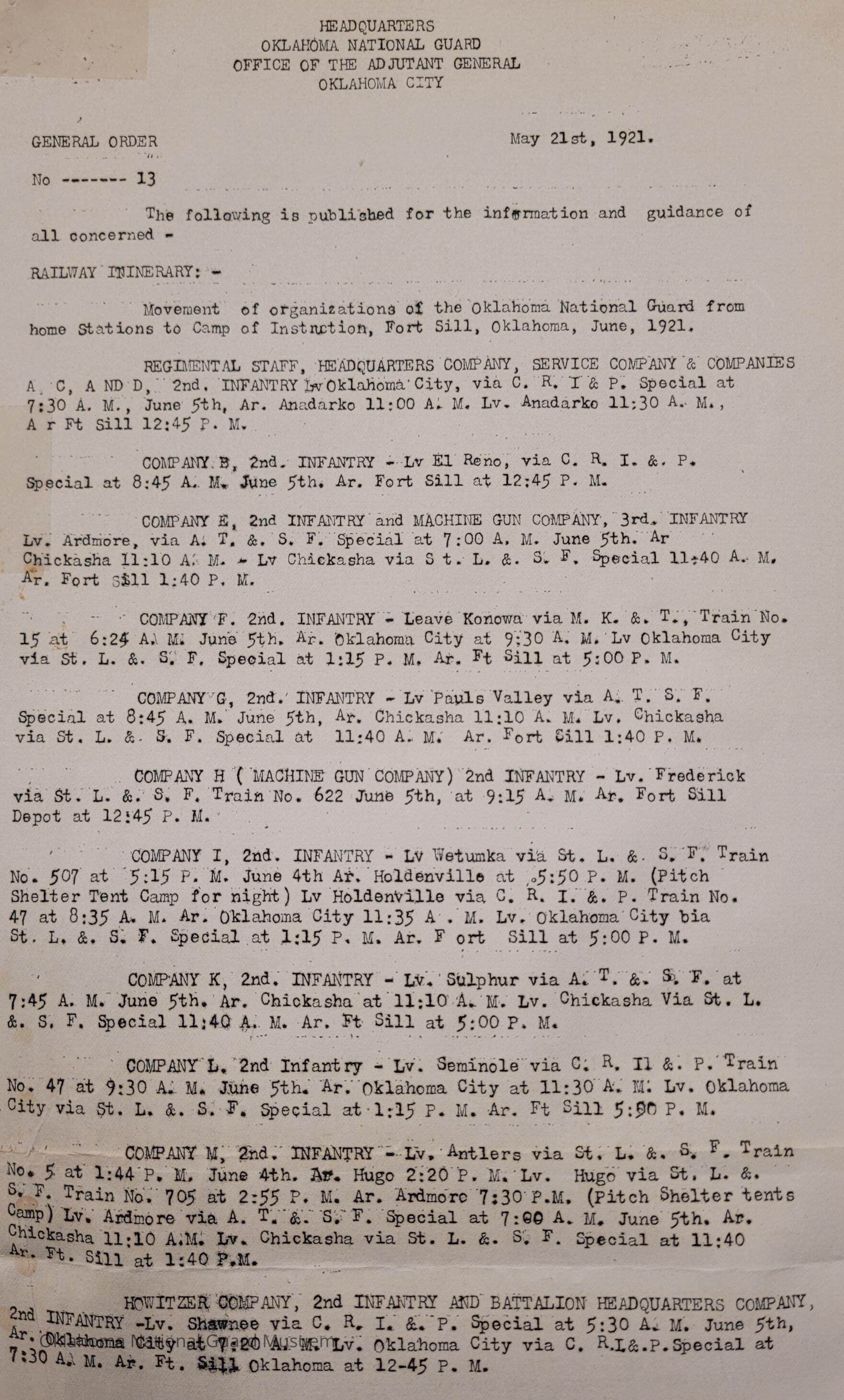 General Order #13 from Headquarters Adjutant General's Office in Oklahoma City. The order details the travel schedule for Second Regiment and Third Regiment from their home stations to Fort SillDate(s) of Creation