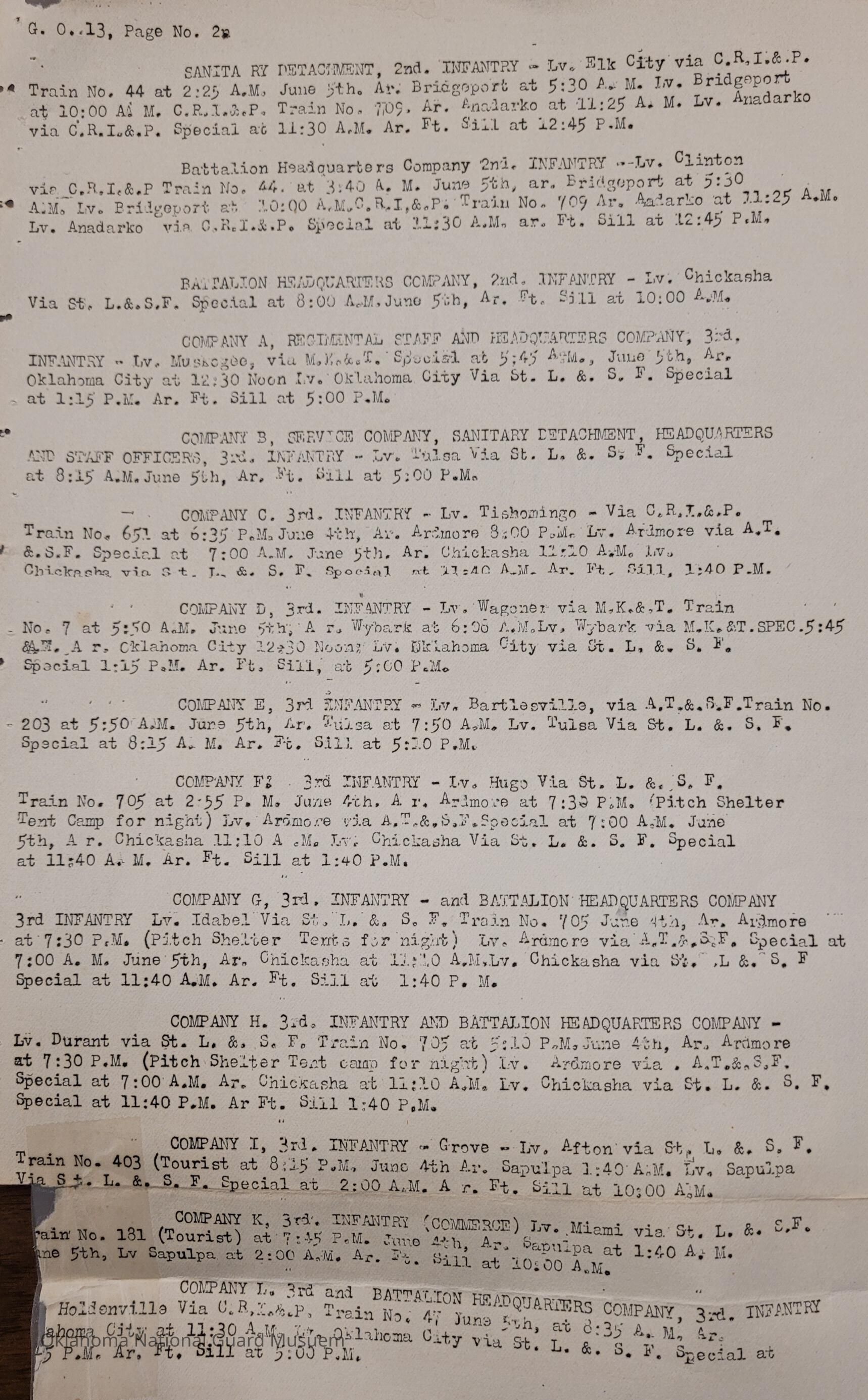 Adjutant General, Oklahoma City, Second Regiment, Charles F. Barrett, Fort Sill, Camp of Instruction, Third Regiment, Train, Railway, Anadarko, El Reno, Ardmore, Chickasha, Konowa, Pauls Valley, Frederick, Wetumka, Holdenville, Sulphur, Seminole, Antlers, Hugo, Shawnee, Elk City, Bridgeport, Clinton, Muskogee, Tulsa, Tishomingo, Wagoner, Wybark, Idabel, Durant, Grove, Sapulpa, Miami, Vinita, Clayton R. Home, Schedule