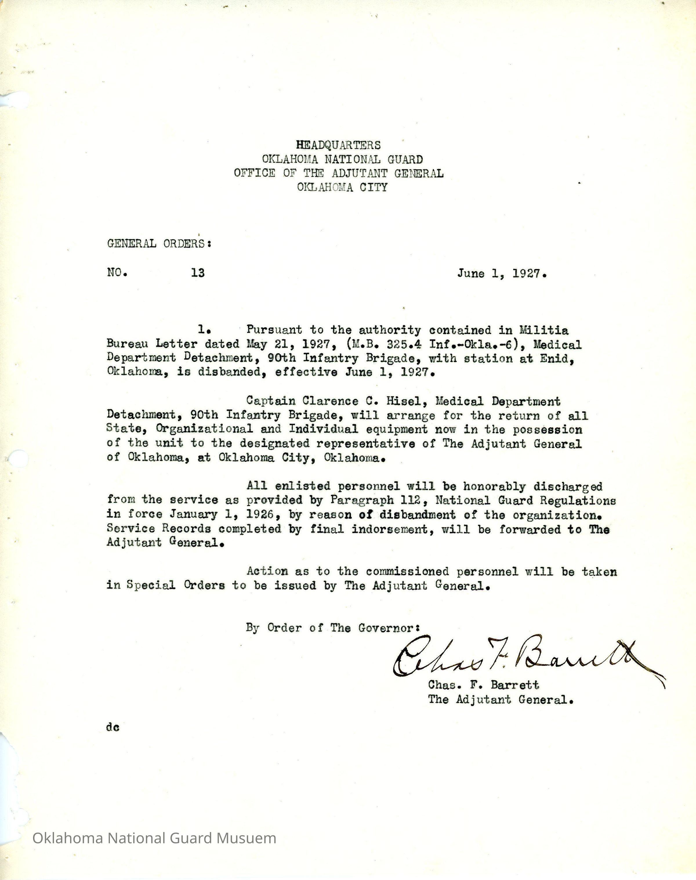 General Order #13 from Headquarters Adjutant General's Office in Oklahoma City. The order disbands Medical Department Detachment 90th Infantry Brigade located in EnidDate(s) of Creation