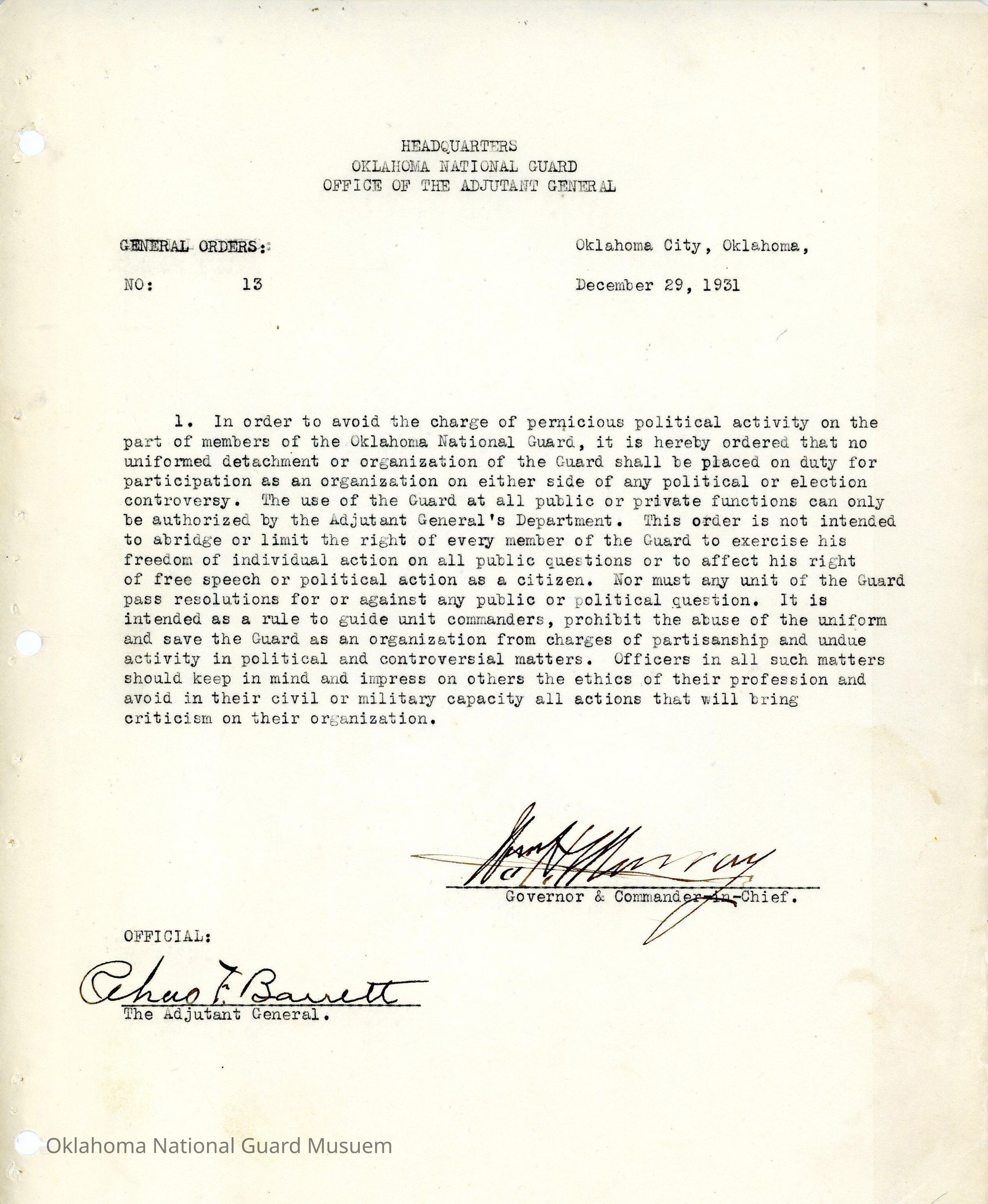 General Order #13 from Headquarters Adjutant General's Office in Oklahoma City. The order forbids any uniformed detachment of the Oklahoma National Guard from being placed on duty for participation on either side of any political or electoral event.Date(s) of Creation
