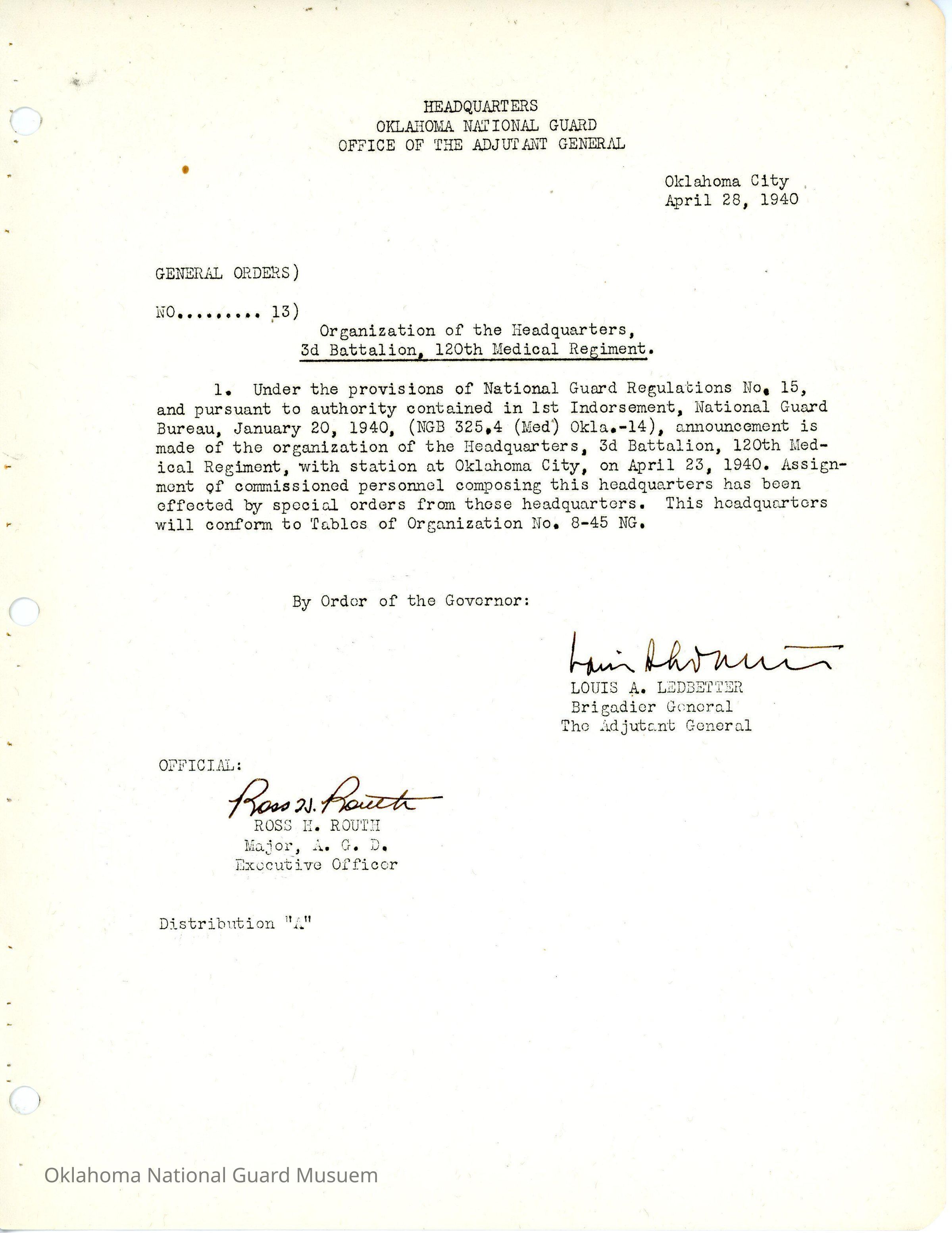 General Order #13 from Headquarters Adjutant General's Office in Oklahoma City. The order organizes 3rd Battalion 120th Medical Regiment stationed in Oklahoma CityDate(s) of Creation