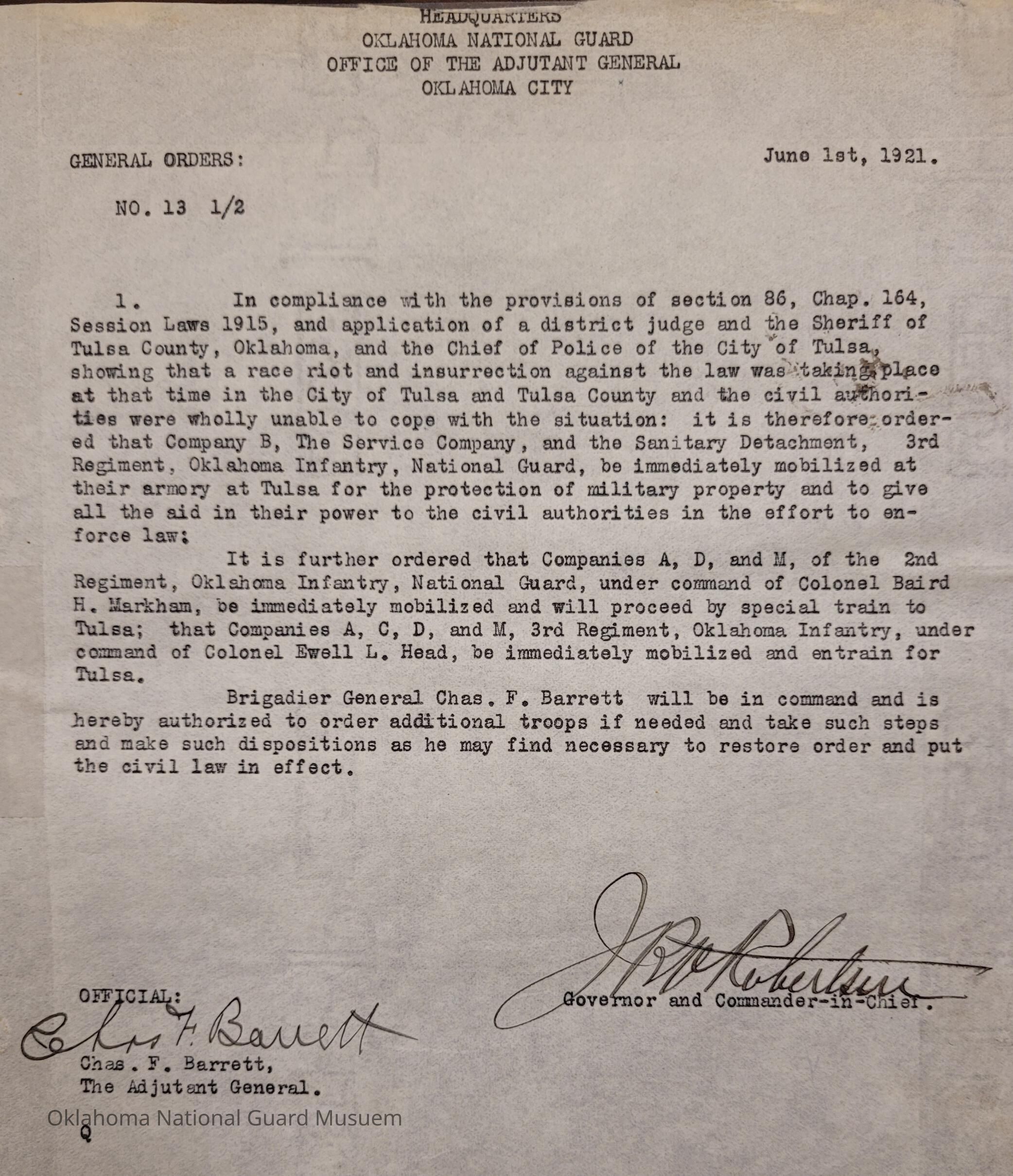 General Order #13.5 from Headquarters Adjutant General's Office in Oklahoma City. The order mobilized Company B, Service Company, and the Sanitary Detachment of the Third Regiment to protect military property in Tulsa. It also mobilized Company A, Company D, and Company M of the Second Regiment and ordered them to Tulsa. Company A, Company C, Company D, and Company M of the Third Regiment will also be mobilized and sent to Tulsa.Date(s) of Creation