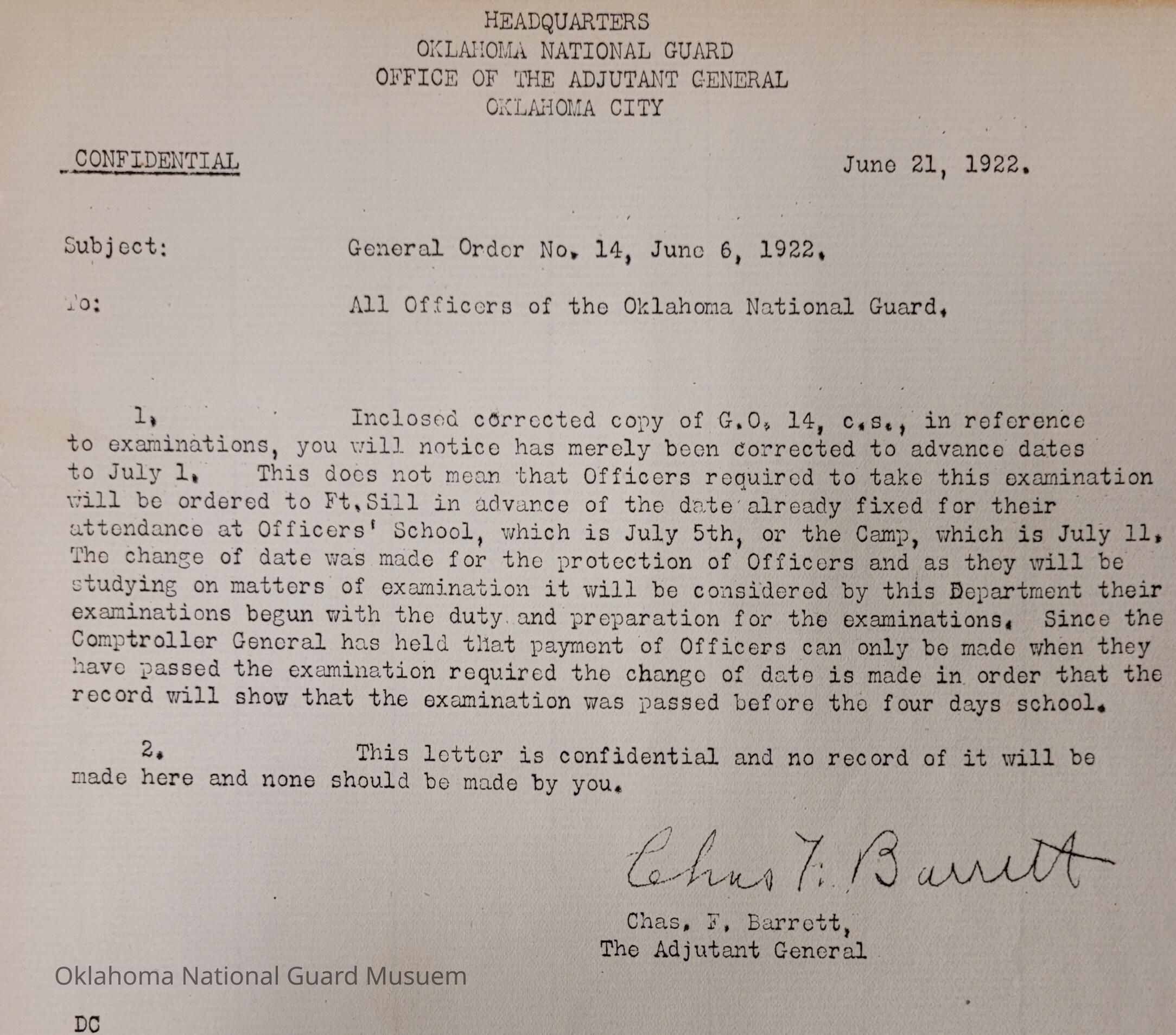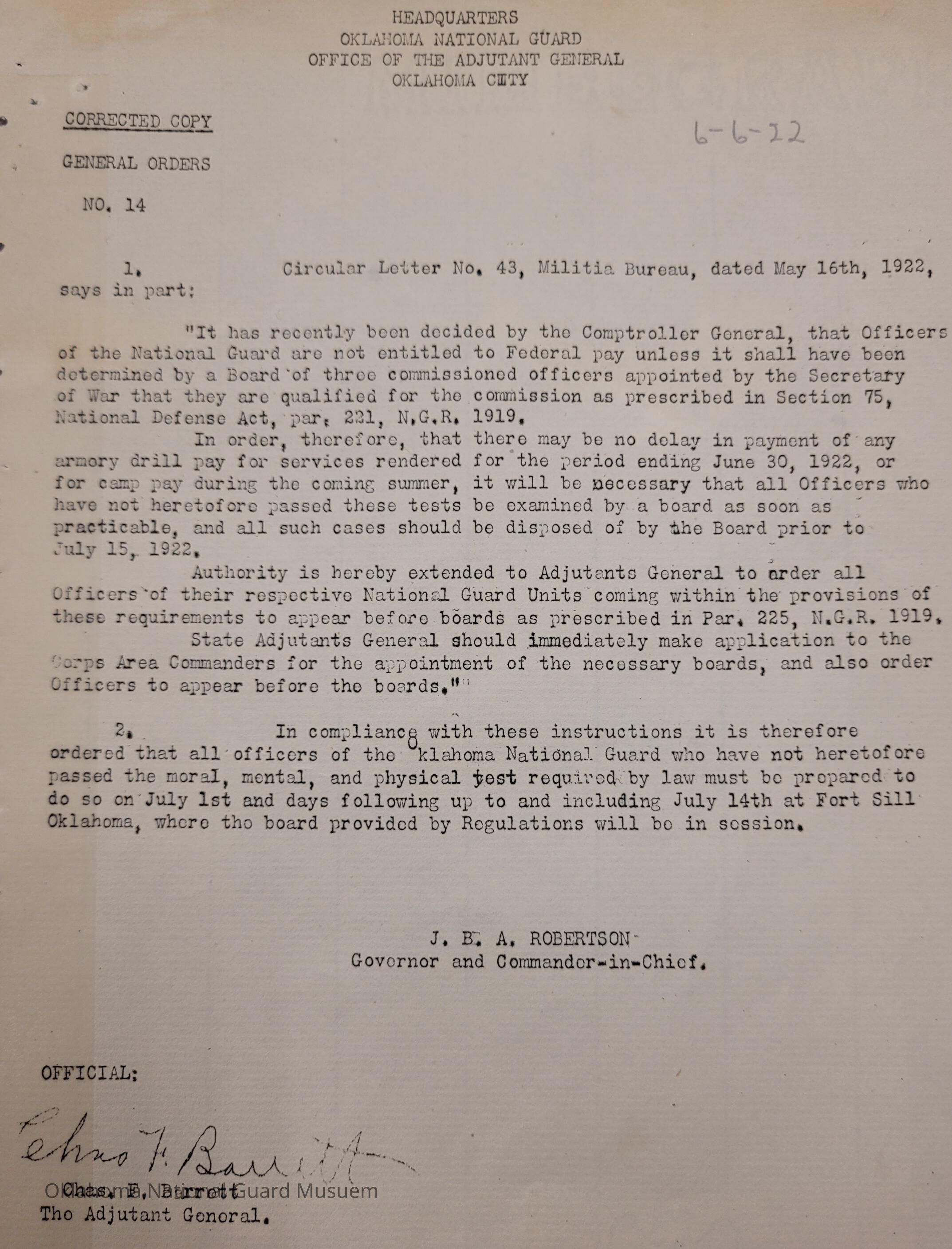General Order #14 Corrected Copy from Headquarters Adjutant General's Office in Oklahoma City. The order requires all officers in the Oklahoma National Guard to pass their moral, mental, and physical tests in order to receive pay. Those who have not passed must report to Fort Sill and go before a board to complete this requirement. Some corrections and alterations from General Order #14Date(s) of Creation
