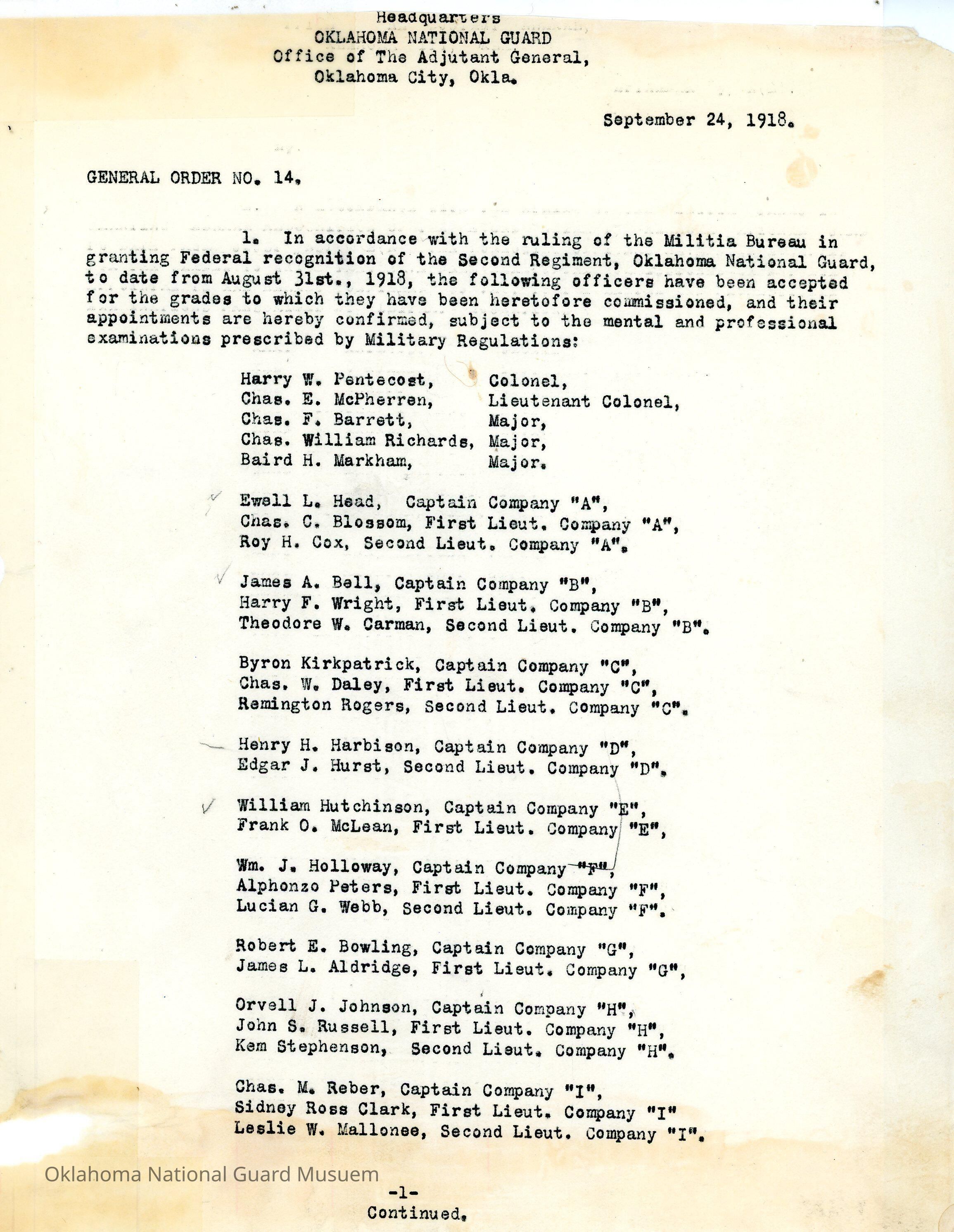 General Order #14 from Headquarters Adjutant General's Office in Oklahoma City. The order complies with the Federal recognition of the Second Regiment of the Oklahoma National Guard. The following list of officers are now commissioned and assigned to the Second Regiment.Date(s) of Creation