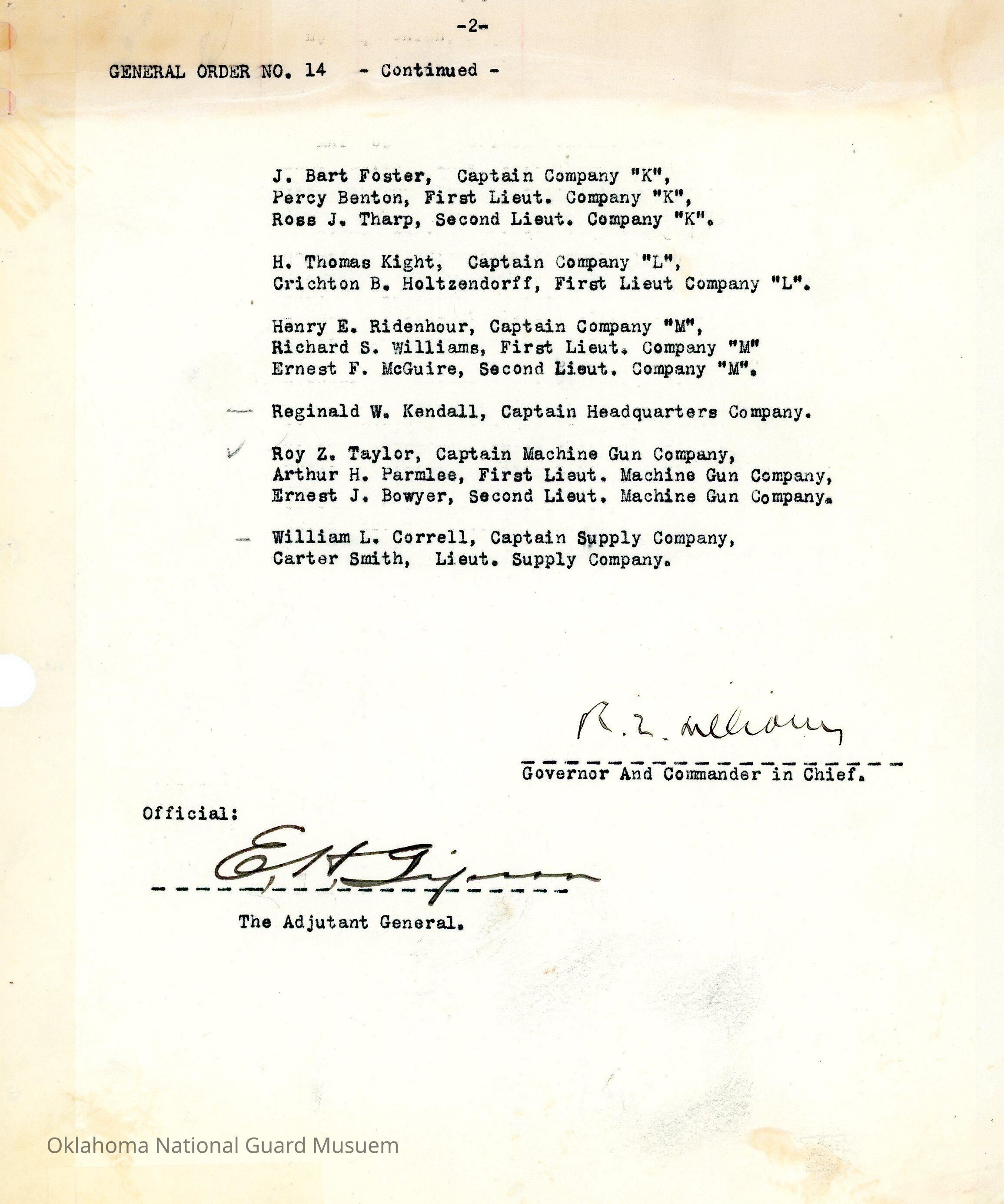 Adjutant General, Oklahoma City, Ennis H. Gipson, Militia Bureau, Robert L. Williams, Second Regiment, Harry W. Pentecost, Charles E. McPherren, Charles F. Barrett, Charles William Richards, Baird H. Markham, Ewell L. Head, Charles C. Blossom, Roy H. Cox, James A. Bell, Harry F. Wright, Theodore W. Carman, Byron Kirkpatrick, Charles W. Daley, Remington Rogers, Henry H. Harbison, Edgar J. Hurst, William Hutchinson, Frank O. McLean, William J. Holloway, Alphonzo Peters, Lucian G. Webb, Robert E. Bowling, James L. Aldridge, Orvell J. Johnson, John S. Russell, Kem Stephenson, Charles M. Reber, Sidney Ross Clark, Leslie W. Mallonee, J. Bart Foster, Percy Benton, Ross J. Tharp, H. Thomas Kight, Crichton B. Holtzendorff, Henry E. Ridenhour, Richard S. Williams, Ernest F. McGuire, Reginald W. Kendall, Roy Z. Taylor, Arthur H. Parmlee, Ernest J. Bowyer, William L. Correll, Carter Smith