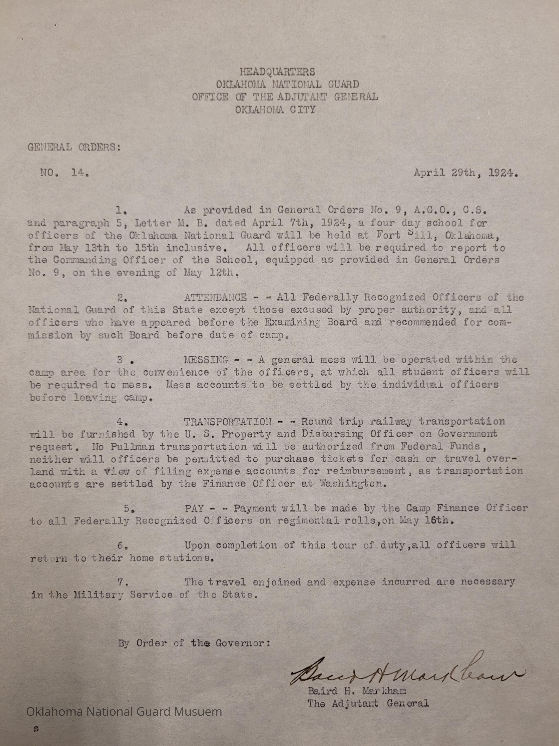 General Order #14 from Headquarters Adjutant General's Office in Oklahoma City. The order details a four day school for officers in the Oklahoma National Guard in Fort Sill. Attendance is required and transportation will be provided.Date(s) of Creation
