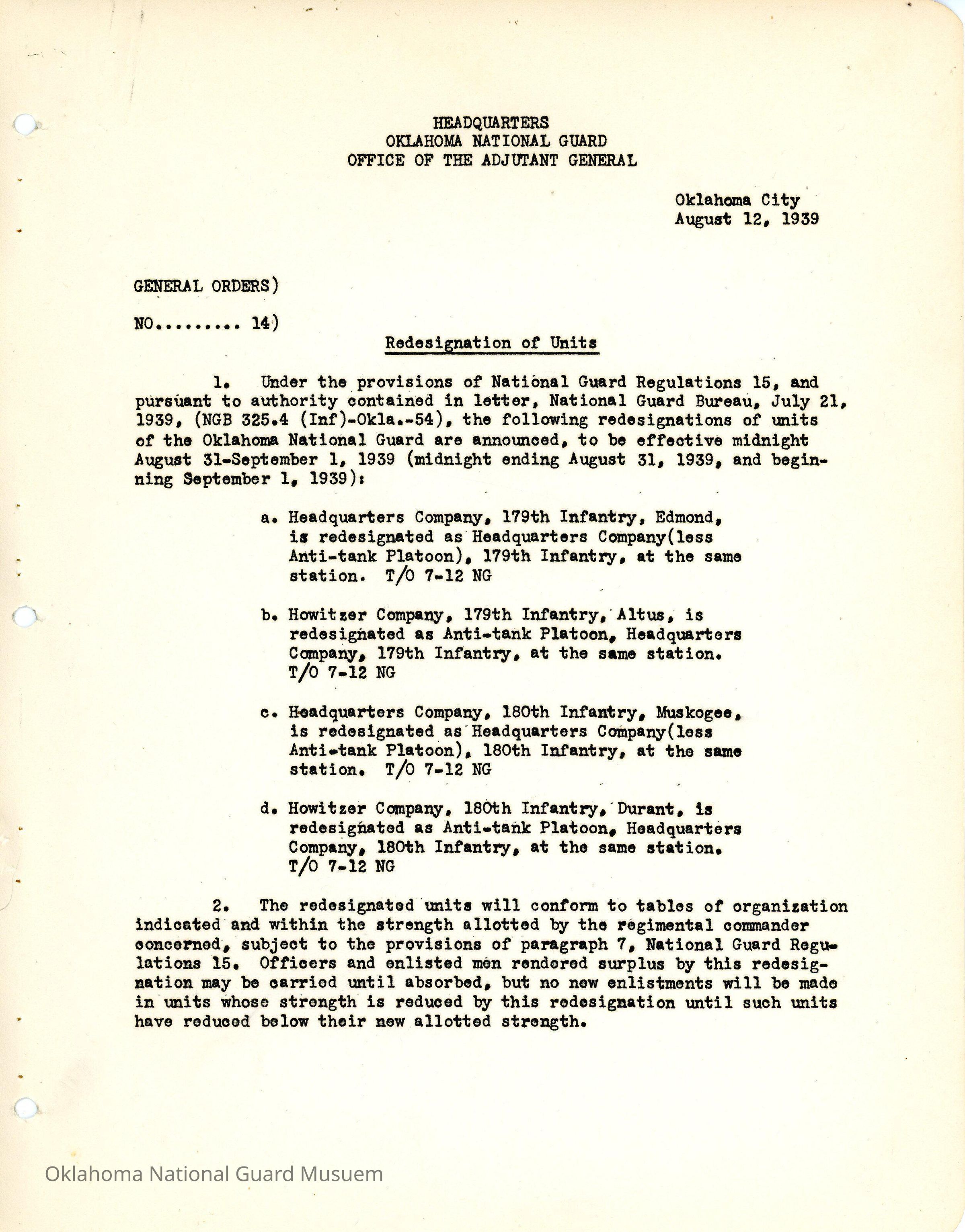 General Order #14 from Headquarters Adjutant General's Office in Oklahoma City. The order redesignates Headquarters Company 179th Infantry, Headquarters Company 180th Infantry, Howitzer Company 179th Infantry, and Howitzer Company 180th InfantryDate(s) of Creation