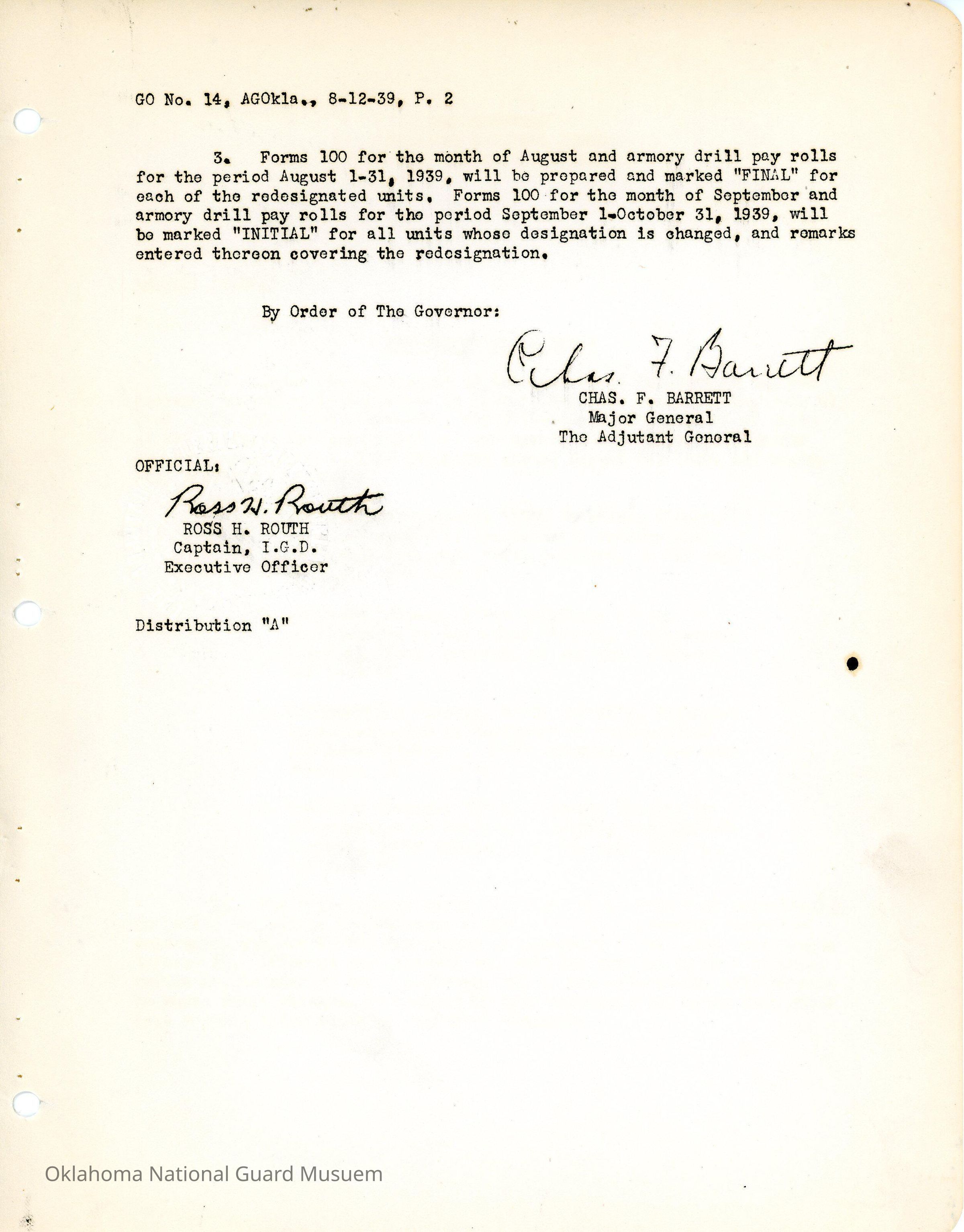 Adjutant General, Oklahoma City, Charles F. Barrett, Ross H. Routh, 179th Infantry, Redesignate, 180th Infantry