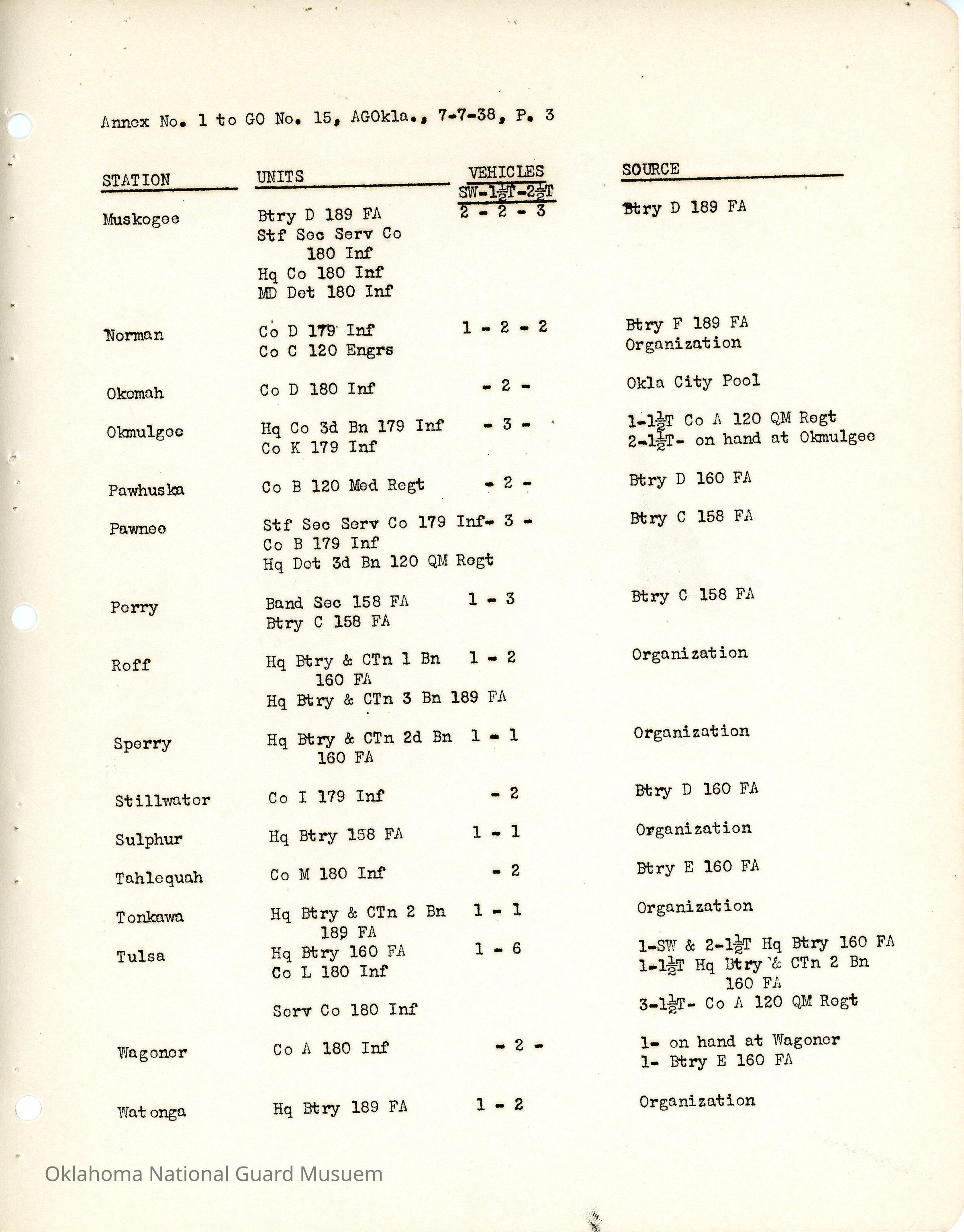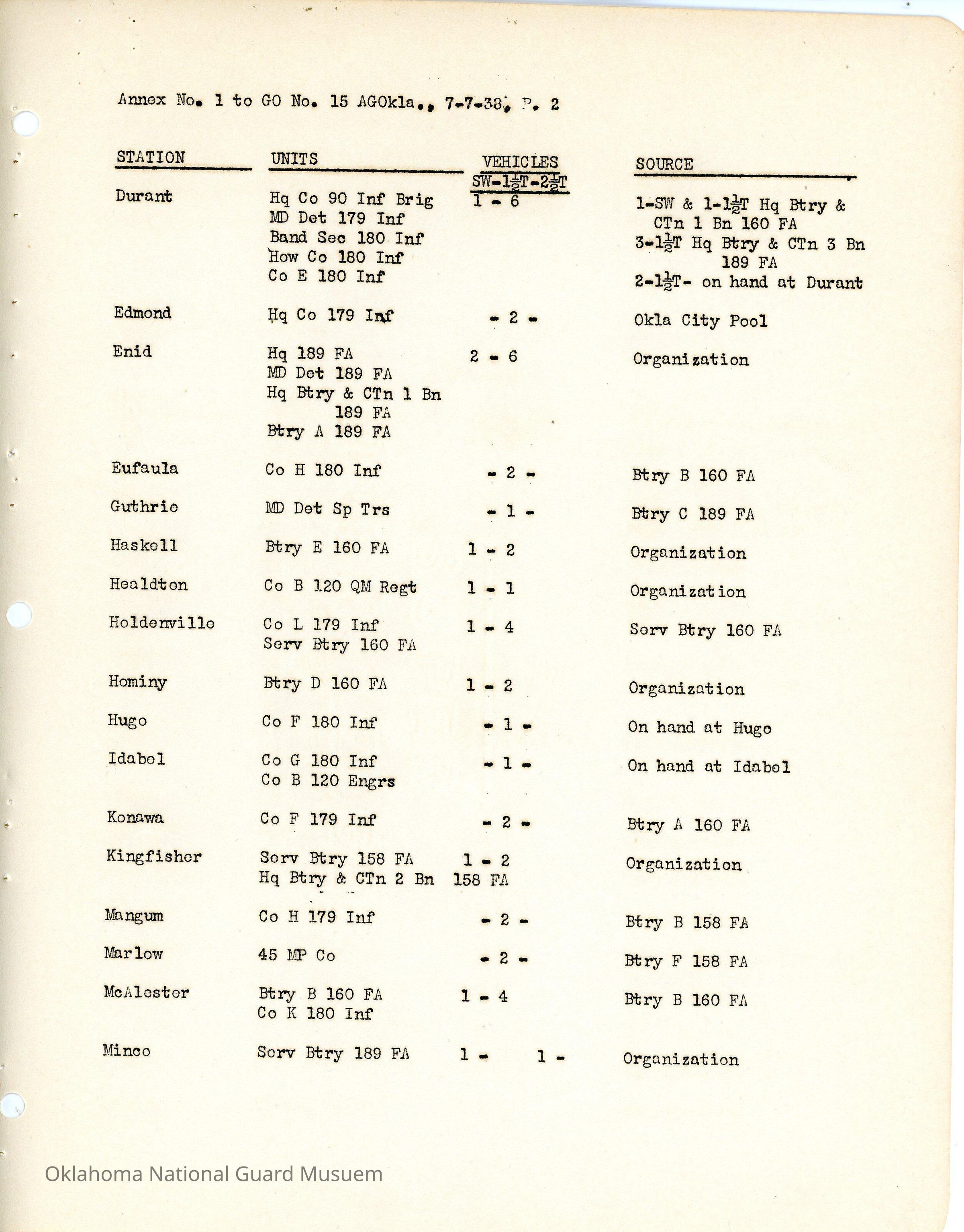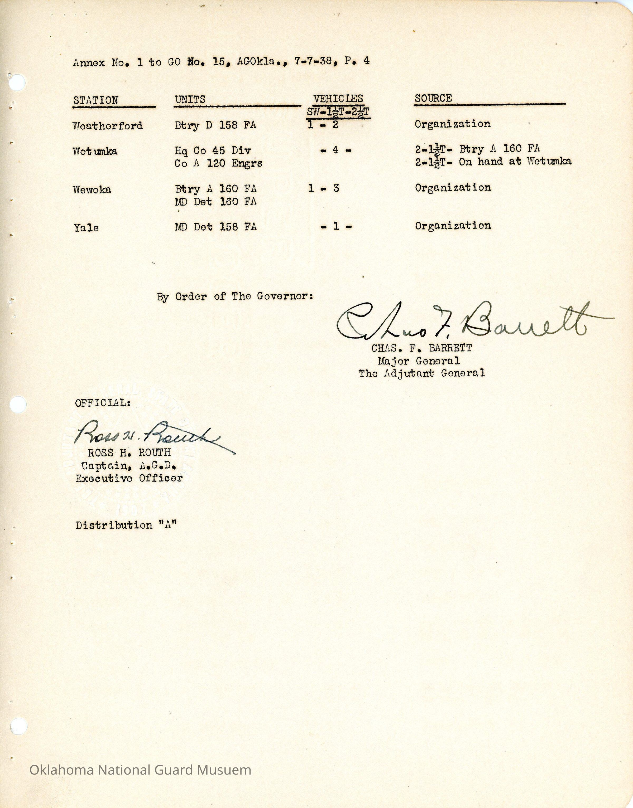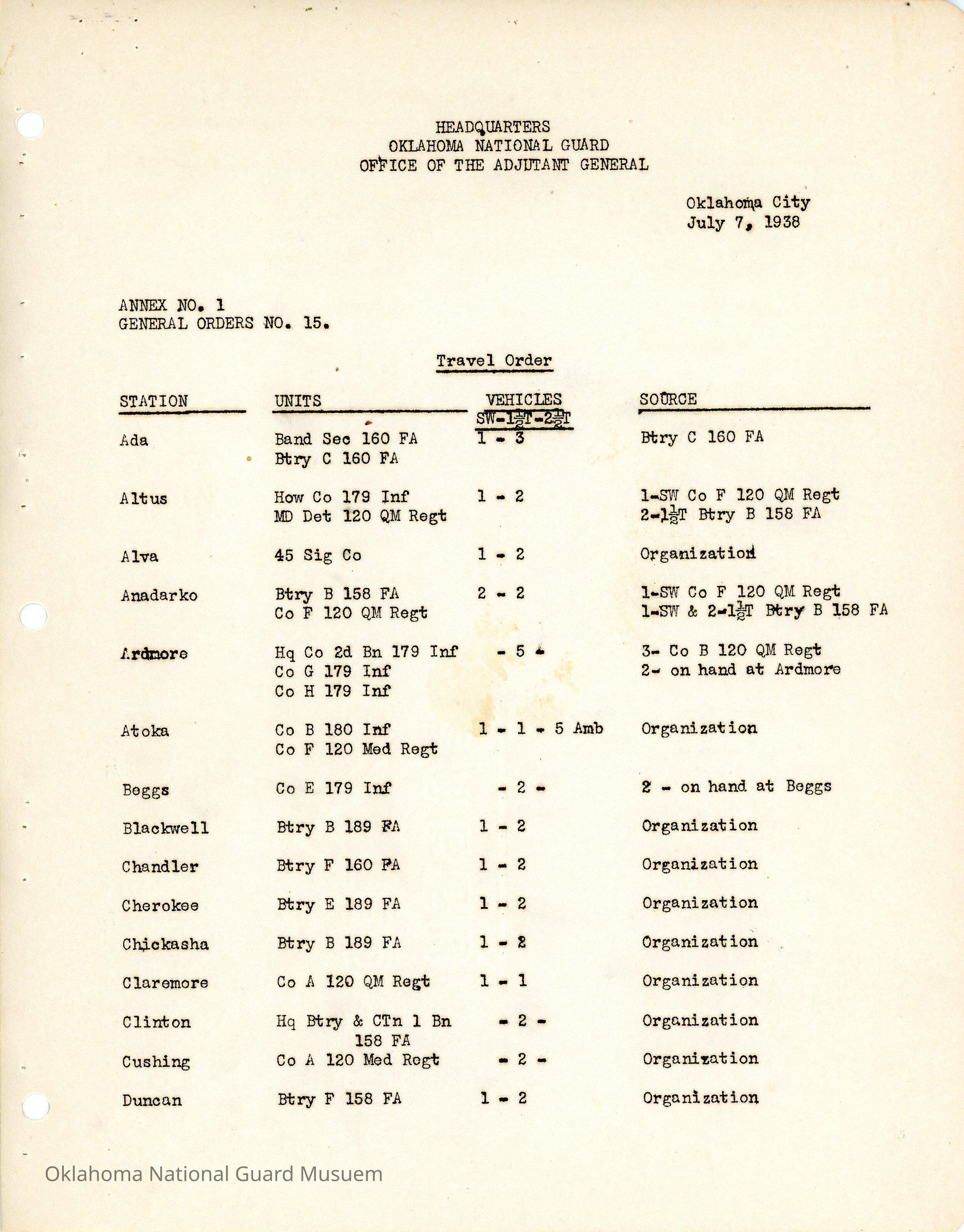 Adjutant General, Oklahoma City, Charles F. Barrett, Ross H. Routh, Travel, Travel orders, Ada, 160th Field Artillery, Altus, 179th Infantry, 120th Quartermaster Regiment, Alva, 45th Signal Company, Anadarko, 158th Field Artillery, Ardmore, Atoka, 180th Infantry, 120th Medical Regiment, Beggs, Blackwell, 189th Field Artillery, Chandler, Cherokee, Chickasha, Claremore, Clinton, Cushing, Duncan, Durant, 90th Infantry Brigade, Edmond, Enid, Eufaula, Guthrie, Haskell, Healdton, Holdenville, Hominy, Hugo, Idabel, Konawa, Kingfisher, Mangum, Marlow, McAlester, Minco, Muskogee, Norman, Okemah, Okmulgee, Pawhuska, Pawnee, Perry, Roff, Sperry, Stillwater, Sulphur, Tahlequah, Tonkawa, Tulsa, Wagoner, Watonga, Weatherford, Wetumka, Wewoka, Yale