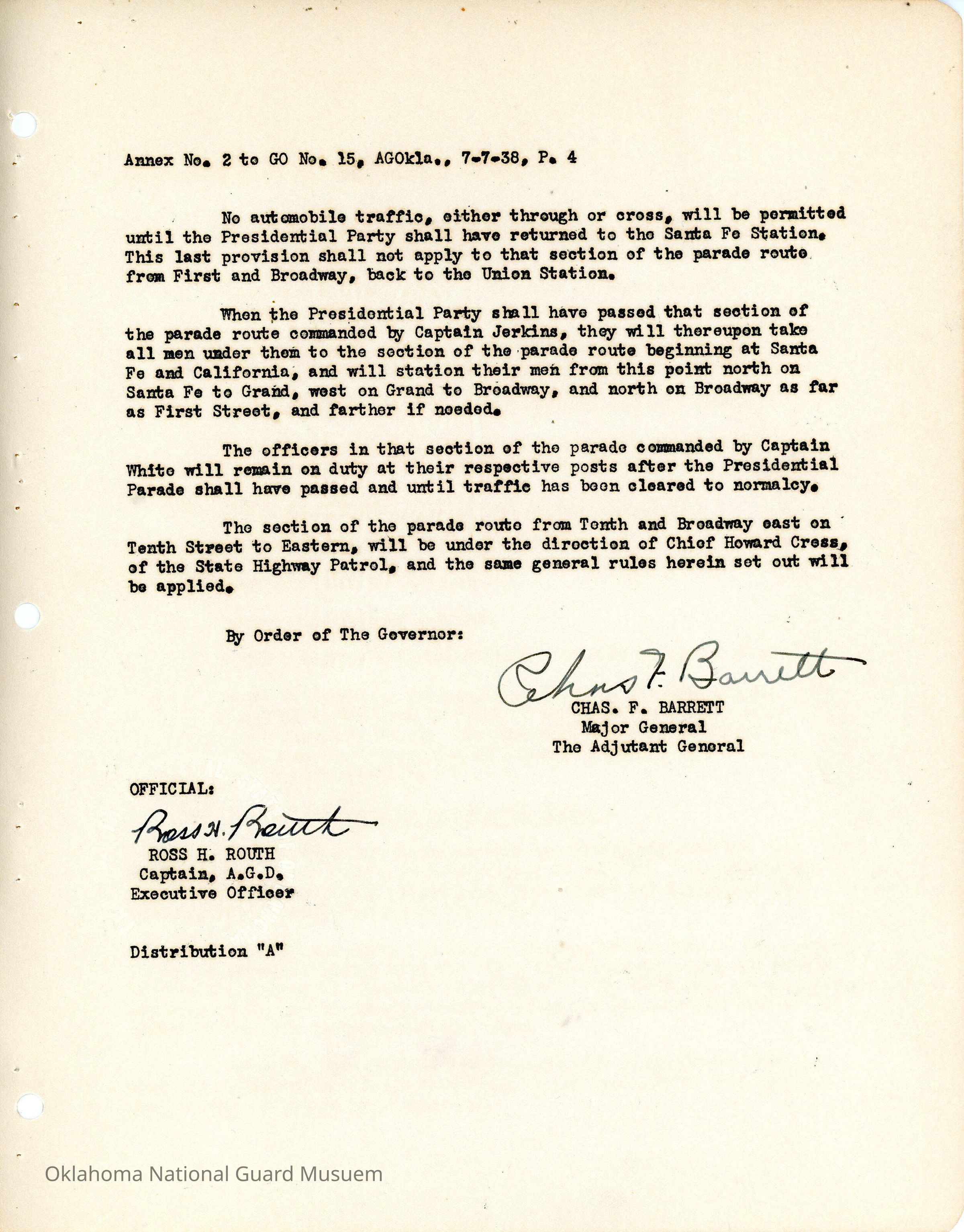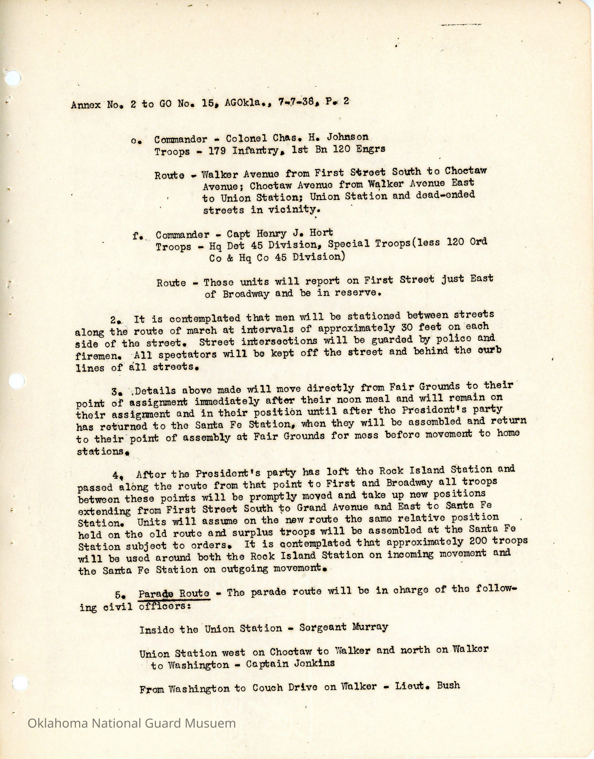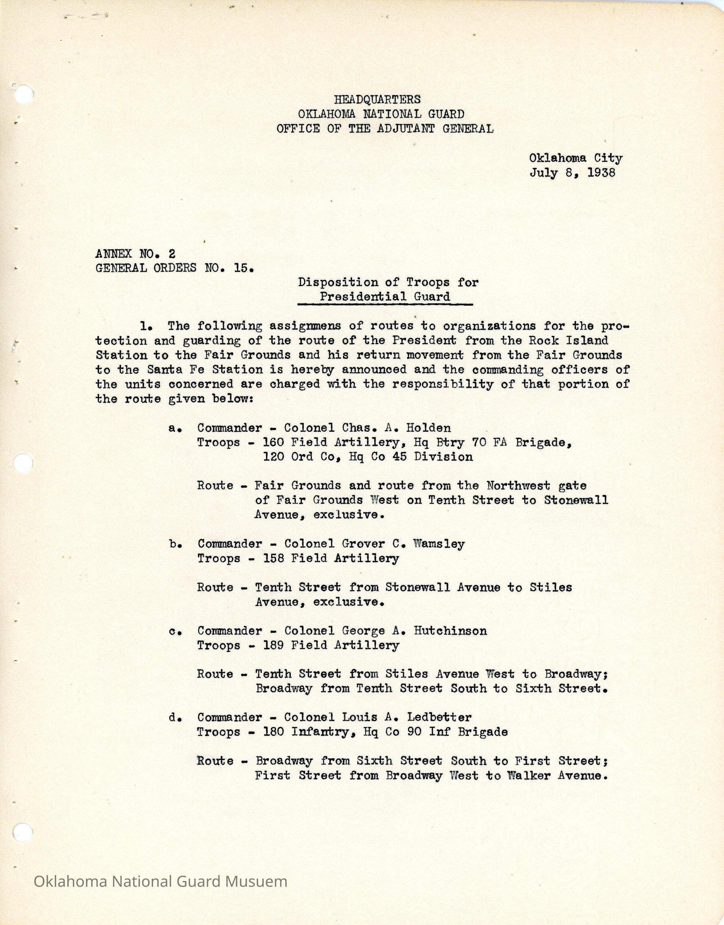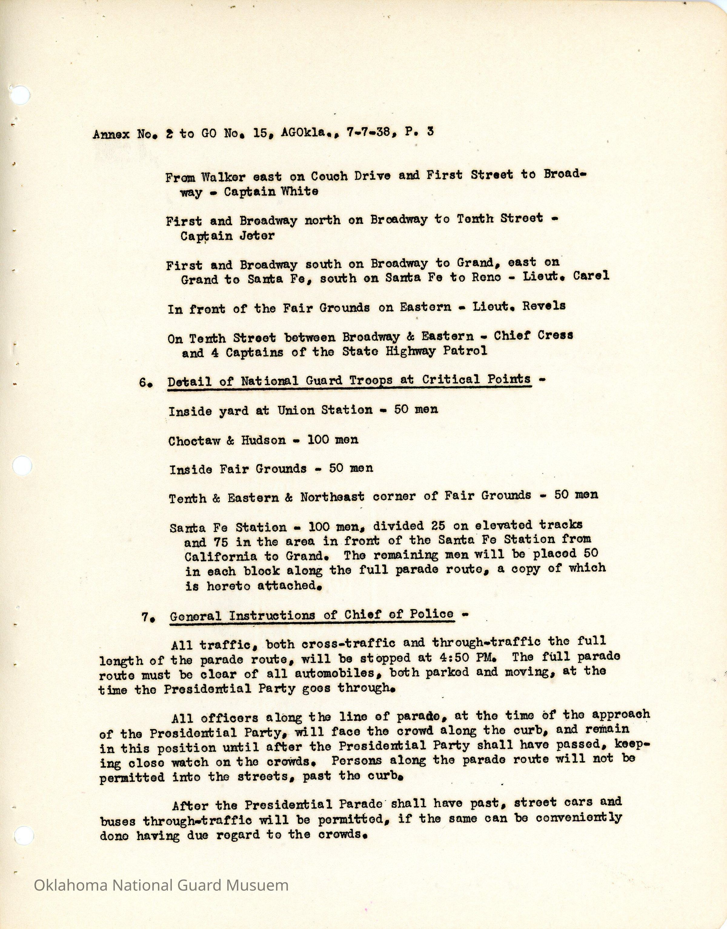 General Order #15 Annex 2 from Headquarters Adjutant General's Office in Oklahoma City. The order details the disposition of troops for protection of the president and the parade route that the men will guardDate(s) of Creation