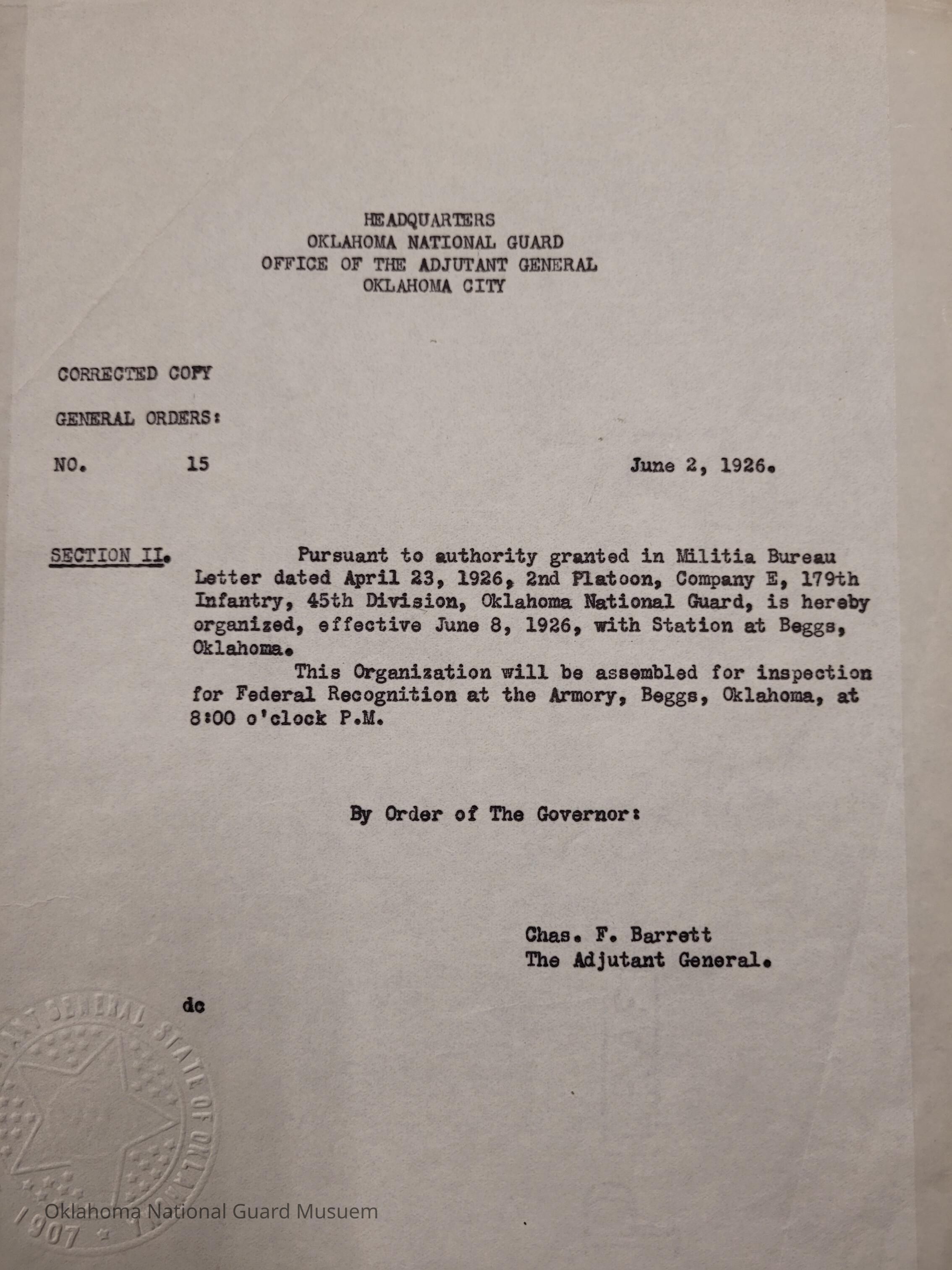 General Order #15 Corrected Copy from Headquarters Adjutant General's Office in Oklahoma City. The order organizes 2nd Platoon Company E 179th Infantry 45th Division in BeggsDate(s) of Creation
