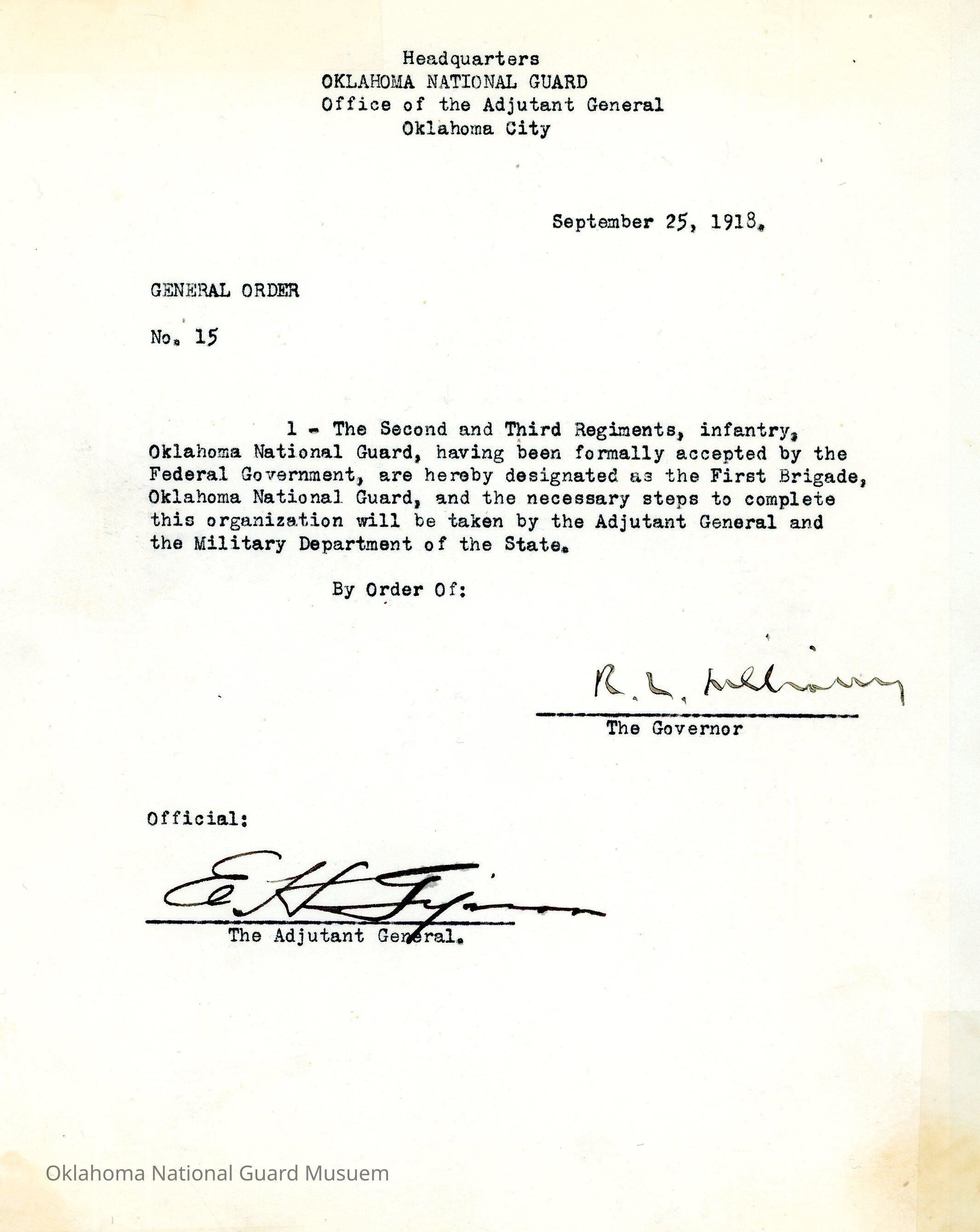 General Order #15 from Headquarters Adjutant General's Office in Oklahoma City. The order recognizes the Federal recognition of the Second and Third Regiments and are now designated as the First Brigade of the Oklahoma National Guard.Date(s) of Creation