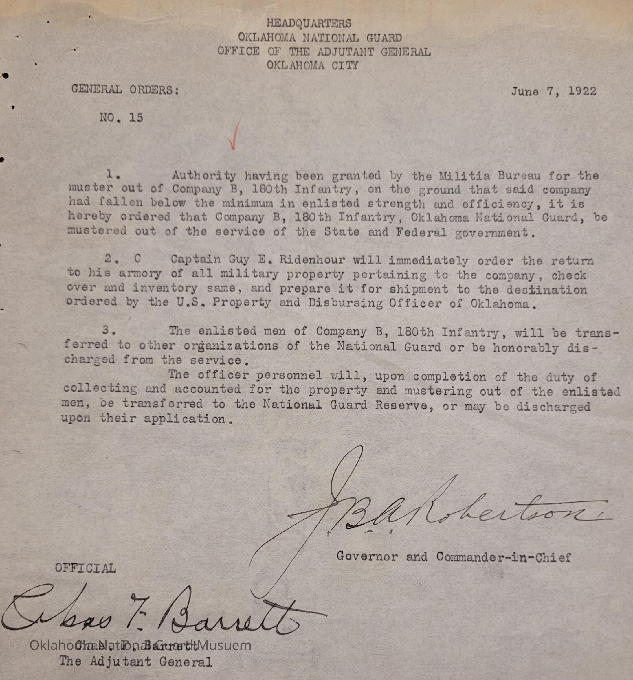 Adjutant General, Oklahoma City, Charles F. Barrett, James B.A. Robertson, 180th Infantry, Guy E. Ridenhour, Disband