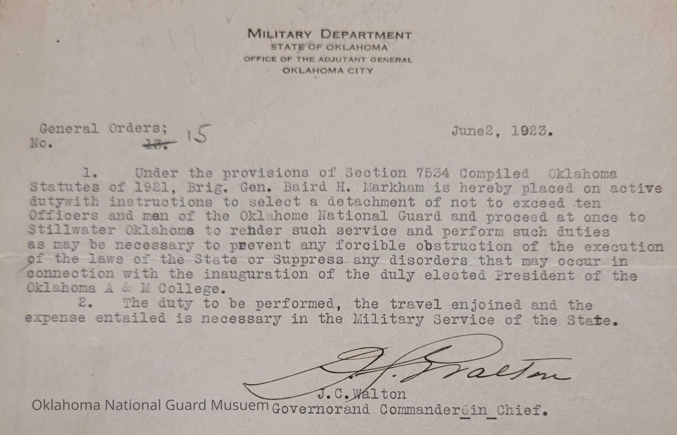 General Order #15 from Headquarters Adjutant General's Office in Oklahoma City. The order instructs Baird H. Markham to take ten men to Stillwater suppress and prevent any violation of state laws at the inauguration of the newly elected president of Oklahoma A&MDate(s) of Creation