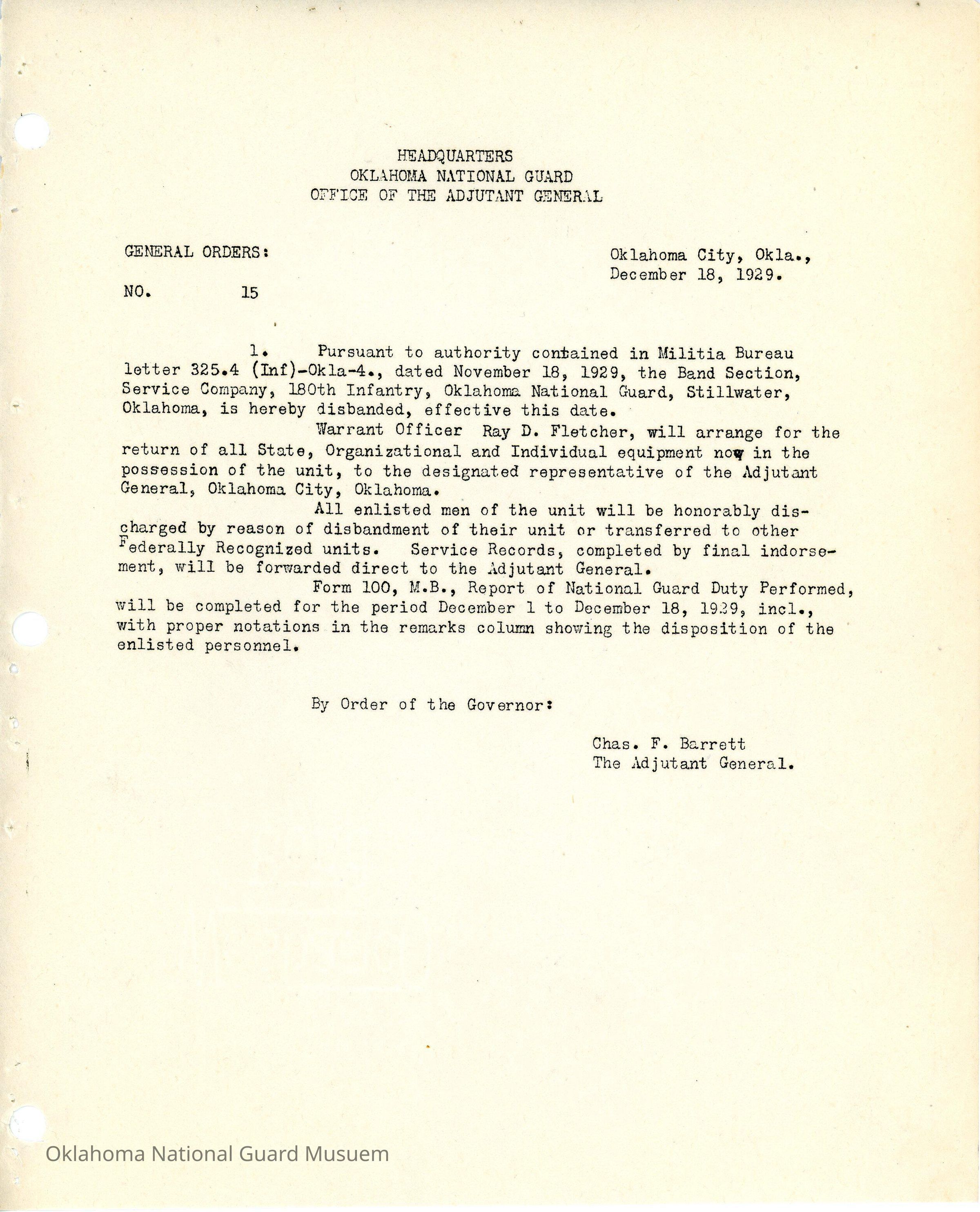 General Order #15 from Headquarters Adjutant General's Office in Oklahoma City. The order disbands the Band Section 180th Infantry stationed in StillwaterDate(s) of Creation