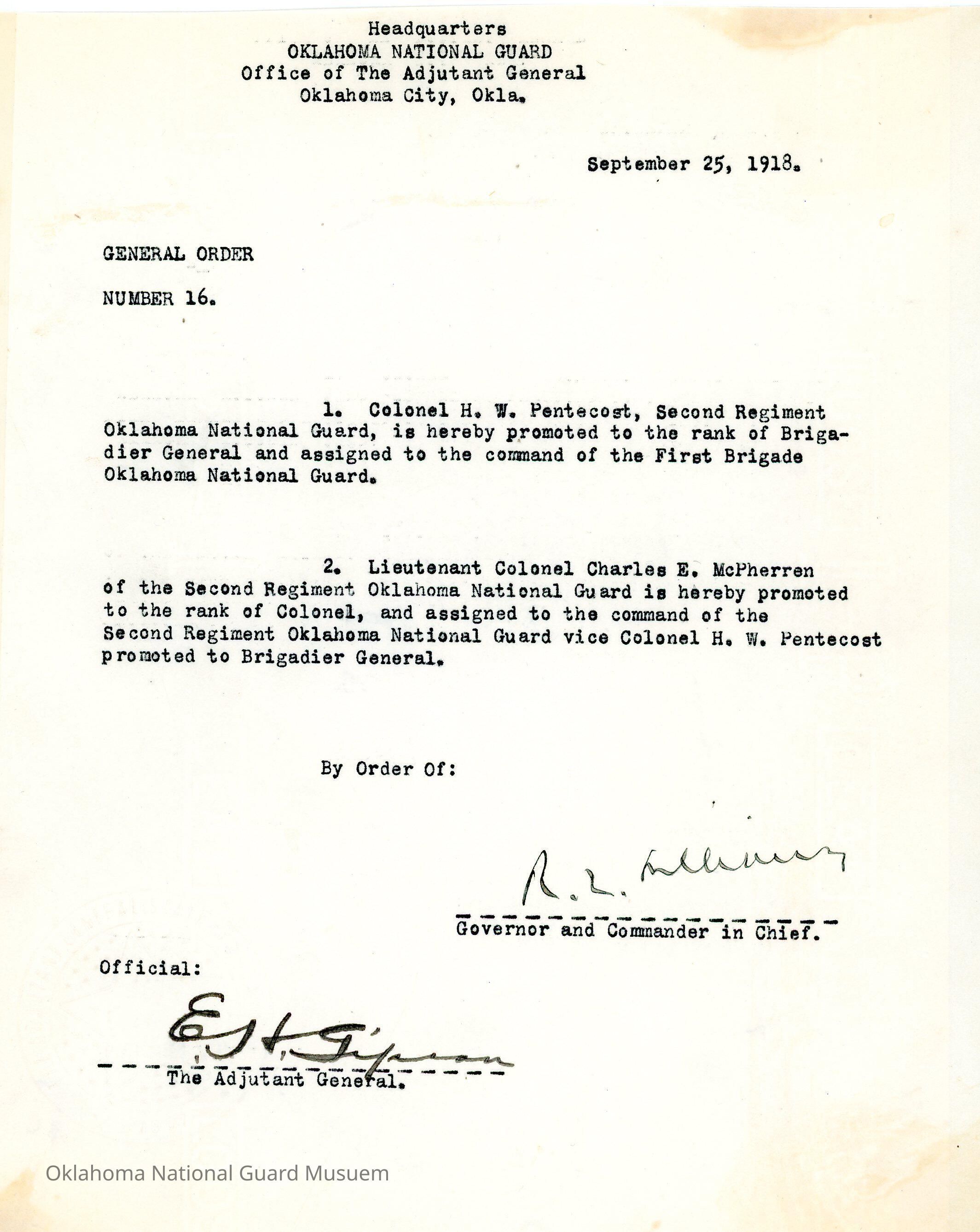 General Order #16 from Headquarters Adjutant General's Office in Oklahoma City. The order promotes H. W. Pentecost to Brigadier General and assigns him to command the First Brigade. It also promotes Charles E. McPherren to Colonel and assigns him to command the Second Regiment Oklahoma National Guard.Date(s) of Creation