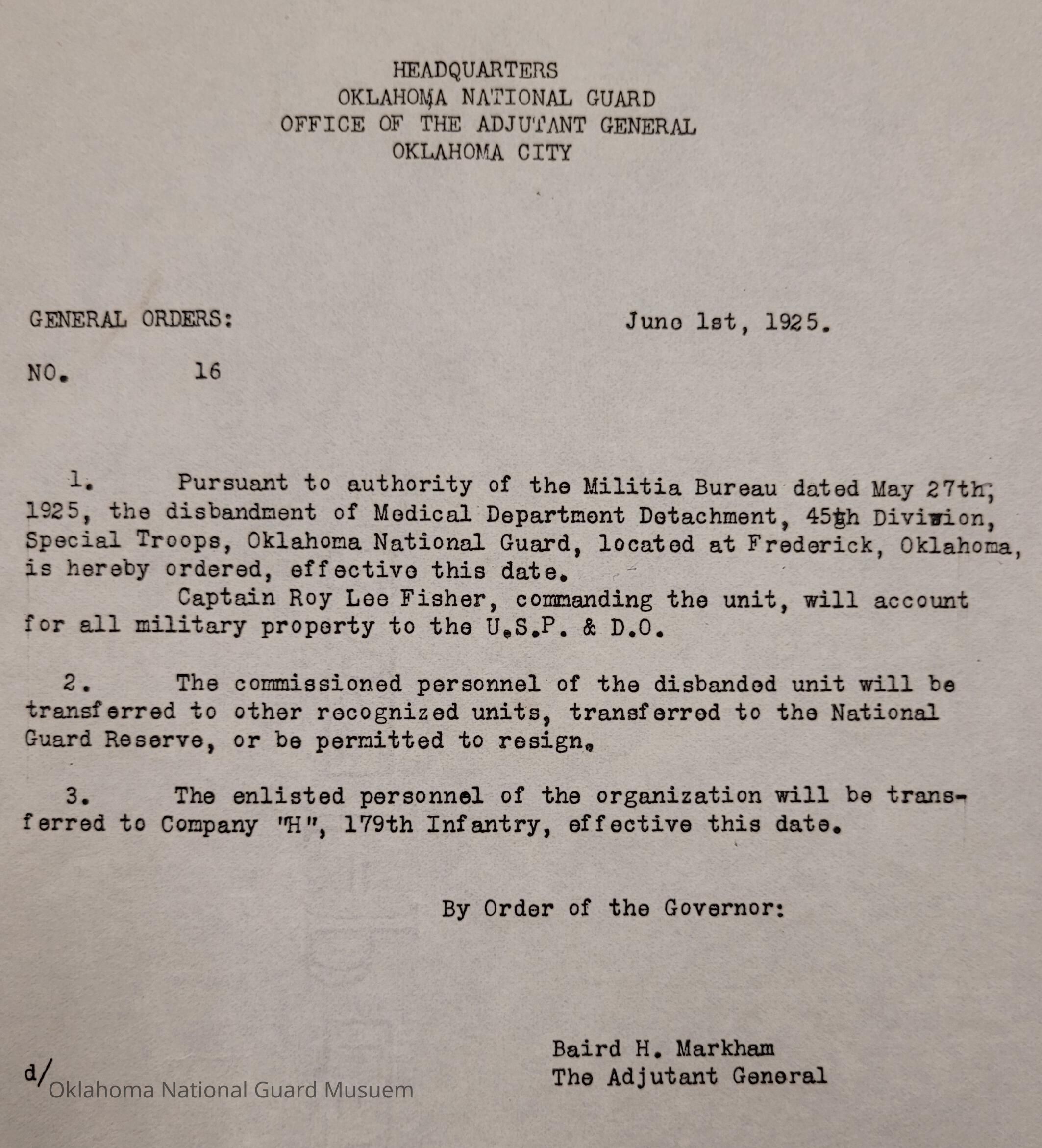 Adjutant General, Oklahoma City, Baird H. Markham, Disband, Medical Department Detachment, 45th Division, Special Troops, Frederick, 179th Infantry, Roy Lee Fisher