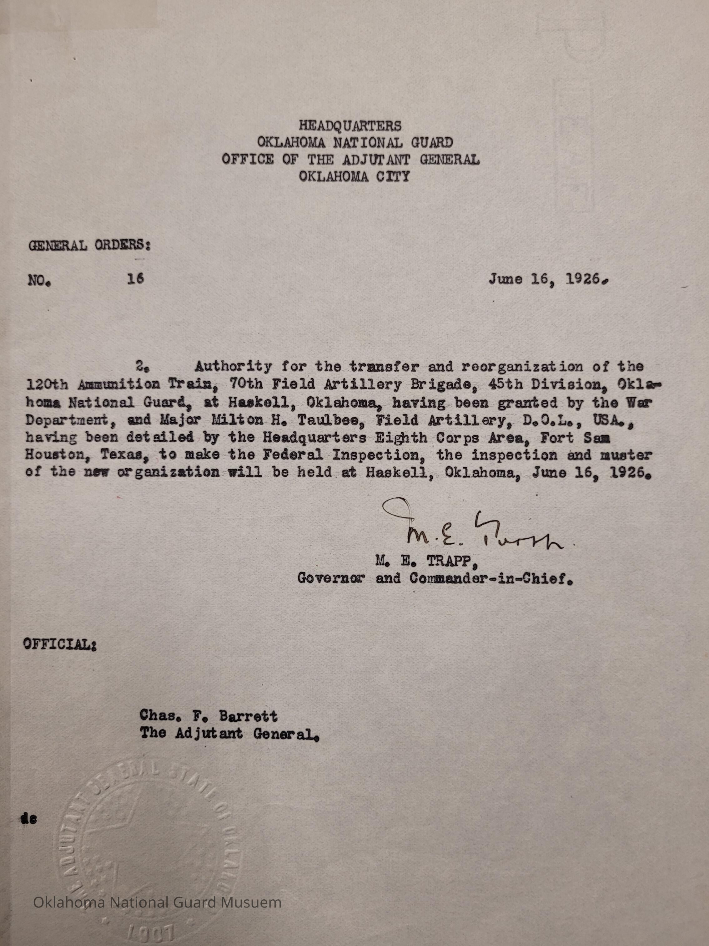General Order #16 from Headquarters Adjutant General's Office in Oklahoma City. The order details an inspection of the 120th Ammunition Train 70th Field Artillery Brigade 45th Division by Milton H. TaulbeeDate(s) of Creation