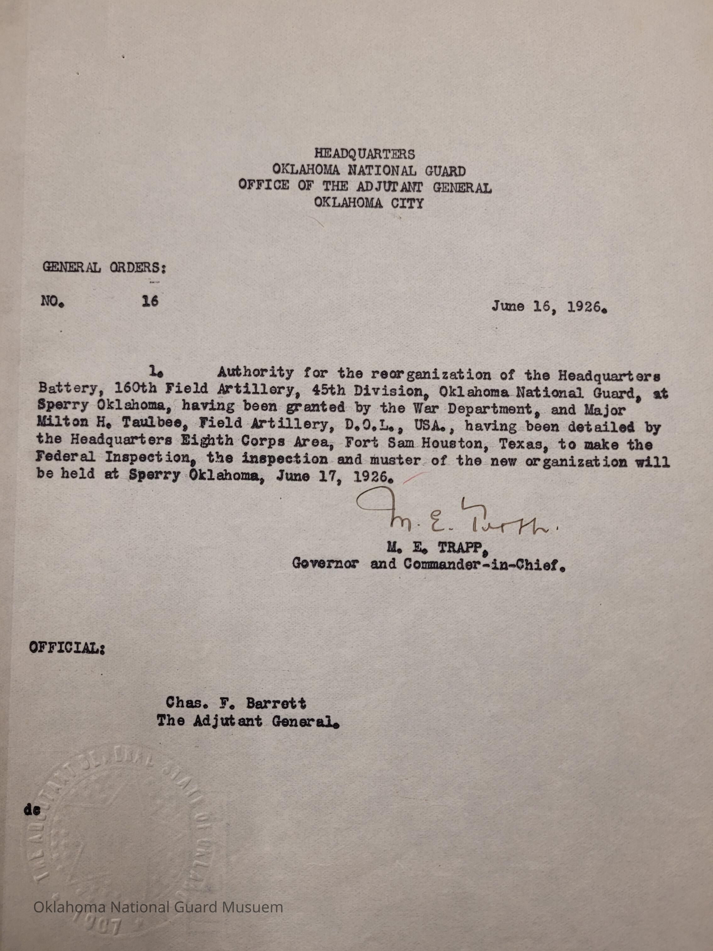 Adjutant General, Oklahoma City, Martin E. Trapp, Charles F. Barrett, Inspection, 160th Field Artillery, 45th Division, Sperry, Milton H. Taulbee, War Department, Eighth Corps Area, Fort Sam Houston, Texas
