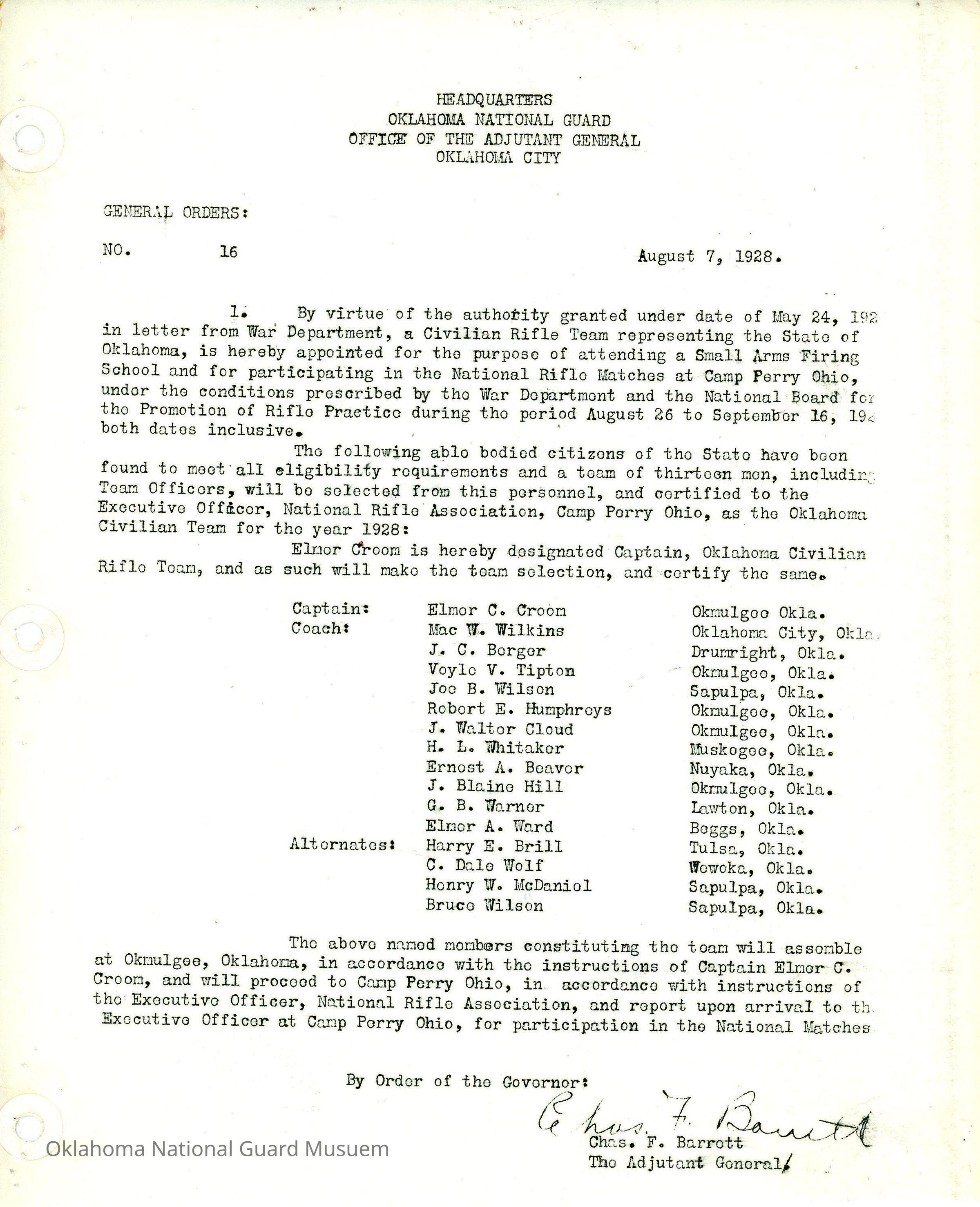 General Order #16 from Headquarters Adjutant General's Office in Oklahoma City. The order lists the members of the Civilian Rifle Team representing Oklahoma at Camp Perry, Ohio during the National Rifle matchesDate(s) of Creation