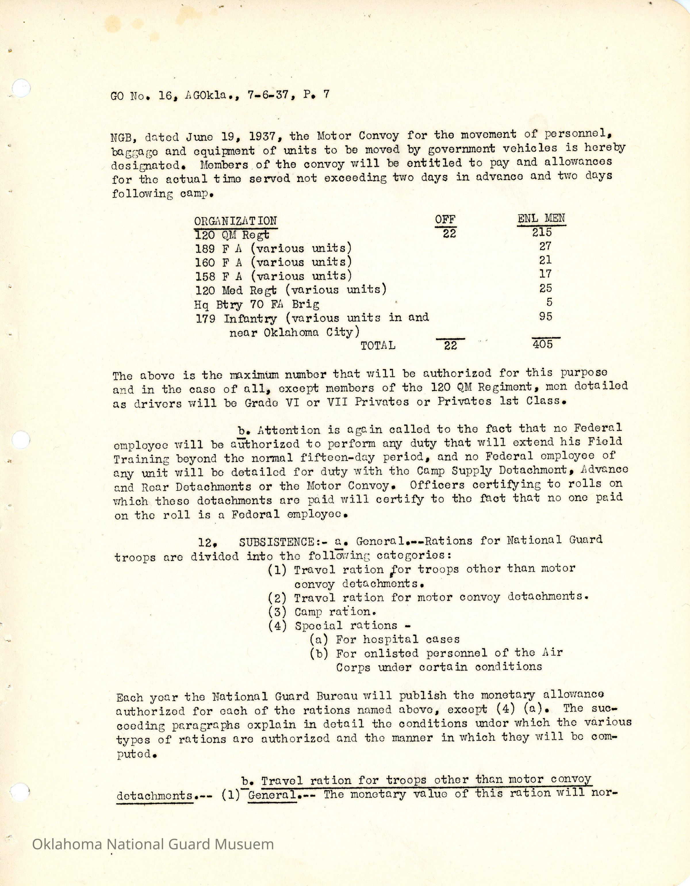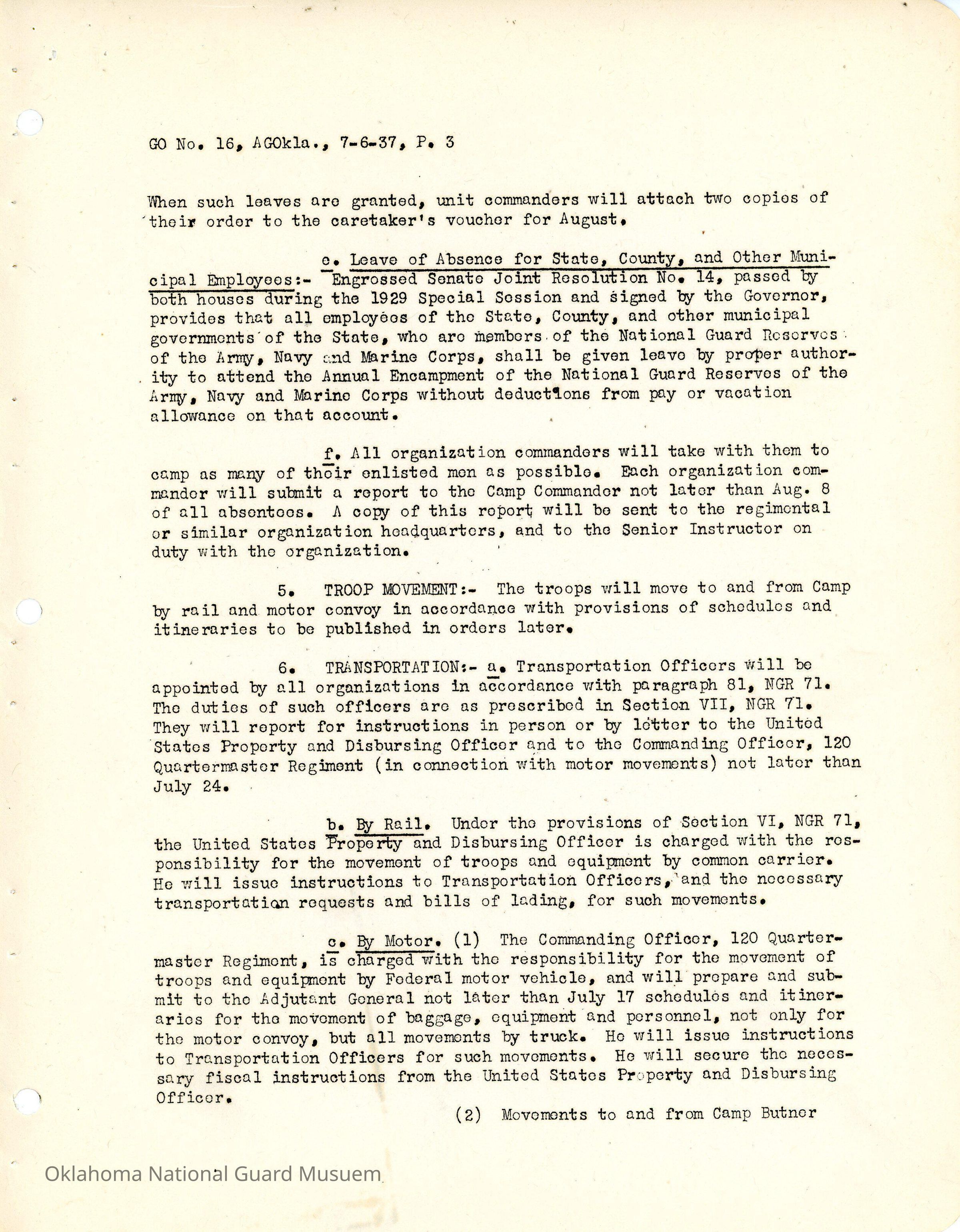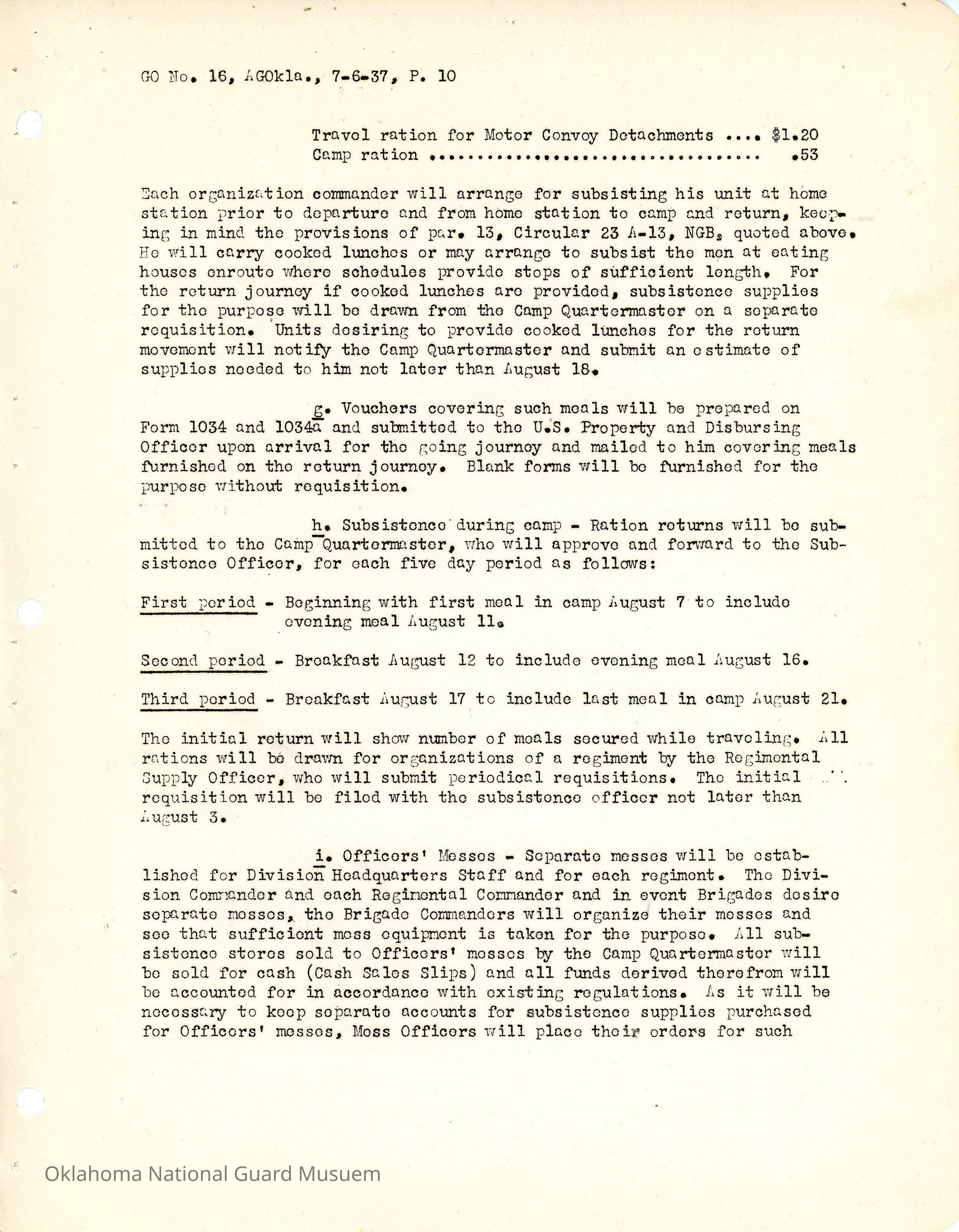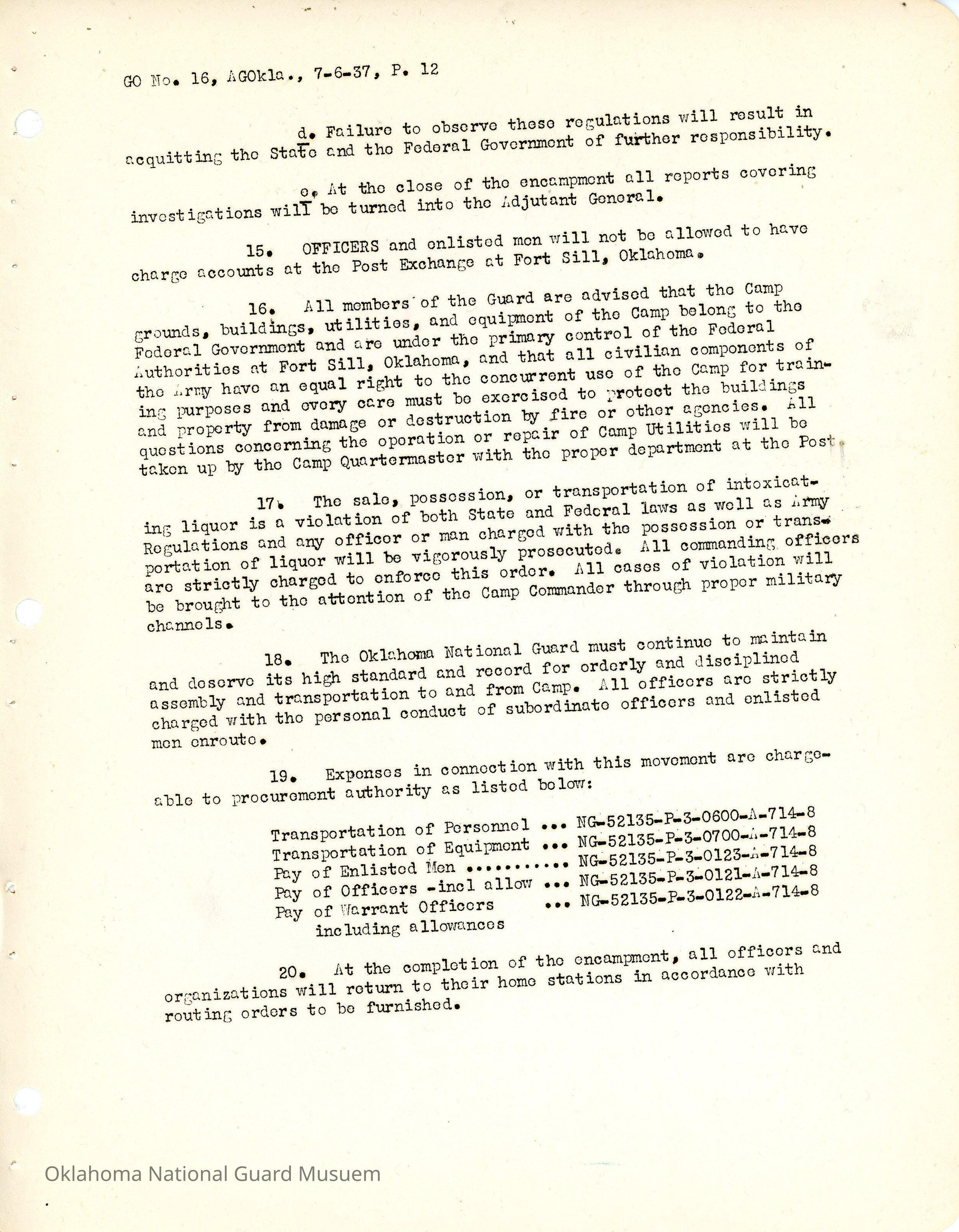 General Order #16 from Headquarters Adjutant General's Office in Oklahoma City. The order details the attendance, transportation, subsistence, organization, rations, and pay for the Annual Encampment at Fort SillDate(s) of Creation