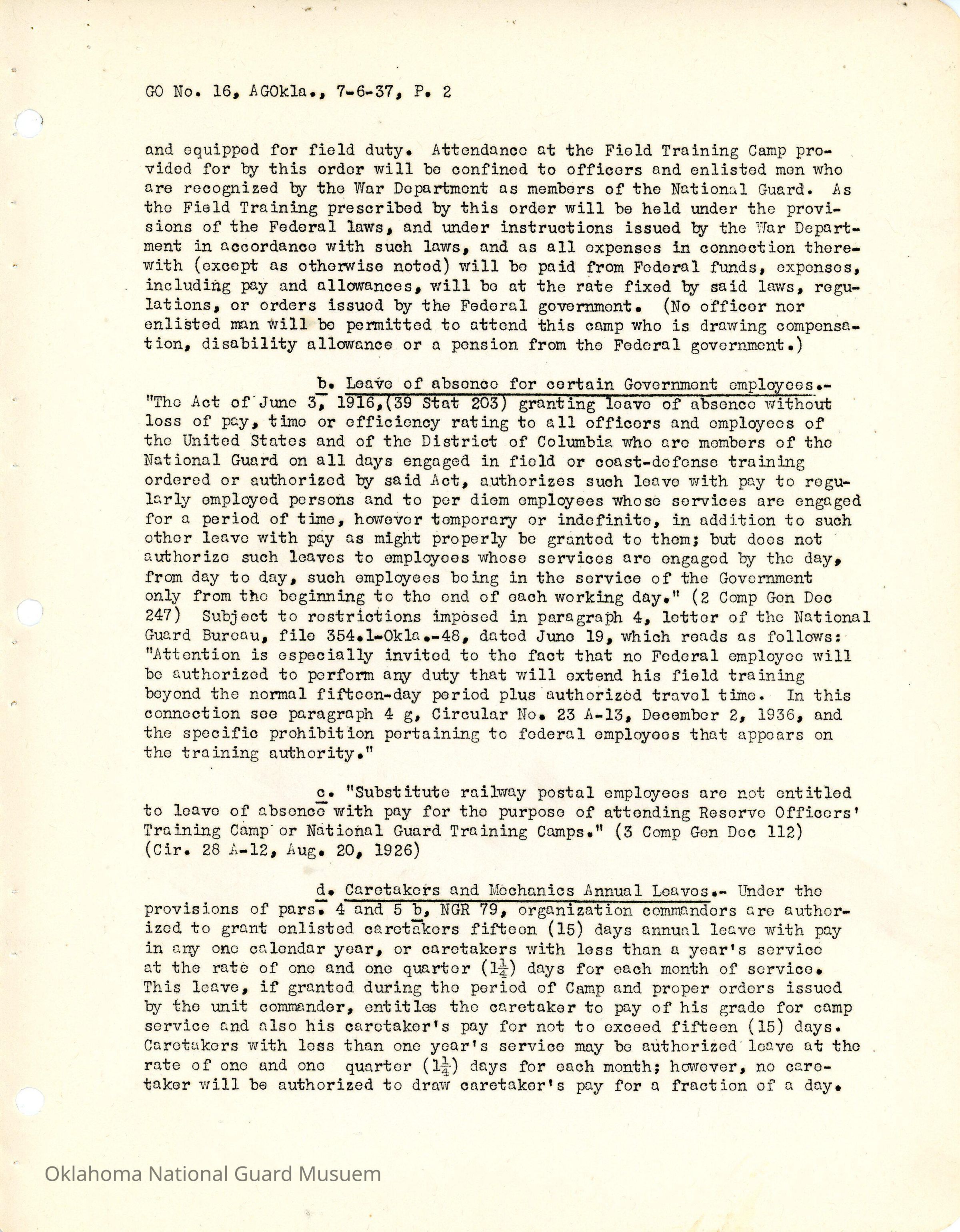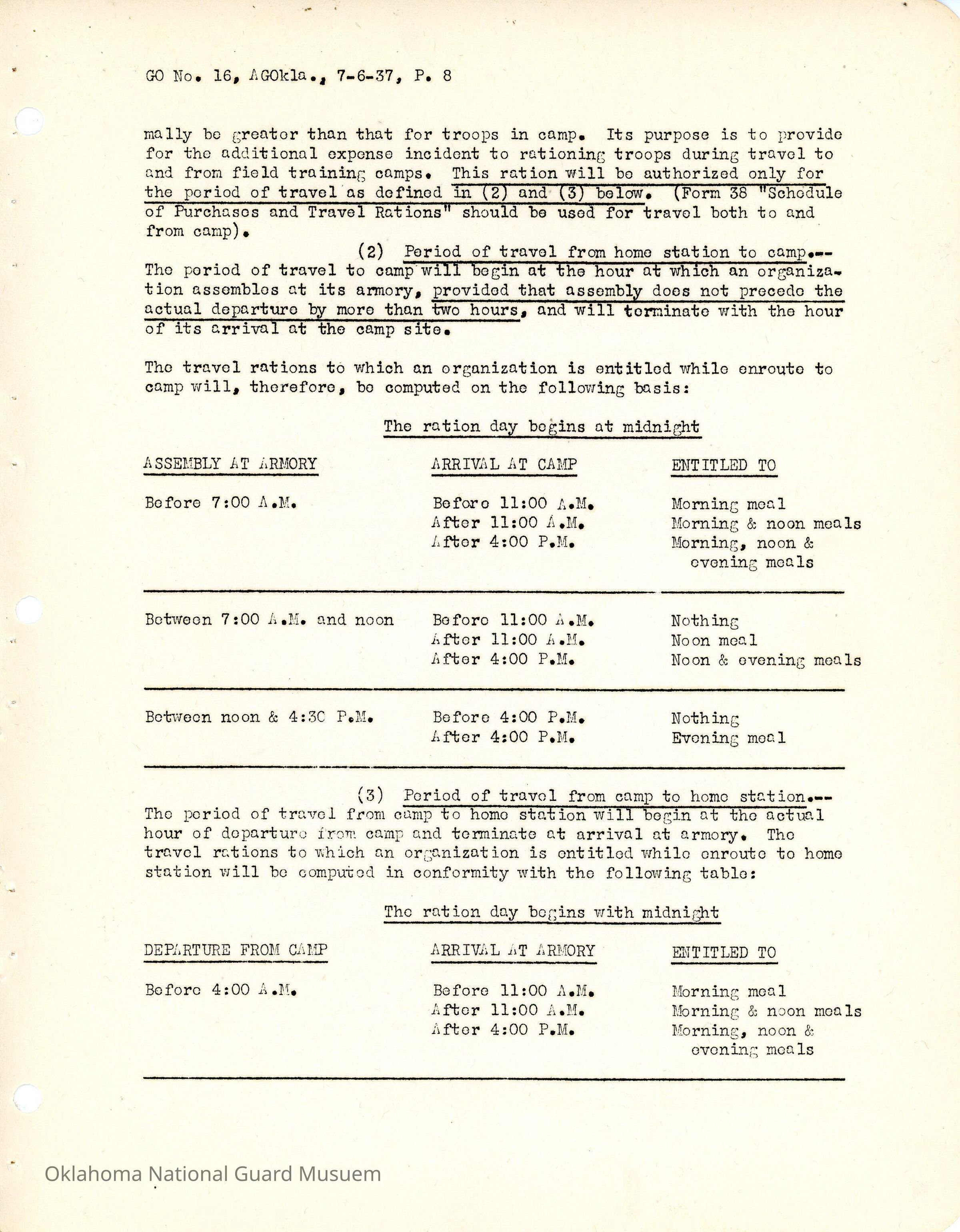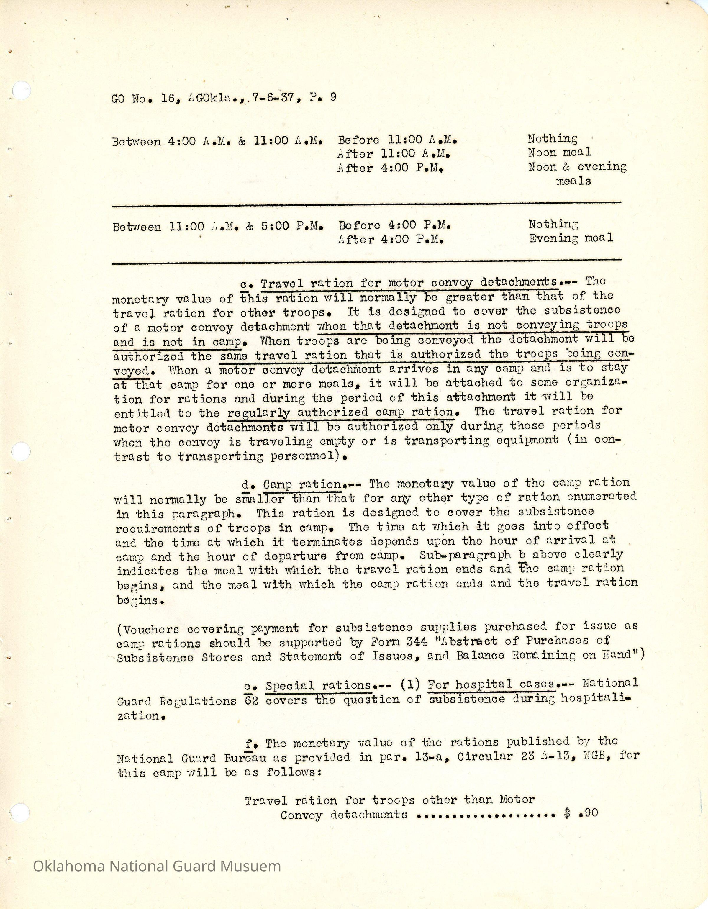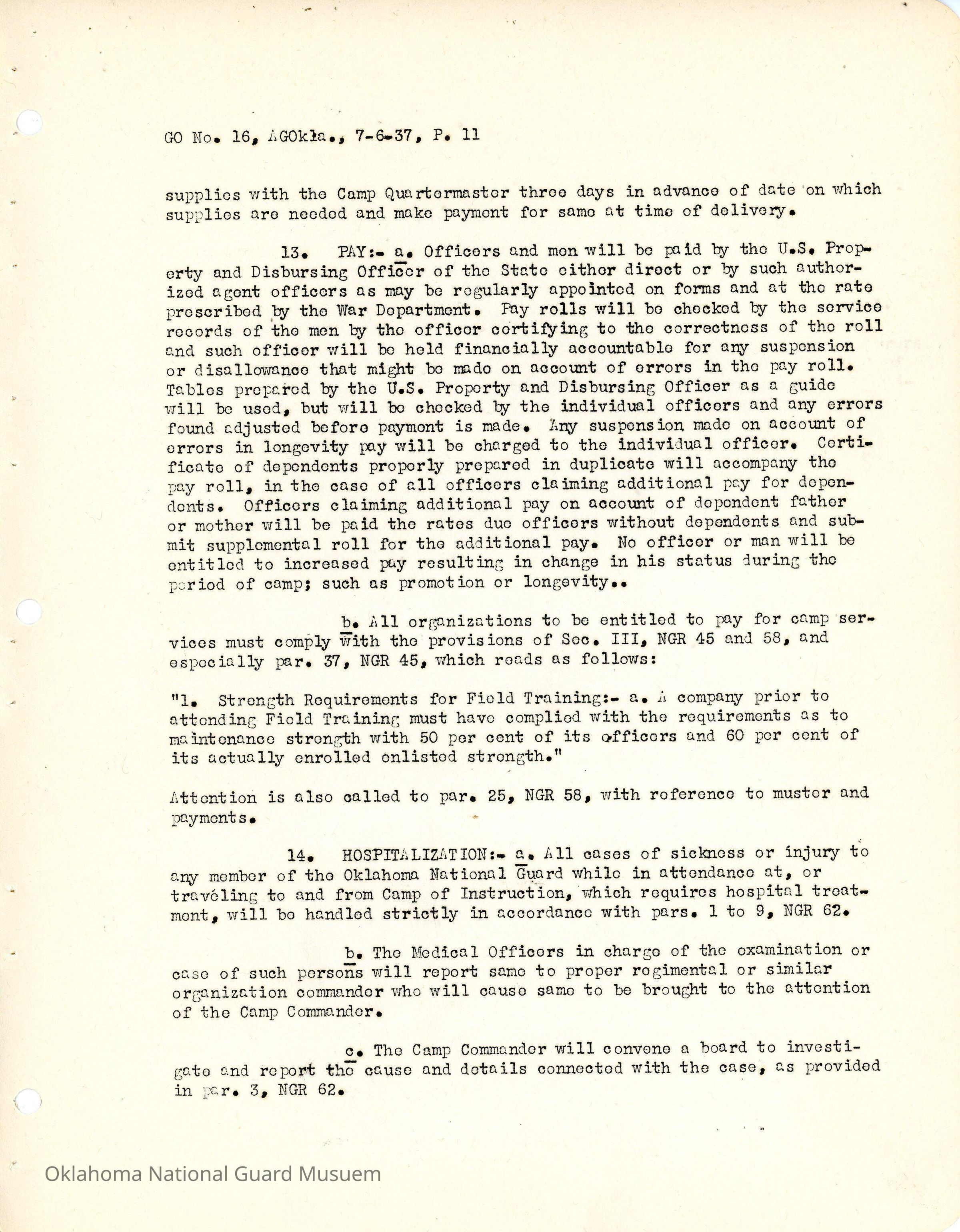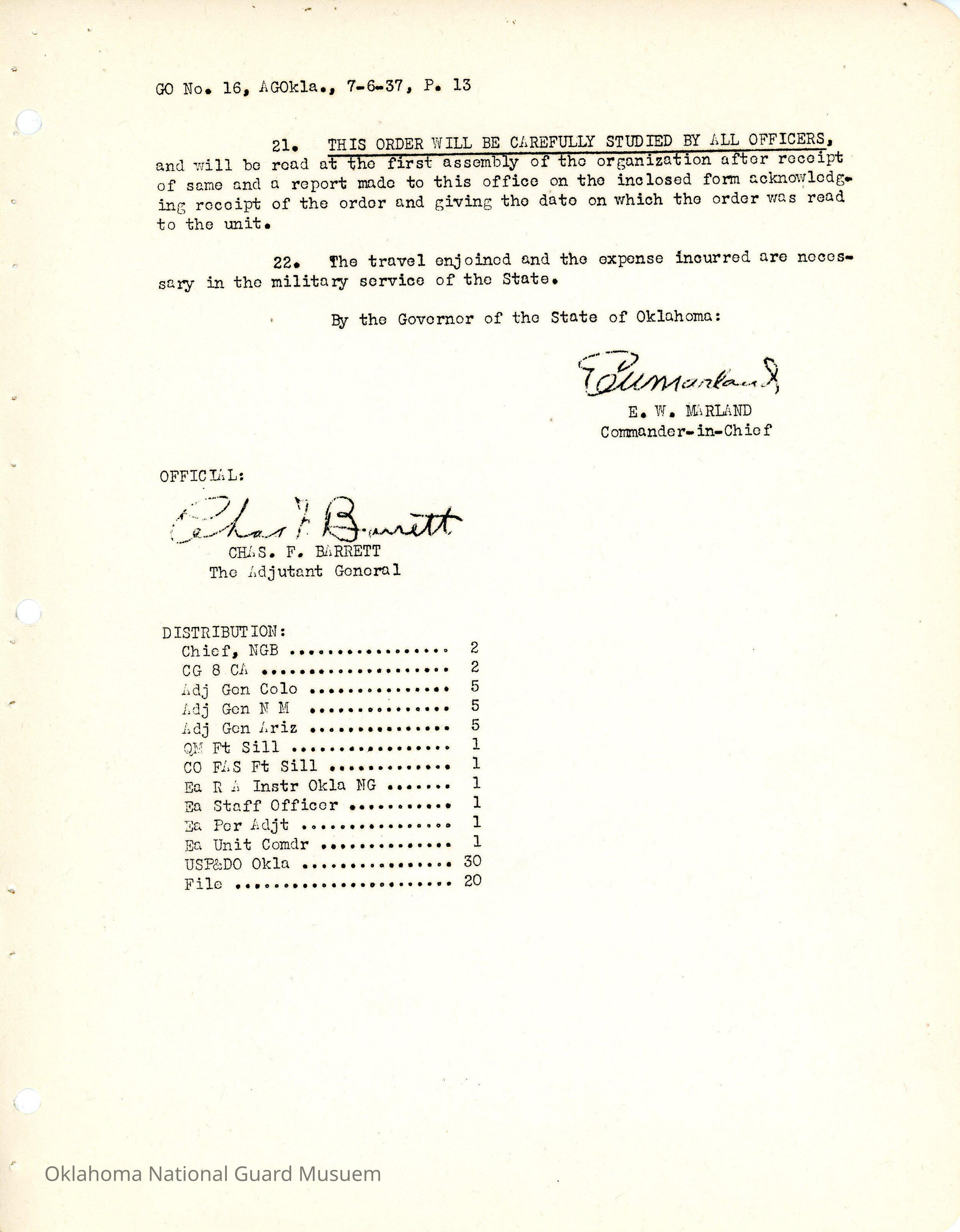 General Order #16 from Headquarters Adjutant General's Office in Oklahoma City. The order details the attendance, transportation, subsistence, organization, rations, and pay for the Annual Encampment at Fort SillDate(s) of Creation