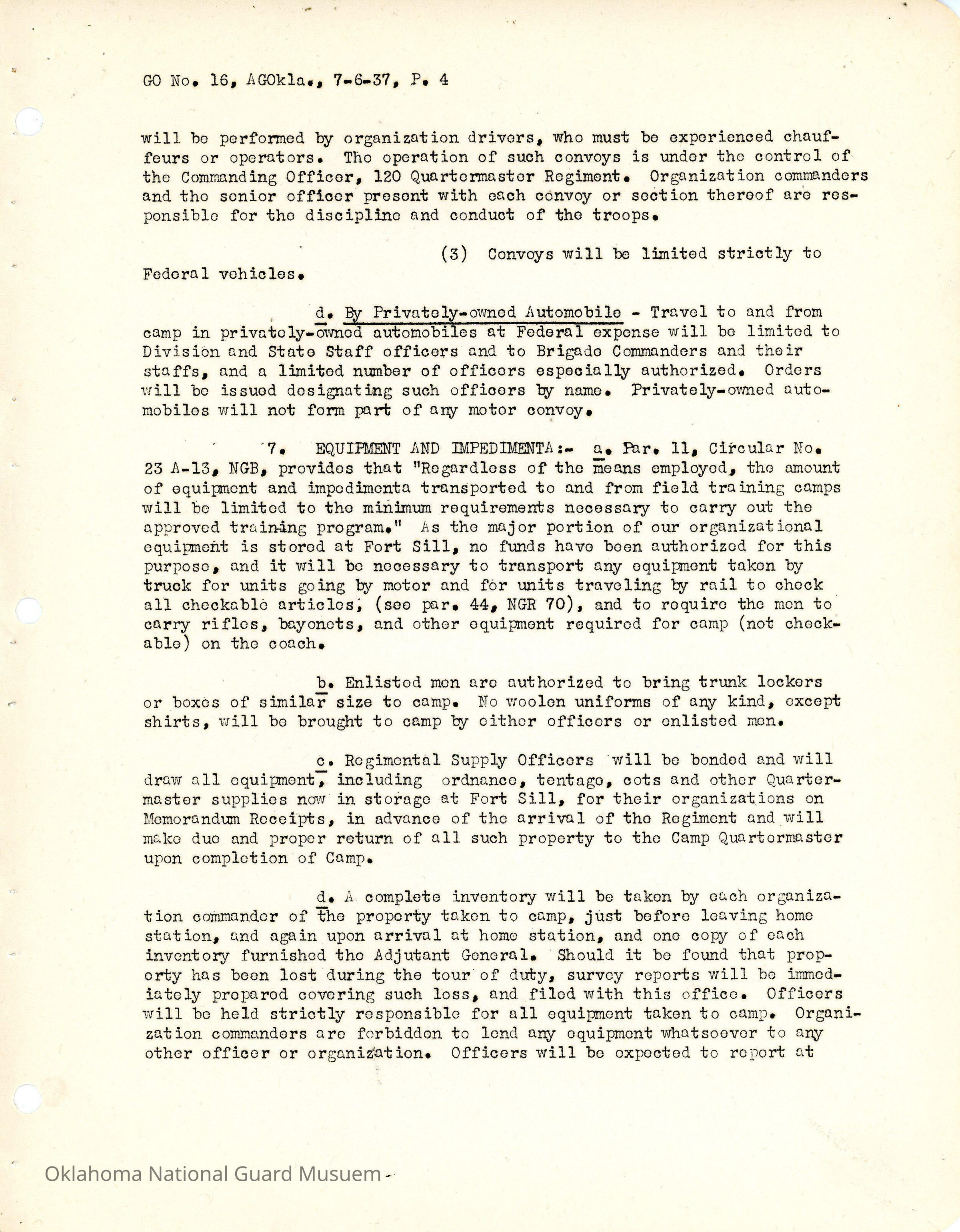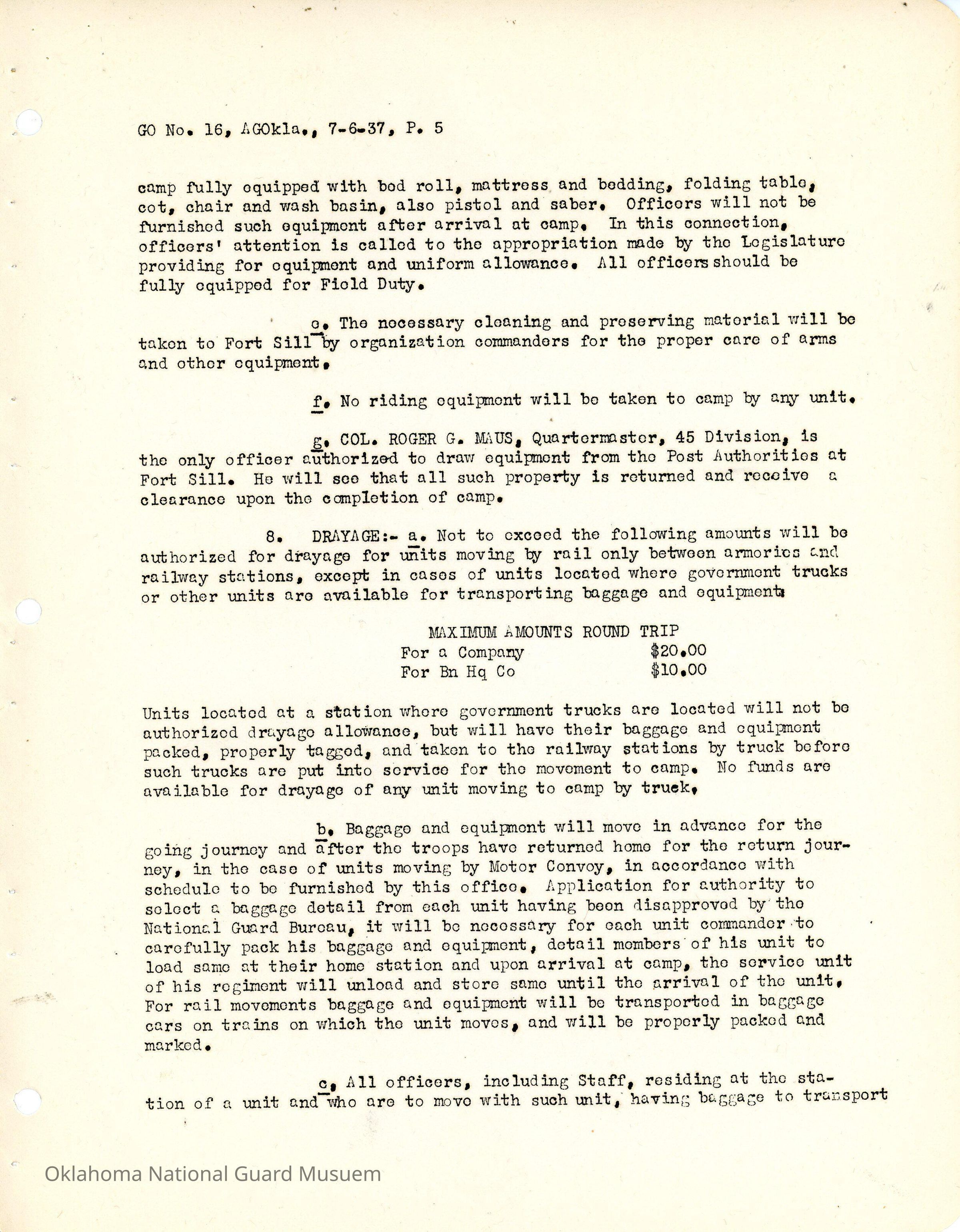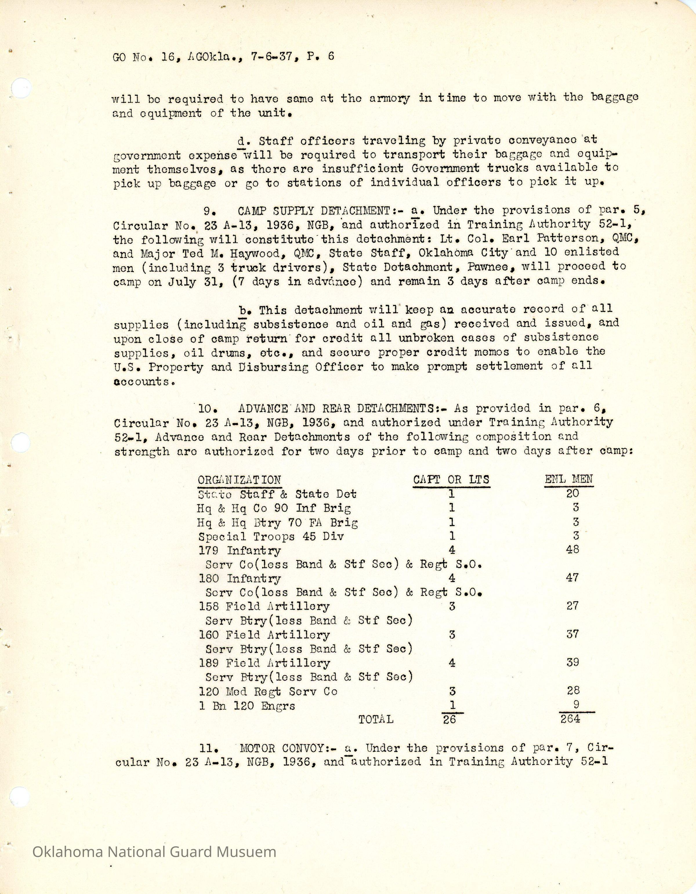 Adjutant General, Oklahoma City, Charles F. Barrett, E.W. Marland, Fort Sill, Camp General Henry W. Butner, Henry W. Butner, Annual Encampment, Rex Bolend, 120th Medical Regiment, Roger G. Maus, 120th Quartermaster Regiment, Earl Patterson, Clive E. Murray, William G. Stigler, Charles W. Daley, Phillip S. Donnell, 45th Signal Company, Charles D. Keller, Attendance, Transportation, Camp Supply Detachment, Advance Detachment, Rear Detachment, 90th Infantry Brigade, 70th Field Artillery Brigade, 179th Infantry, 180th Infantry, 158th Field Artillery, 160th Field Artillery, 189th Field Artillery, 120th Medical Regiment, 120th Engineers, Subsistence, Rations, Pay