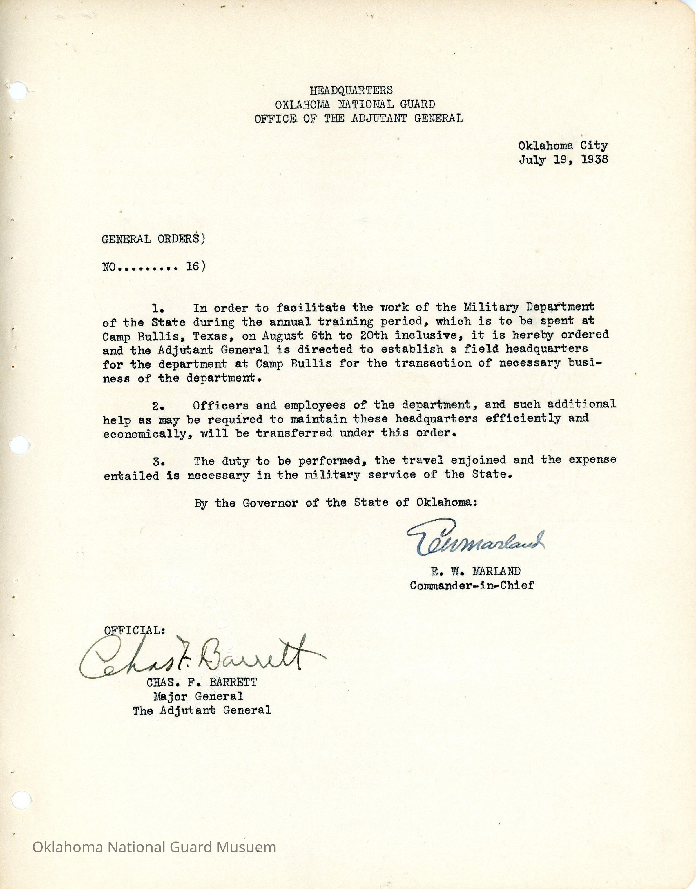 General Order #16 from Headquarters Adjutant General's Office in Oklahoma City. The order grants permission to establish a temporary headquarters at Camp Bullis, Texas during the annual encampmentDate(s) of Creation