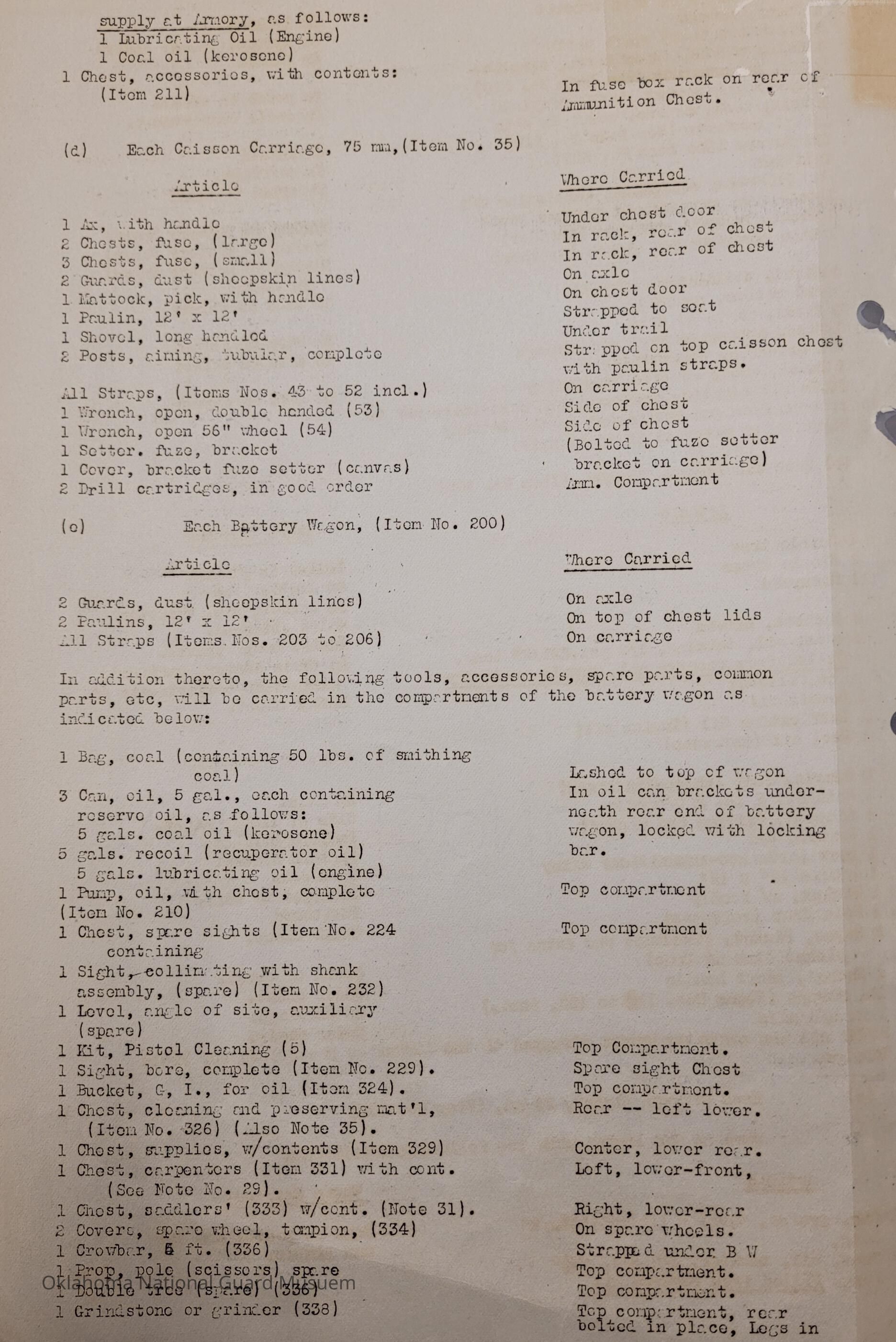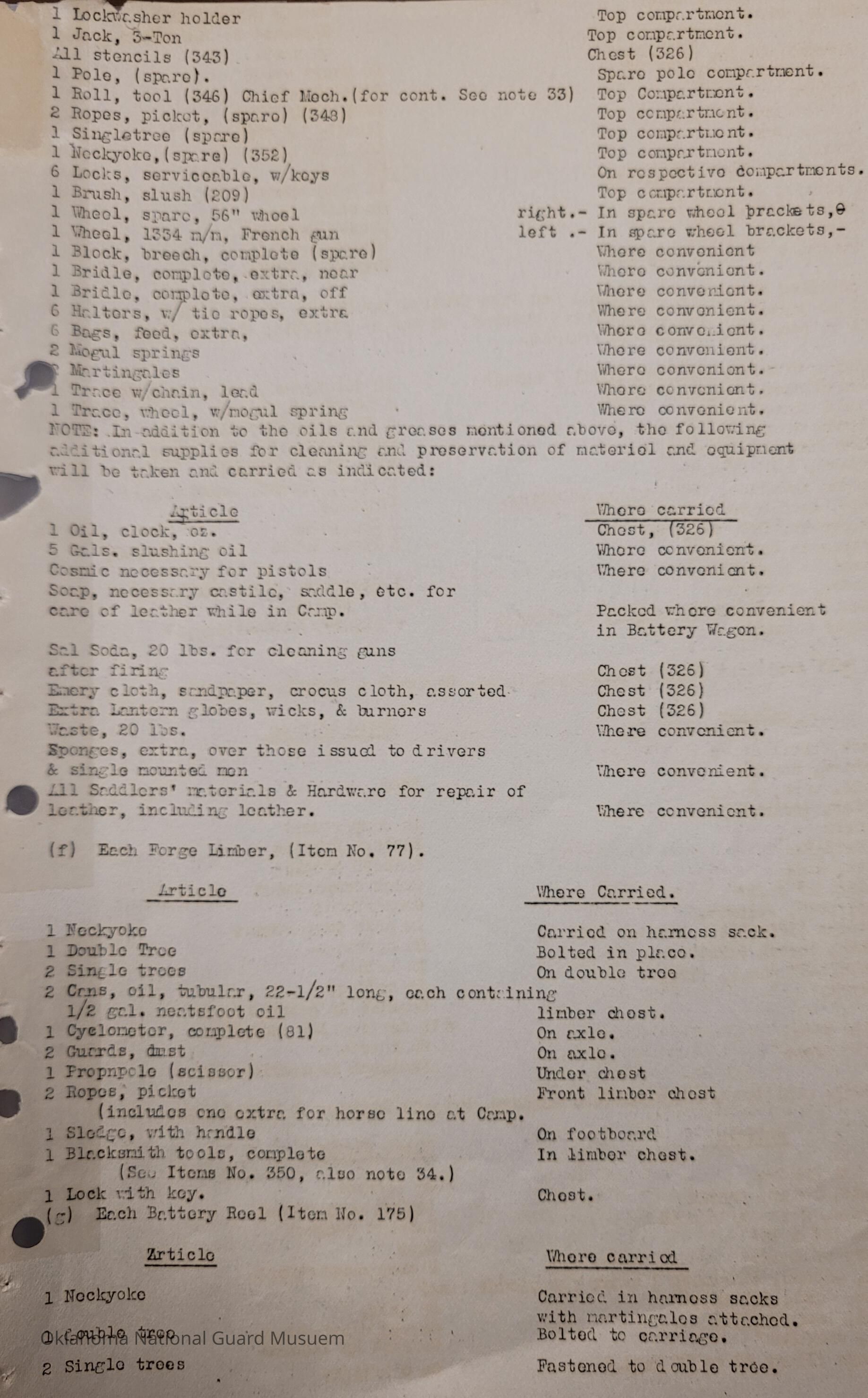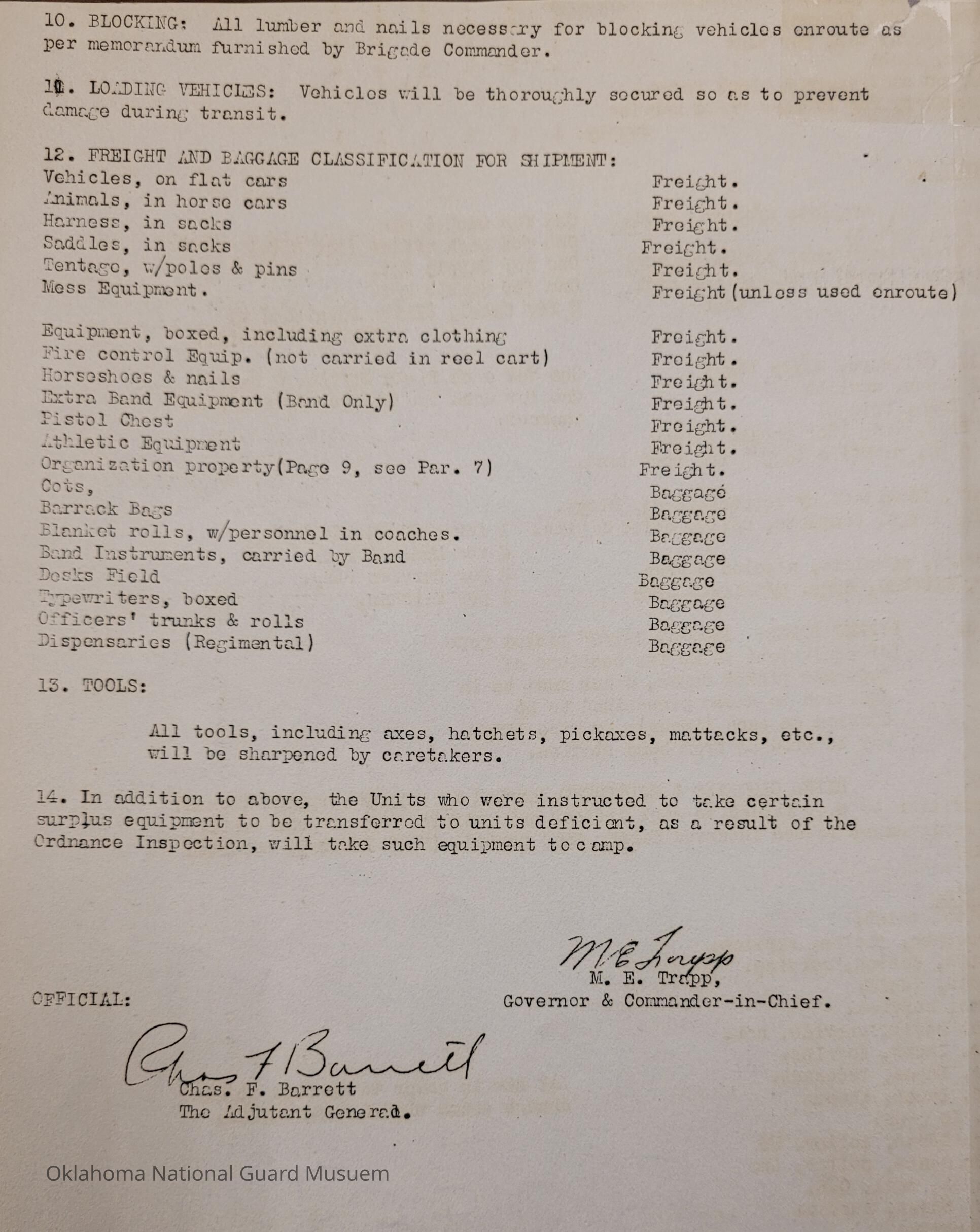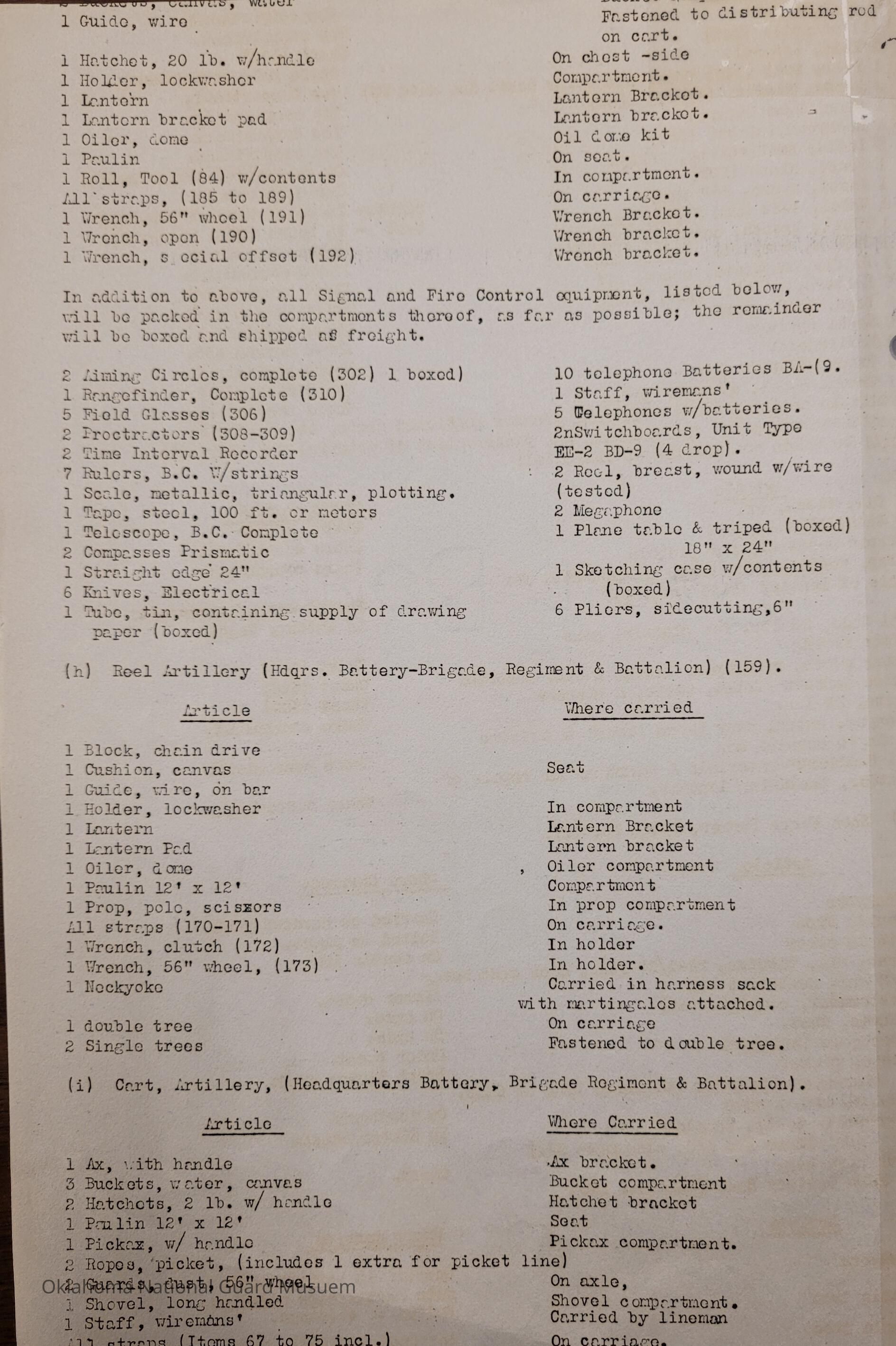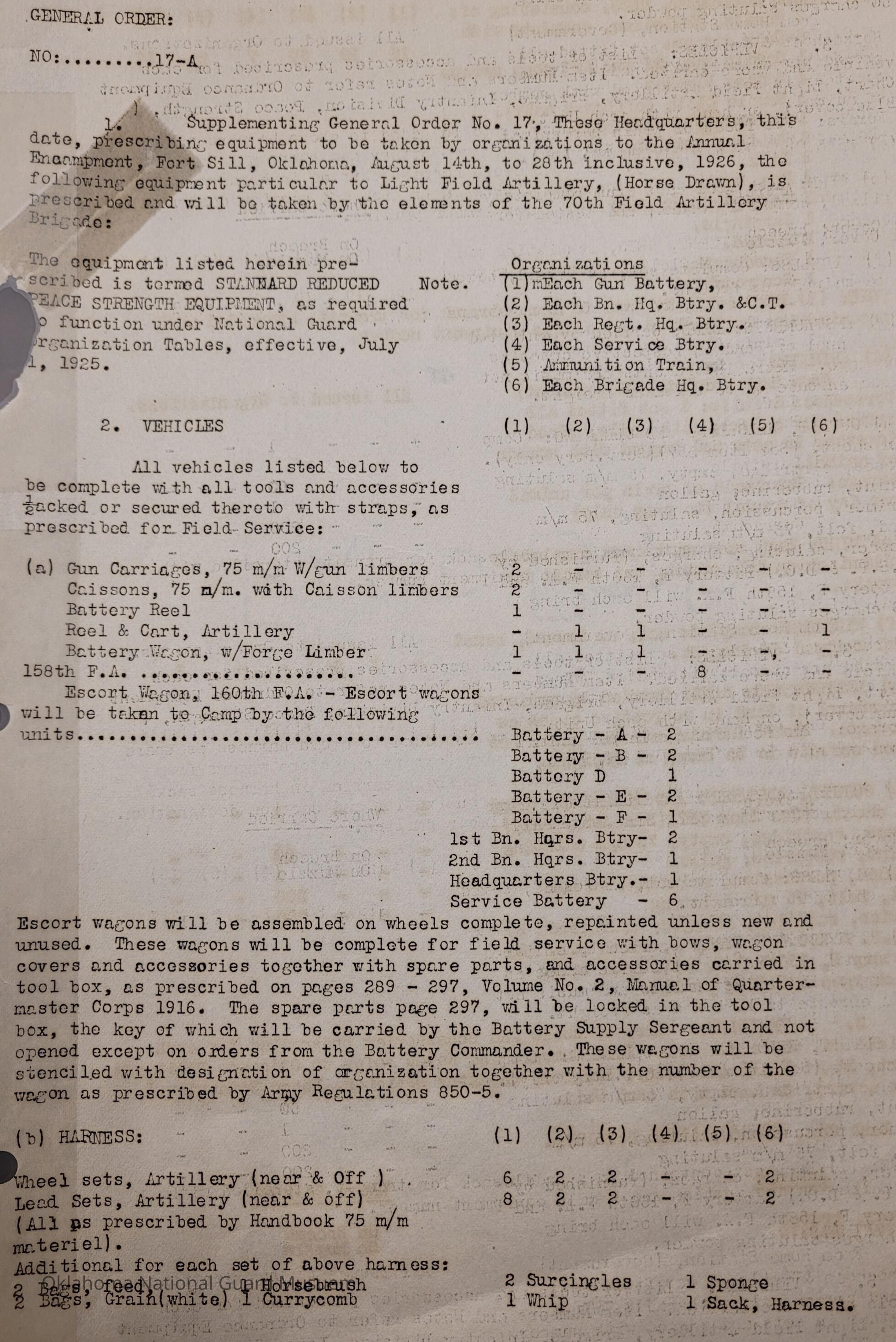 General Order #17-A from Headquarters Adjutant General's Office in Oklahoma City. The order supplements General Order 17 and details what equipment, particular to Light Field Artillery, should be taken to the annual encampmentDate(s) of Creation