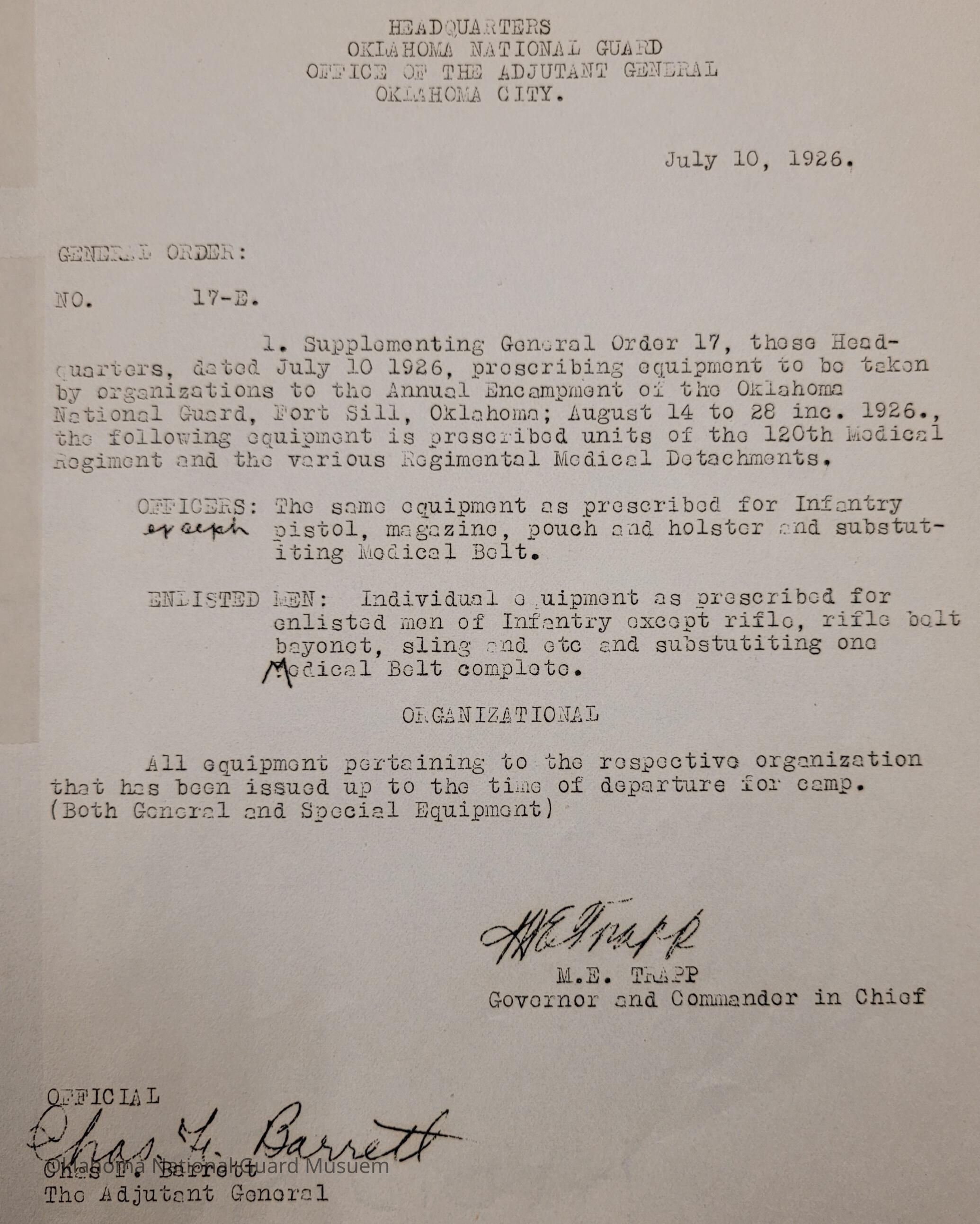 General Order #17-E from Headquarters Adjutant General's Office in Oklahoma City. The order supplements General Order 17 and details what equipment, particular to the officers of the 120th Medical Regiment, should be taken to the annual encampmentDate(s) of Creation