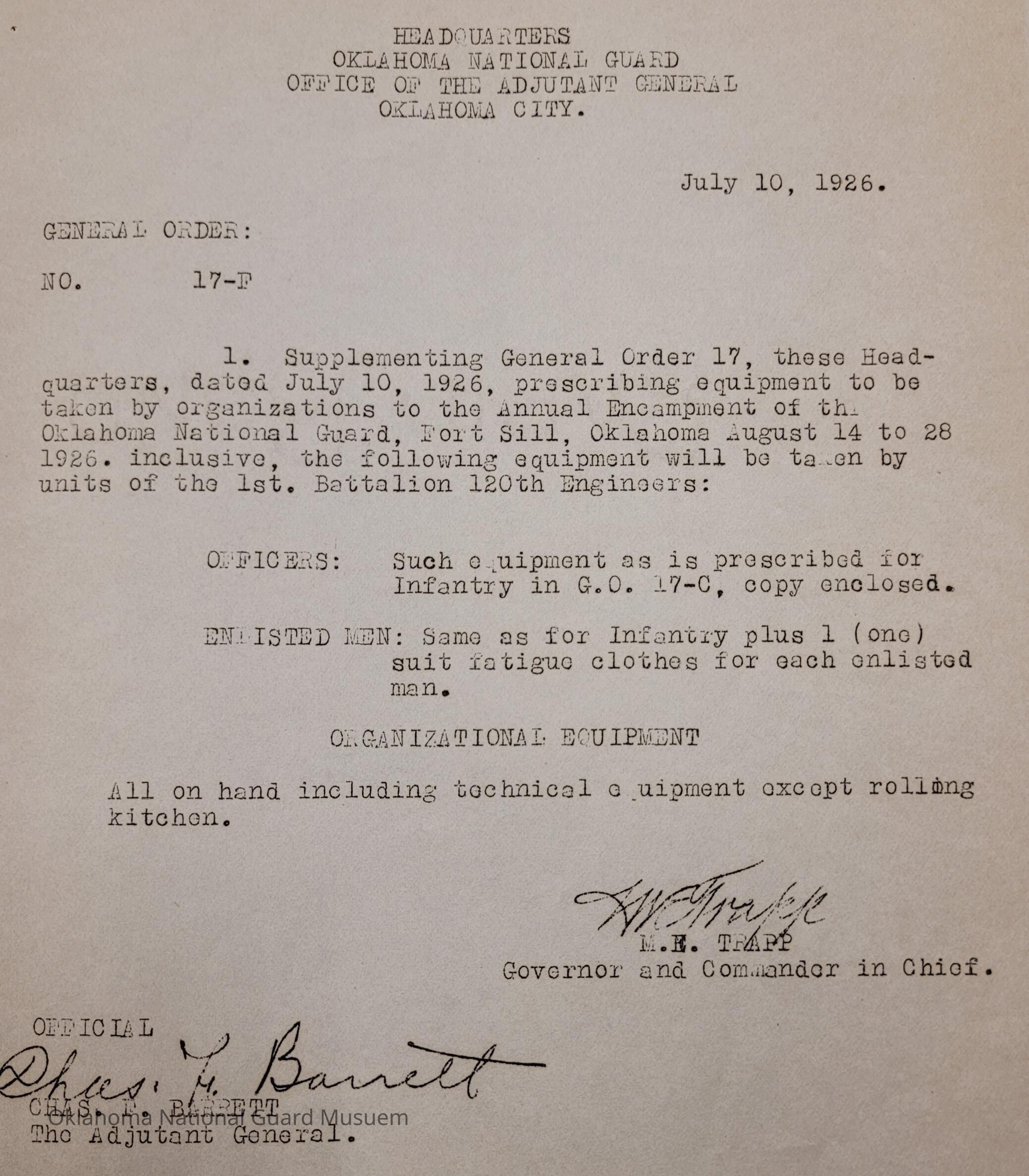 General Order #17-F from Headquarters Adjutant General's Office in Oklahoma City. The order supplements General Order 17 and details what equipment, particular to the 120th Engineers, should be taken to the annual encampmentDate(s) of Creation