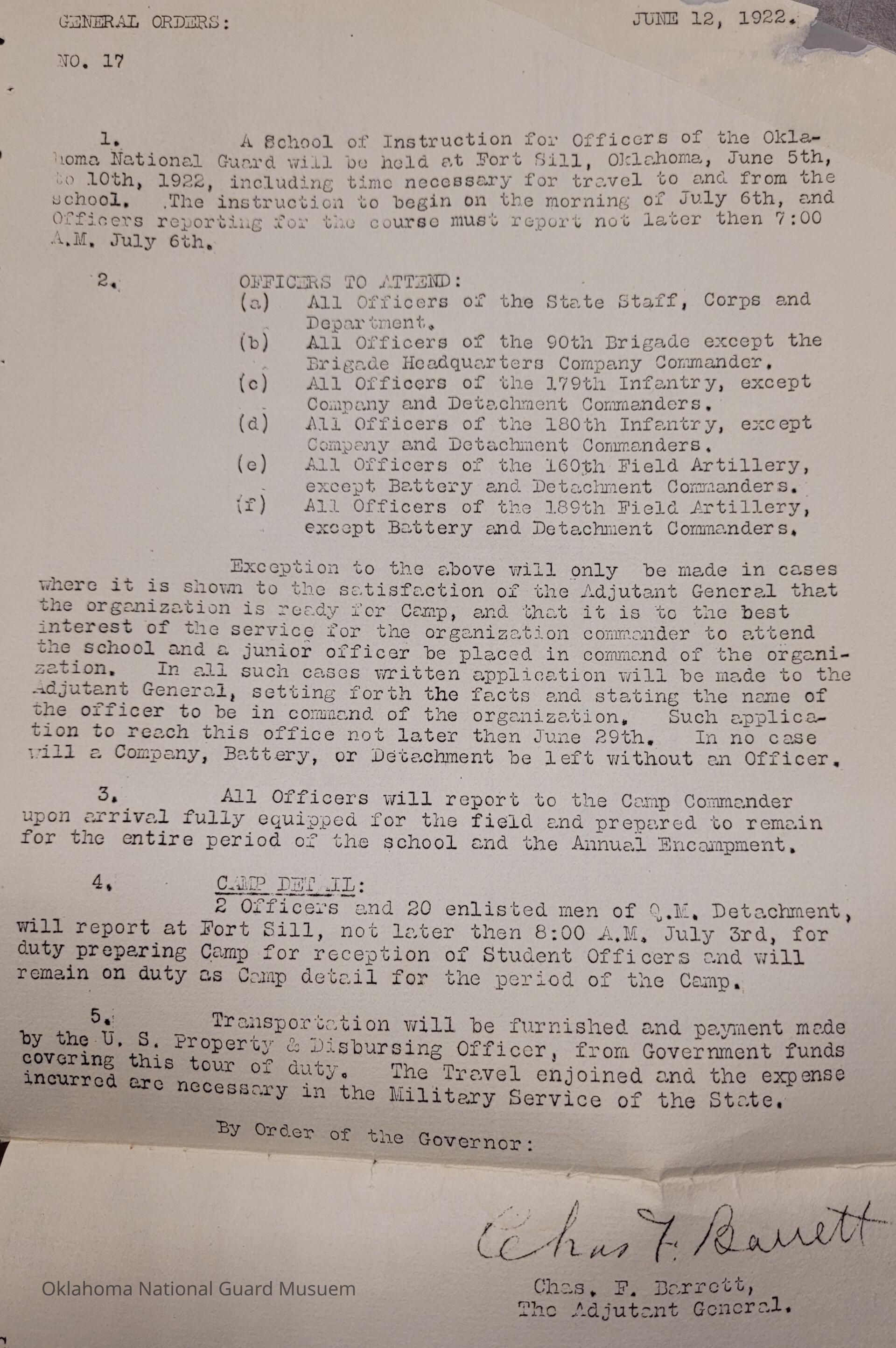 Adjutant General, Oklahoma City, Charles F. Barrett, Fort Sill, School of Instruction, State Staff, 90th Brigade, 179th Infantry, 180th Infantry, 160th Field Artillery, 189th Field Artillery