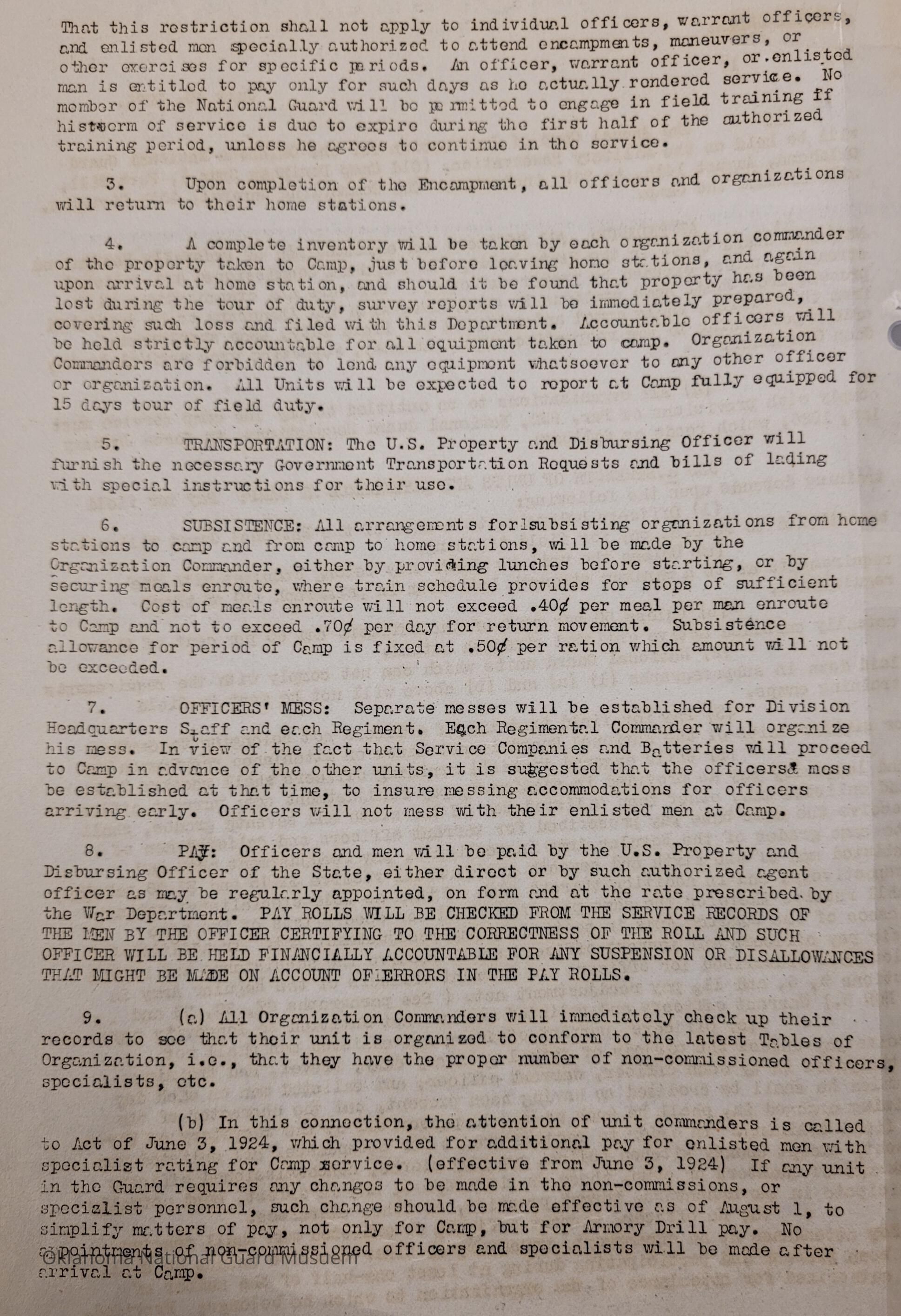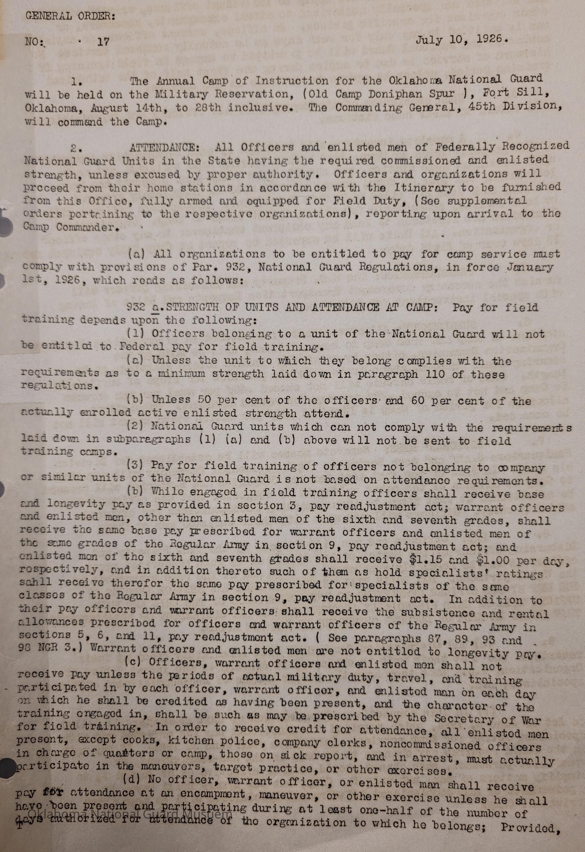 General Order #17 from Headquarters Adjutant General's Office in Oklahoma City. The order details the equipment, attendance, transportation, and pay for the Annual Camp of Instruction at Old Camp Doniphan Spur in Fort SillDate(s) of Creation