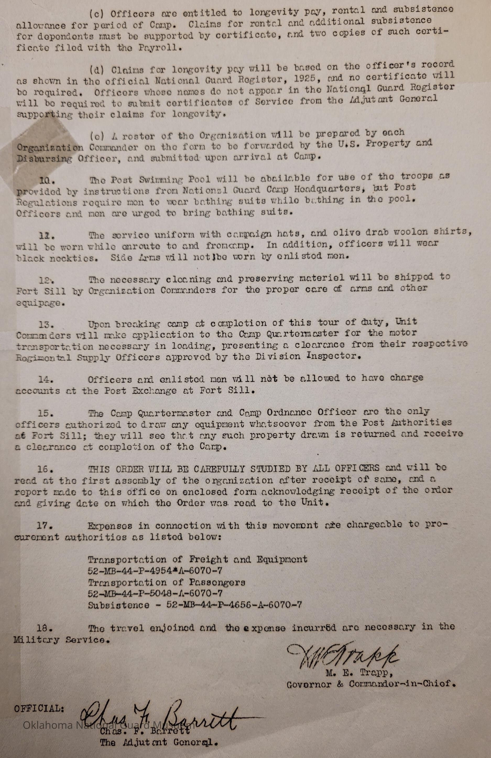 Adjutant General, Oklahoma City, Charles F. Barrett, 45th Division, Camp of Instruction, Old Camp Doniphan Spur, Fort Sill, Attendance, Pay, Transportation, Martin E. Trapp