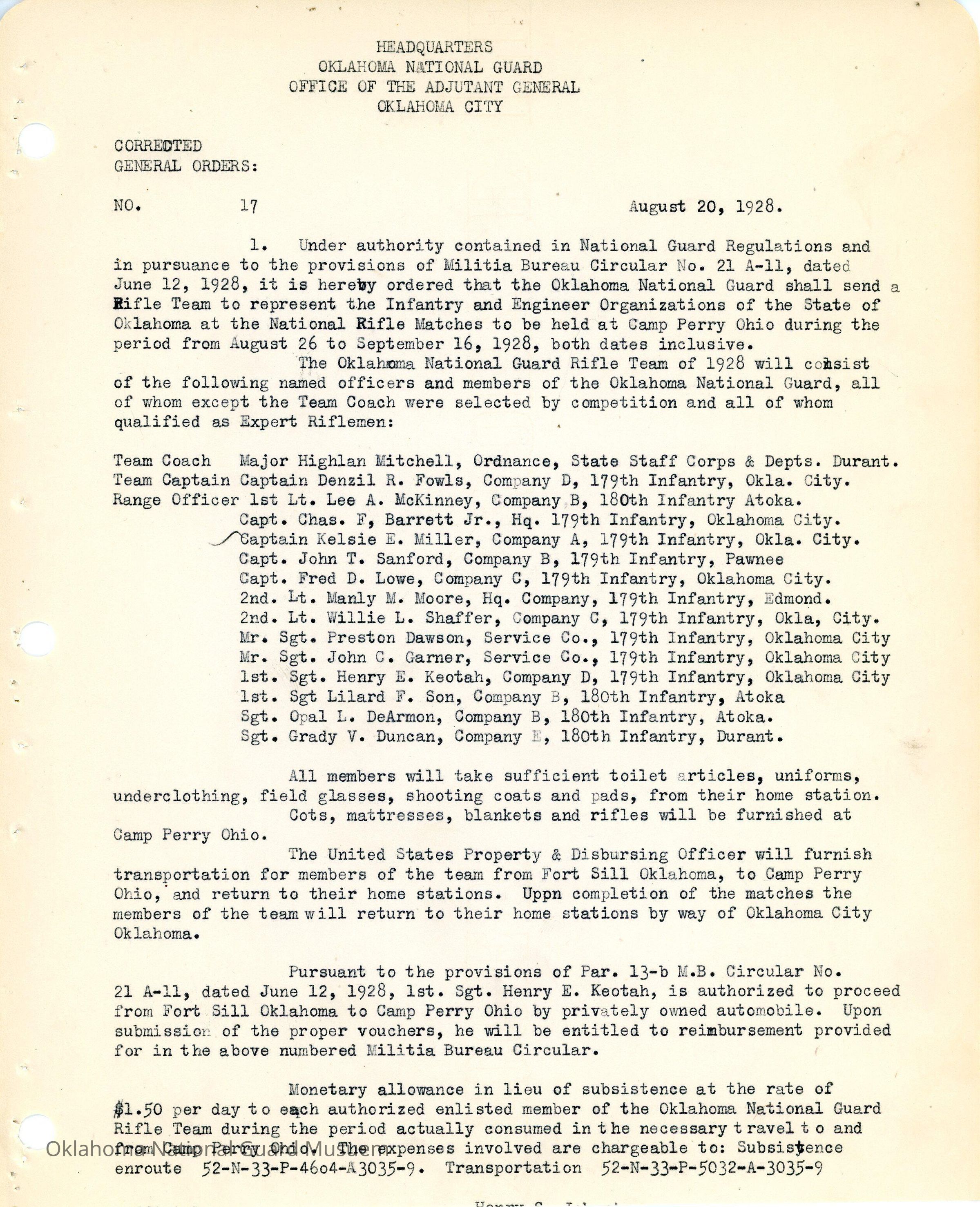 General Order #17 from Headquarters Adjutant General's Office in Oklahoma City. The order lists the members of the Rifle Team representing Oklahoma at Camp Perry, Ohio during the National Rifle matchesDate(s) of Creation