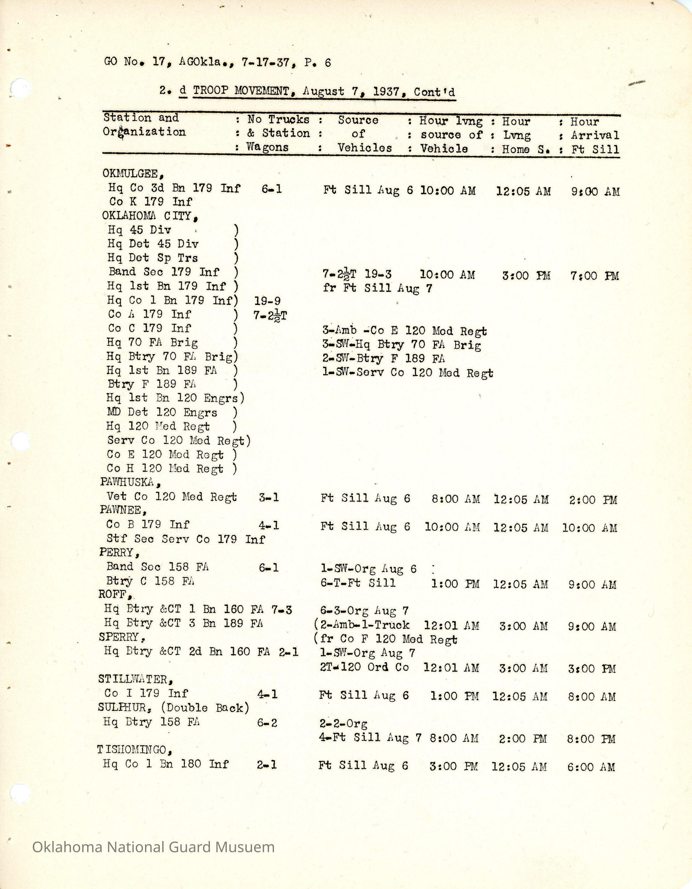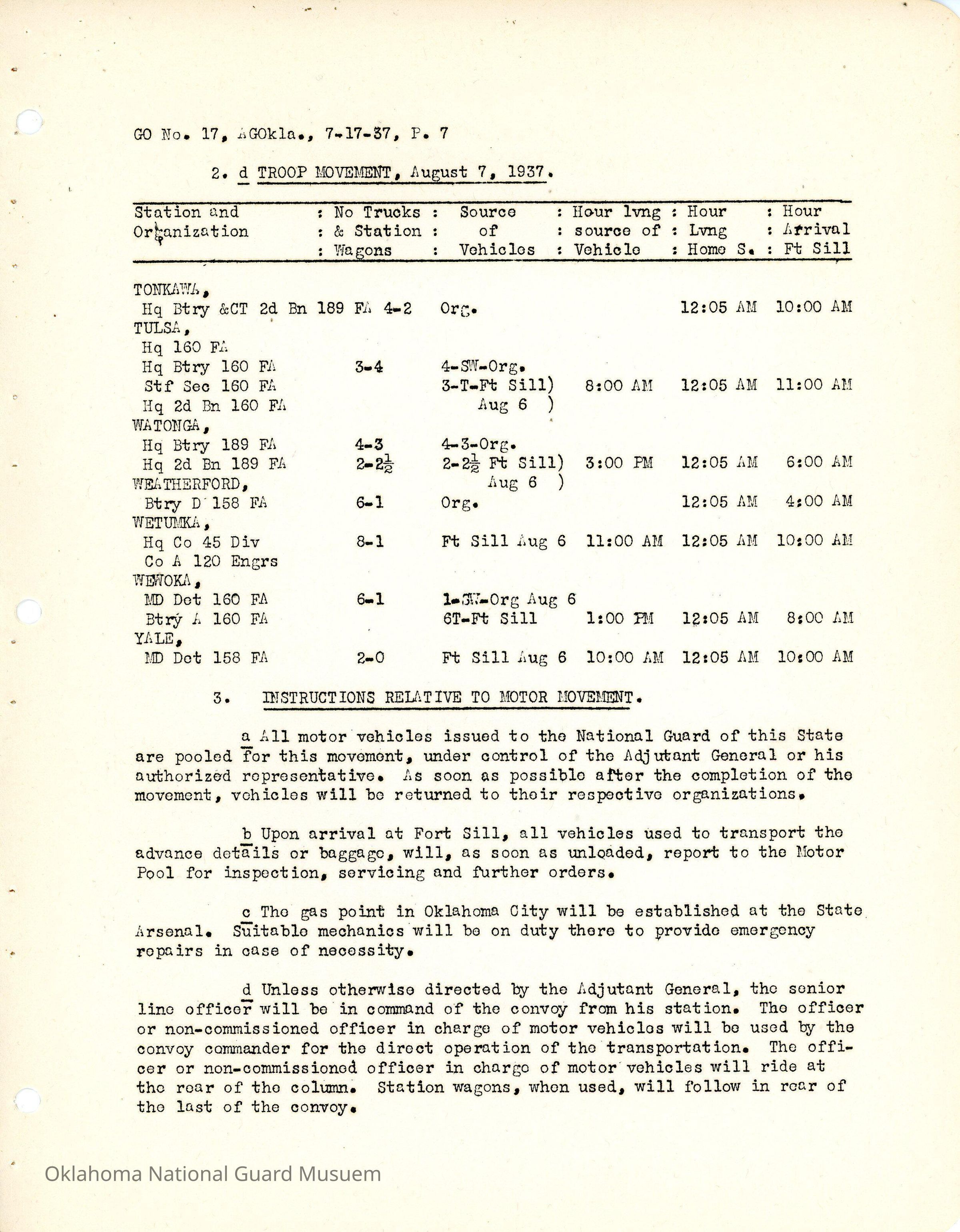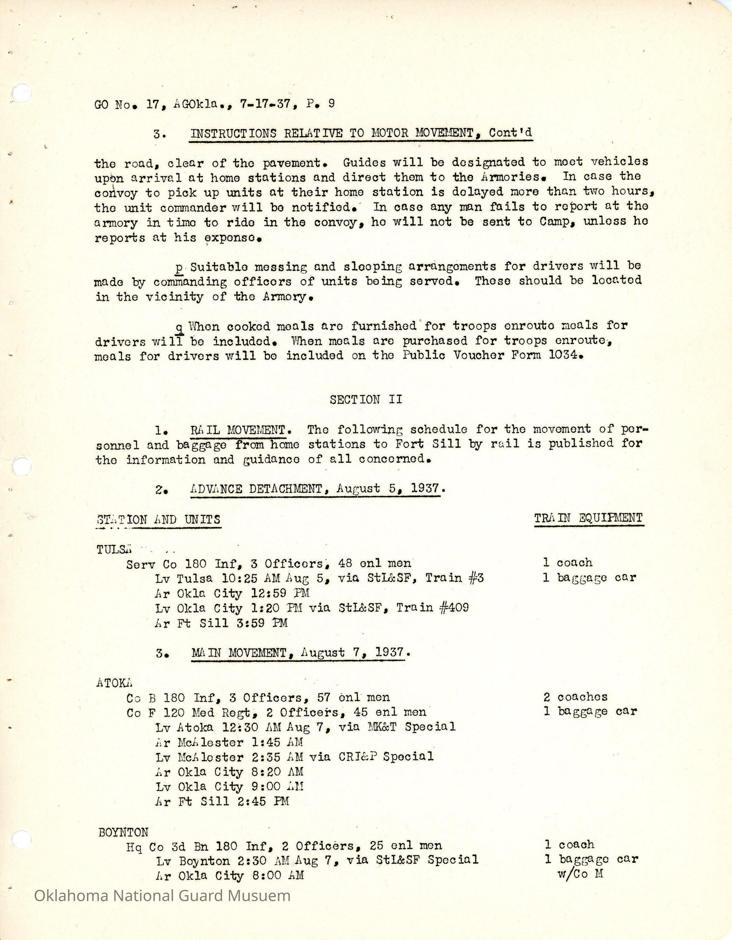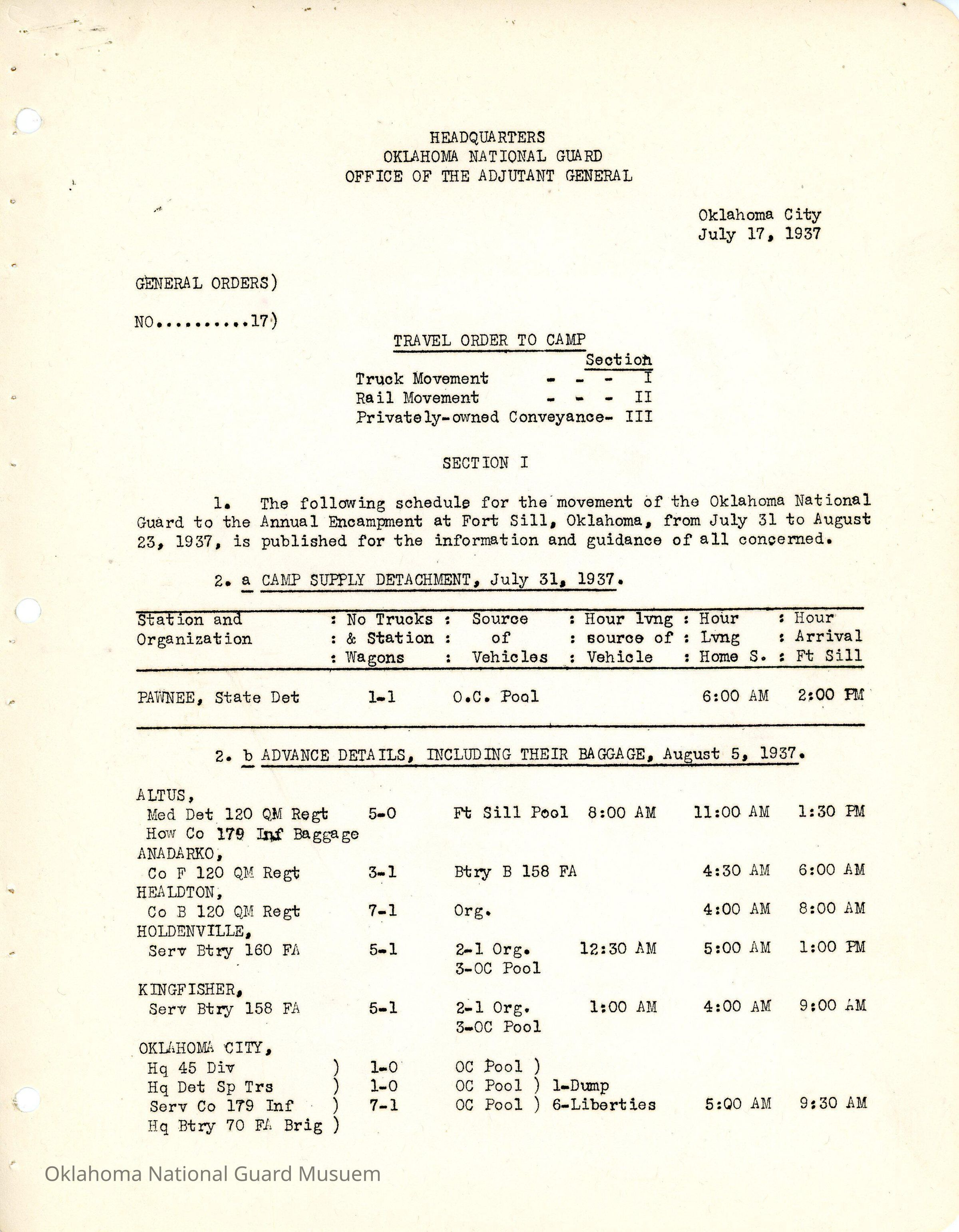 General Order #17 from Headquarters Adjutant General's Office in Oklahoma City. The order details the travel schedule by rail, train, and private vehicles to Fort Sill from home stations.Date(s) of Creation
