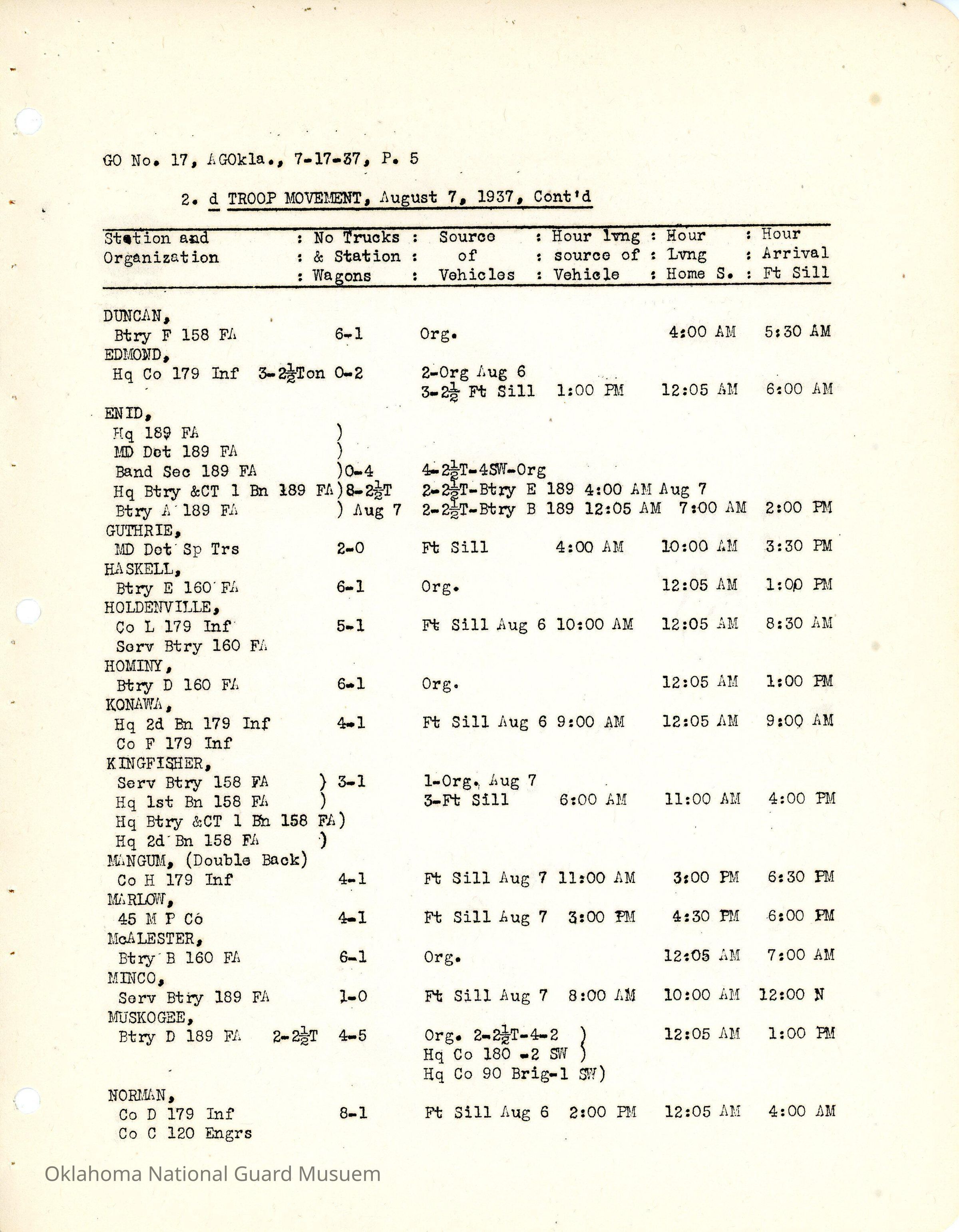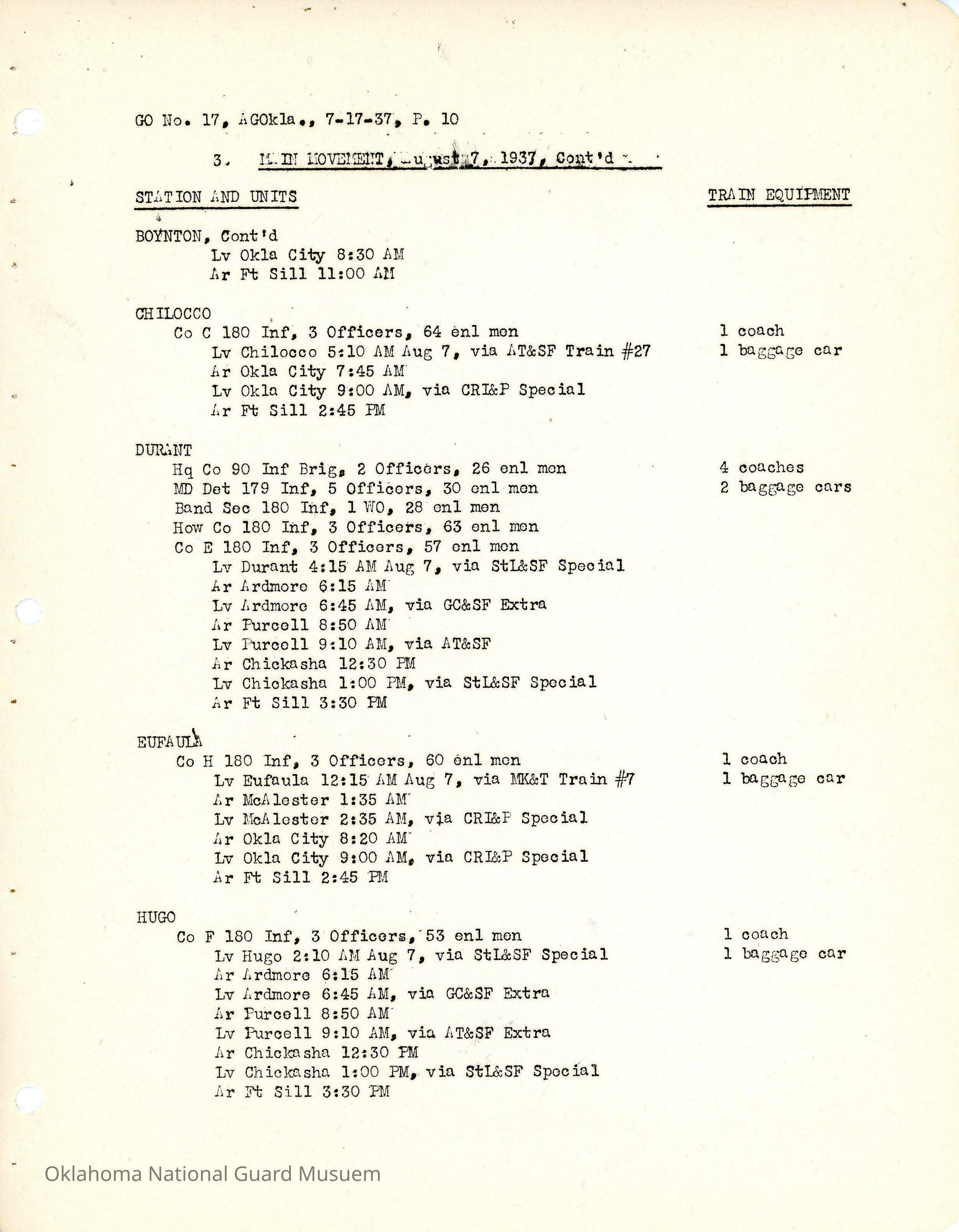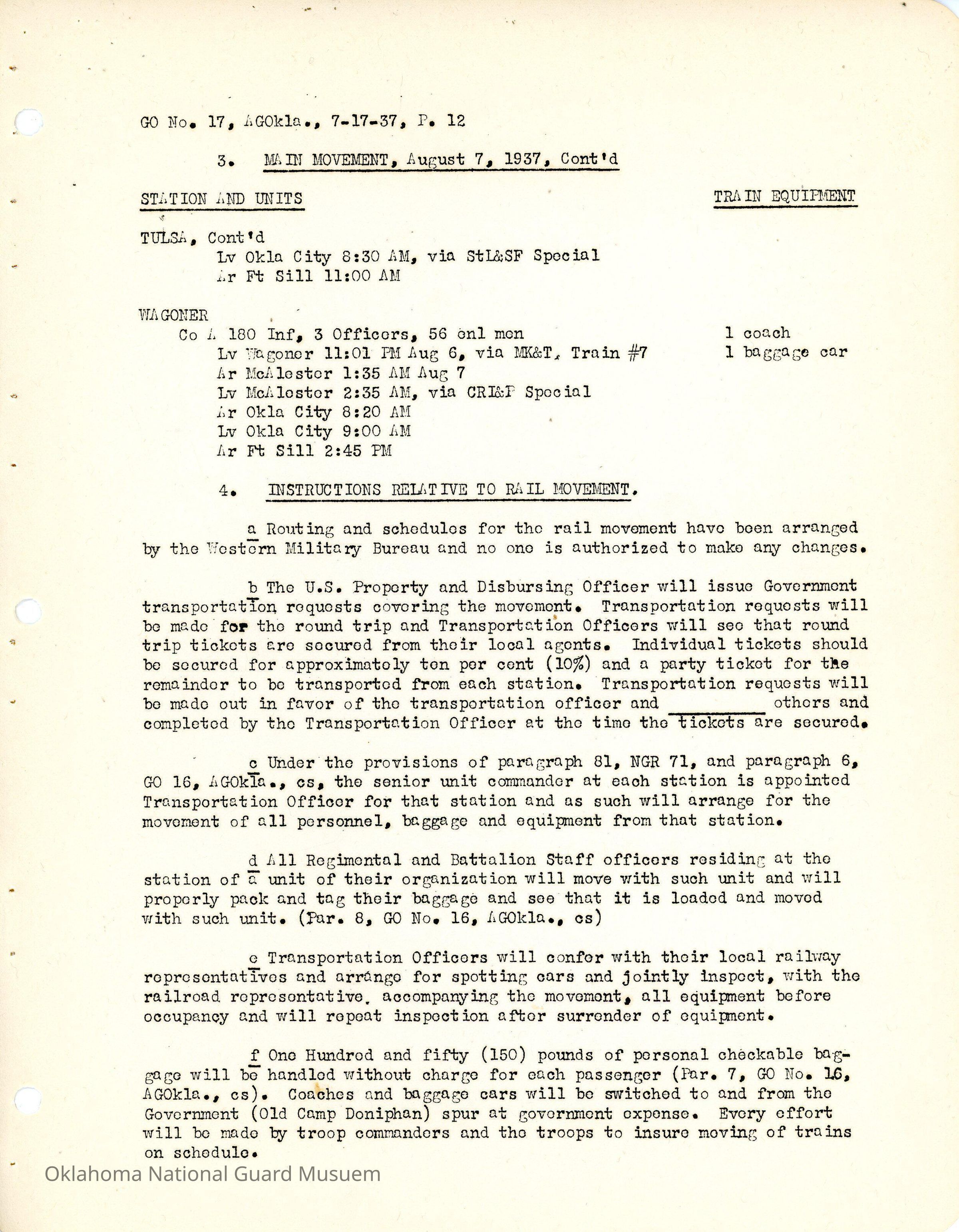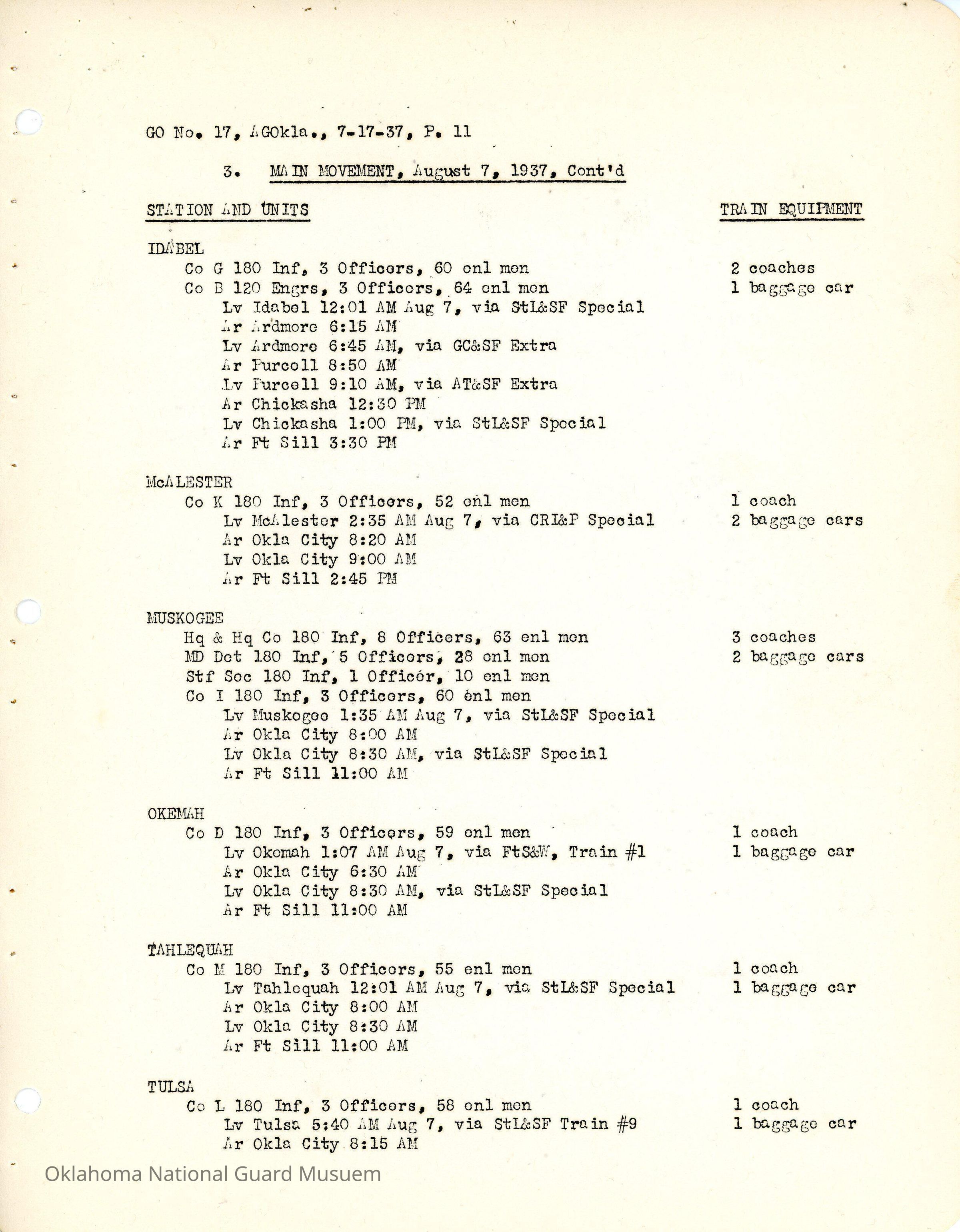 General Order #17 from Headquarters Adjutant General's Office in Oklahoma City. The order details the travel schedule by rail, train, and private vehicles to Fort Sill from home stations.Date(s) of Creation