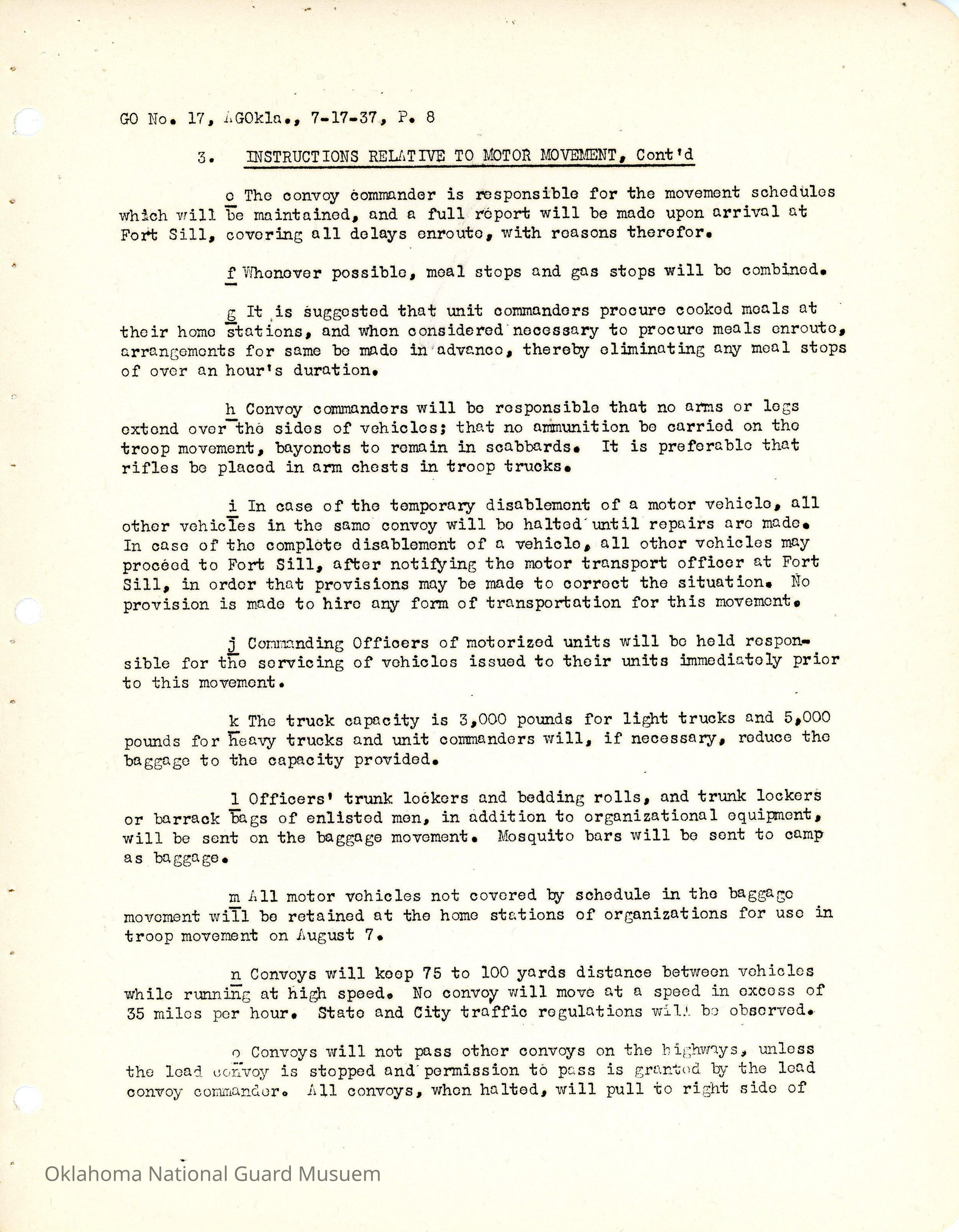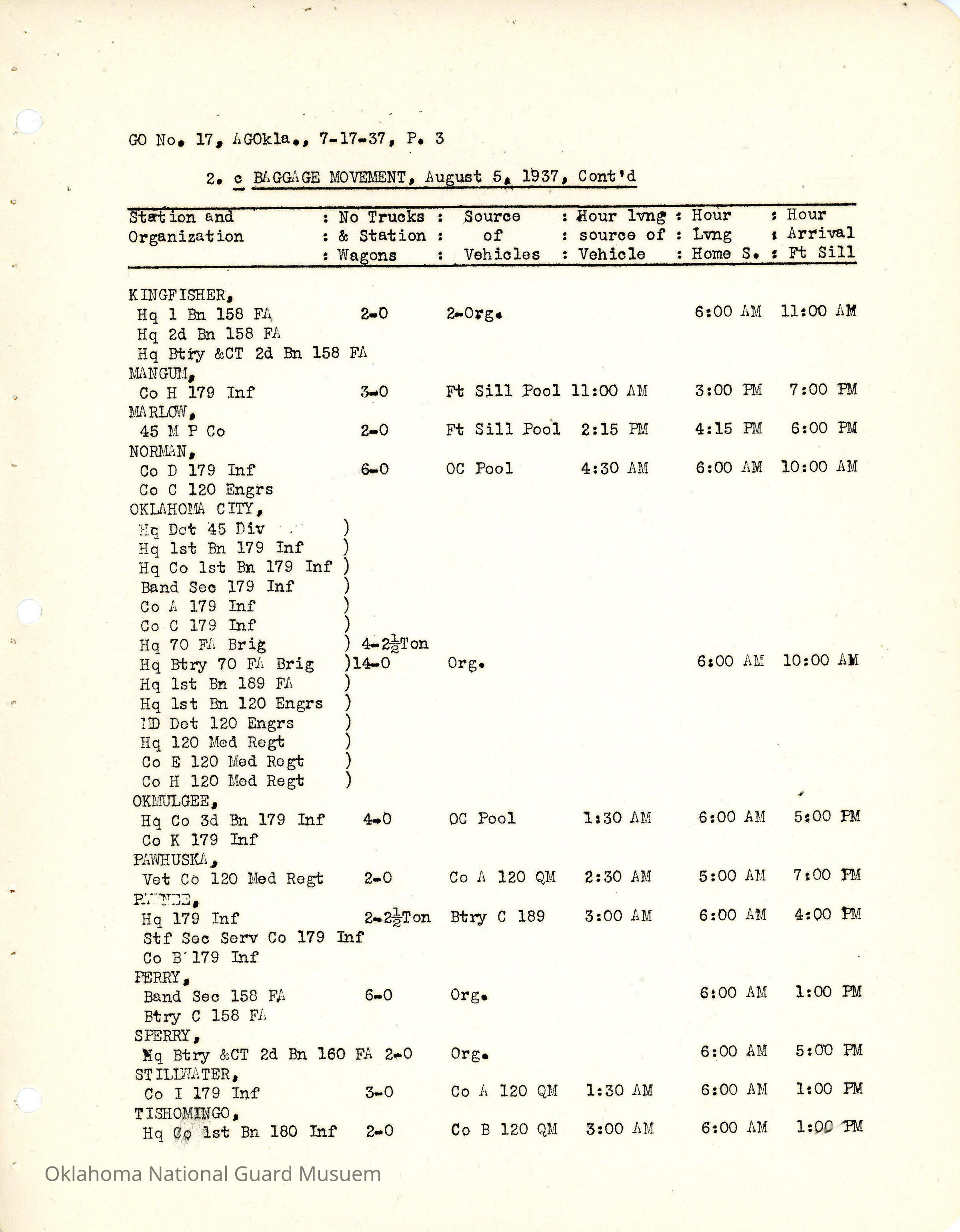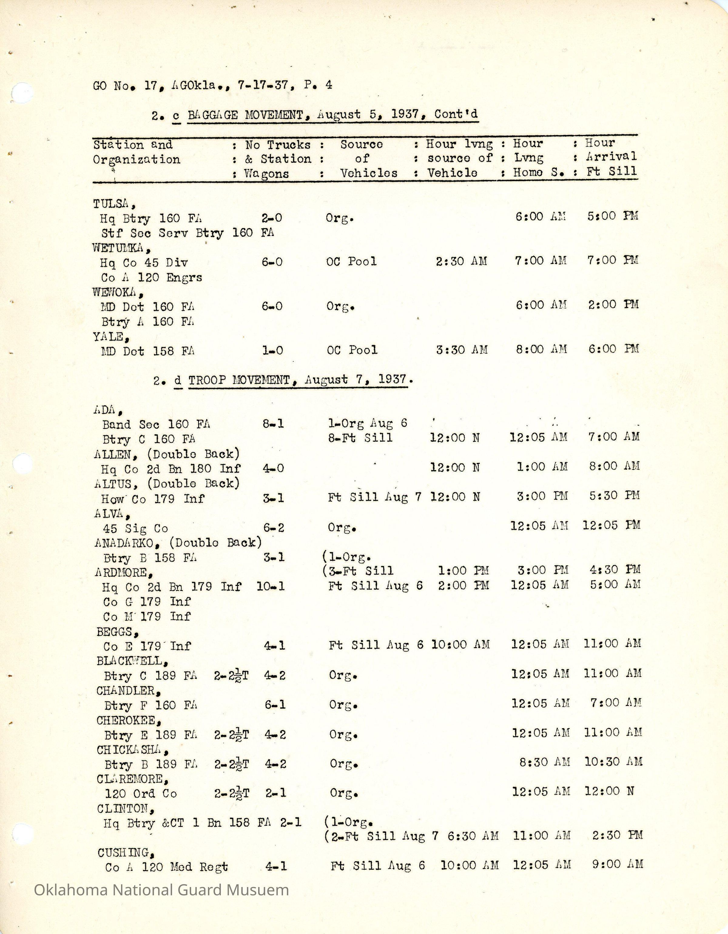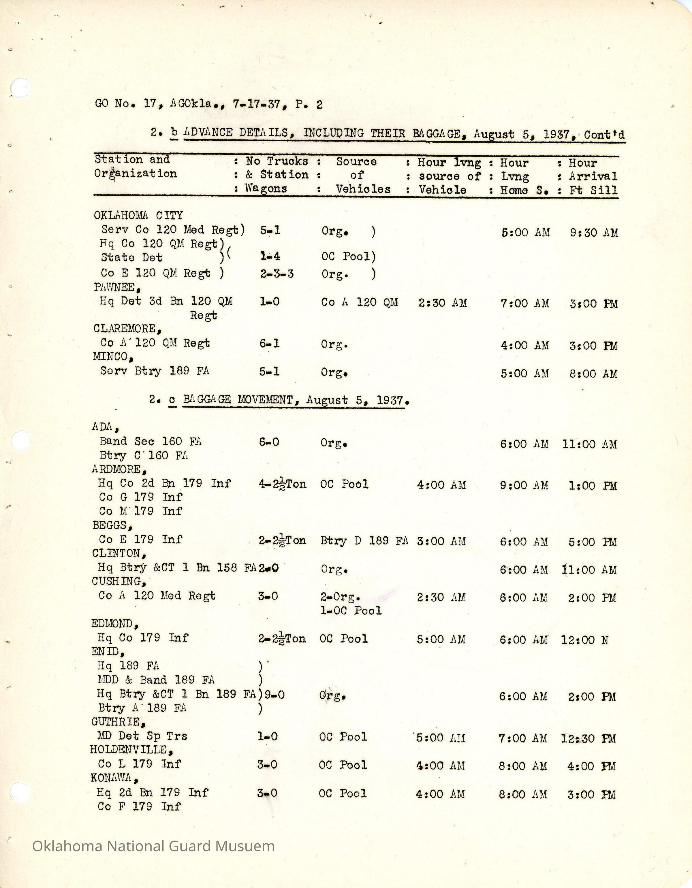 General Order #17 from Headquarters Adjutant General's Office in Oklahoma City. The order details the travel schedule by rail, train, and private vehicles to Fort Sill from home stations.Date(s) of Creation