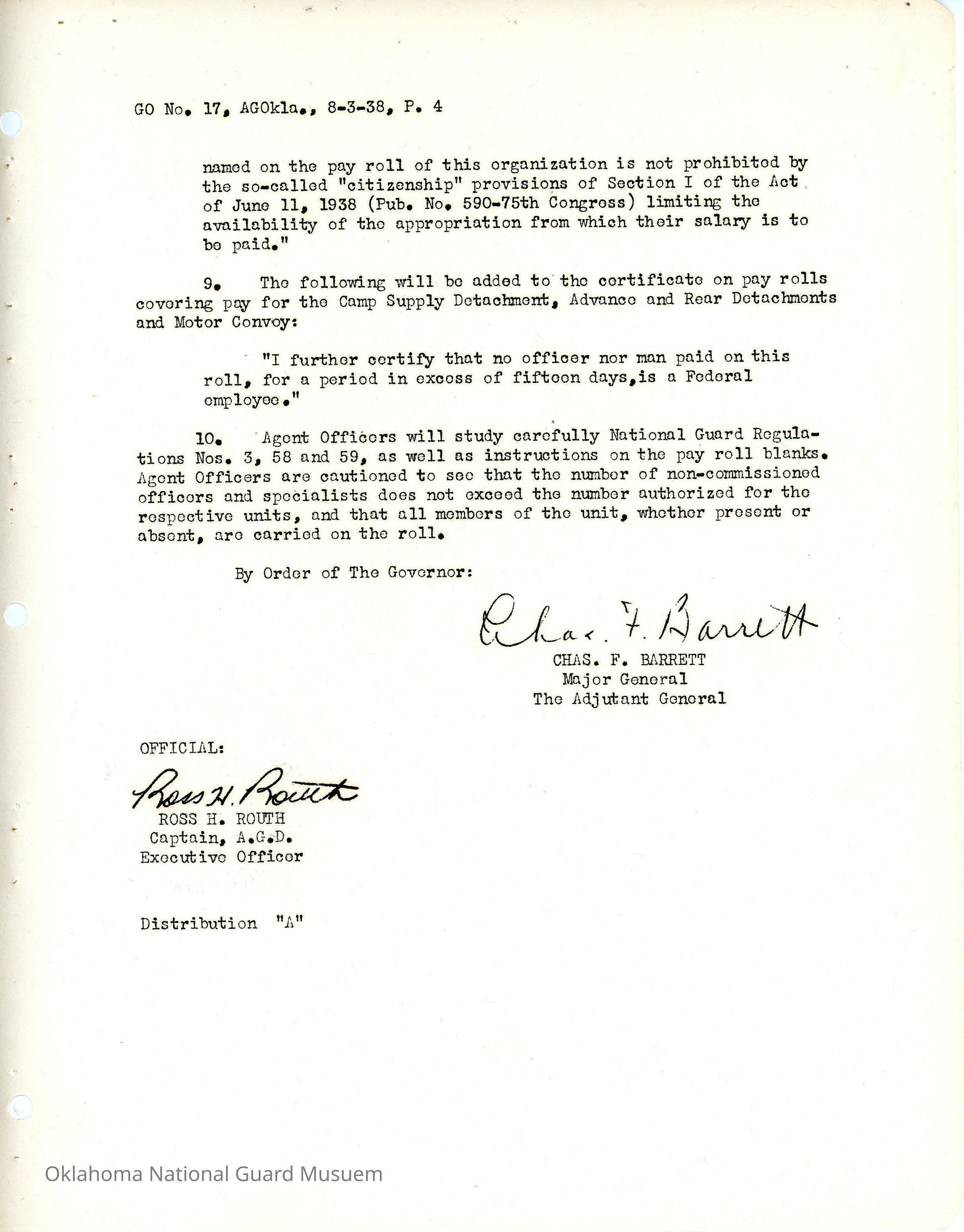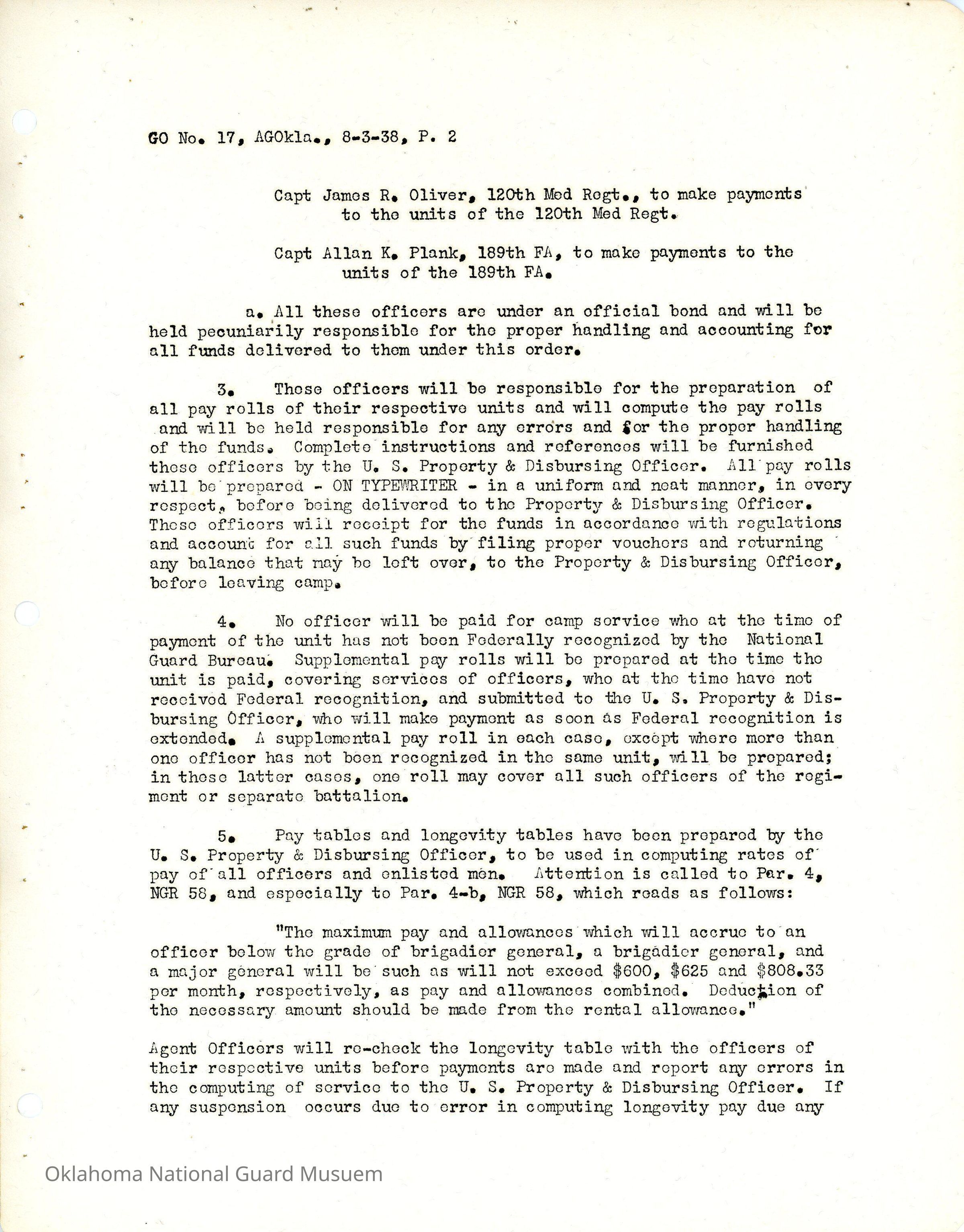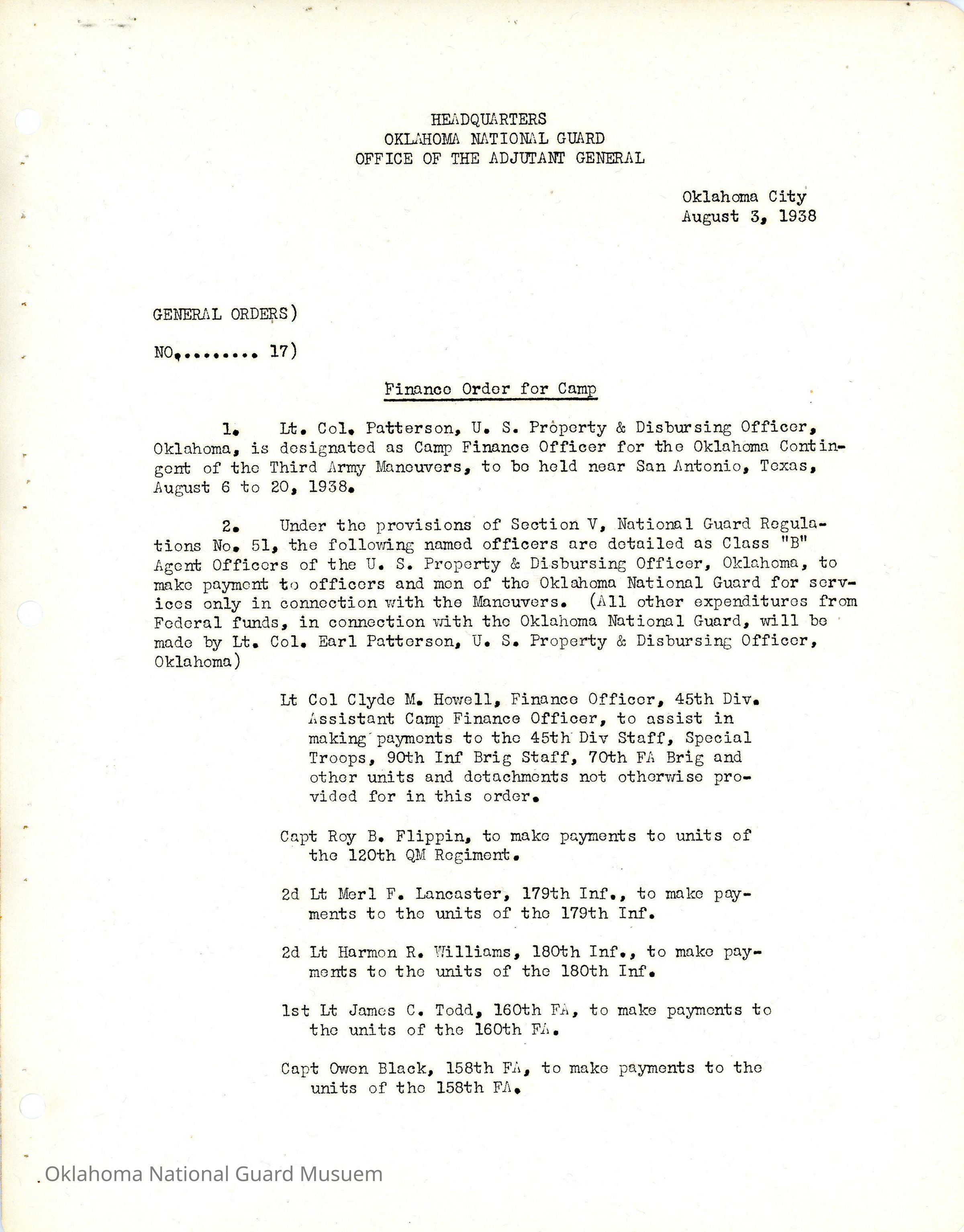 Adjutant General, Oklahoma City, Charles F. Barrett, Ross H. Routh, Texas, Camp Bullis, Annual encampment, Finance, Money, Payments, Pay, Earl Patterson, San Antonio, Agent Officers, Clyde M. Howell, Camp Finance Officer, Special Troops, 90th Infantry Brigade, 70th Field Artillery Brigade, Roy B. Flippin, 120th Quartermaster Regiment, Merl F. Lancaster, 179th Infantry, Harmon R. Williams, 180th Infantry, James C. Todd, 160th Field Artillery, Owen Black, 158th Field Artillery, James R. Oliver, 120th Medical Regiment, Allan K. Plank, 189th Field Artillery