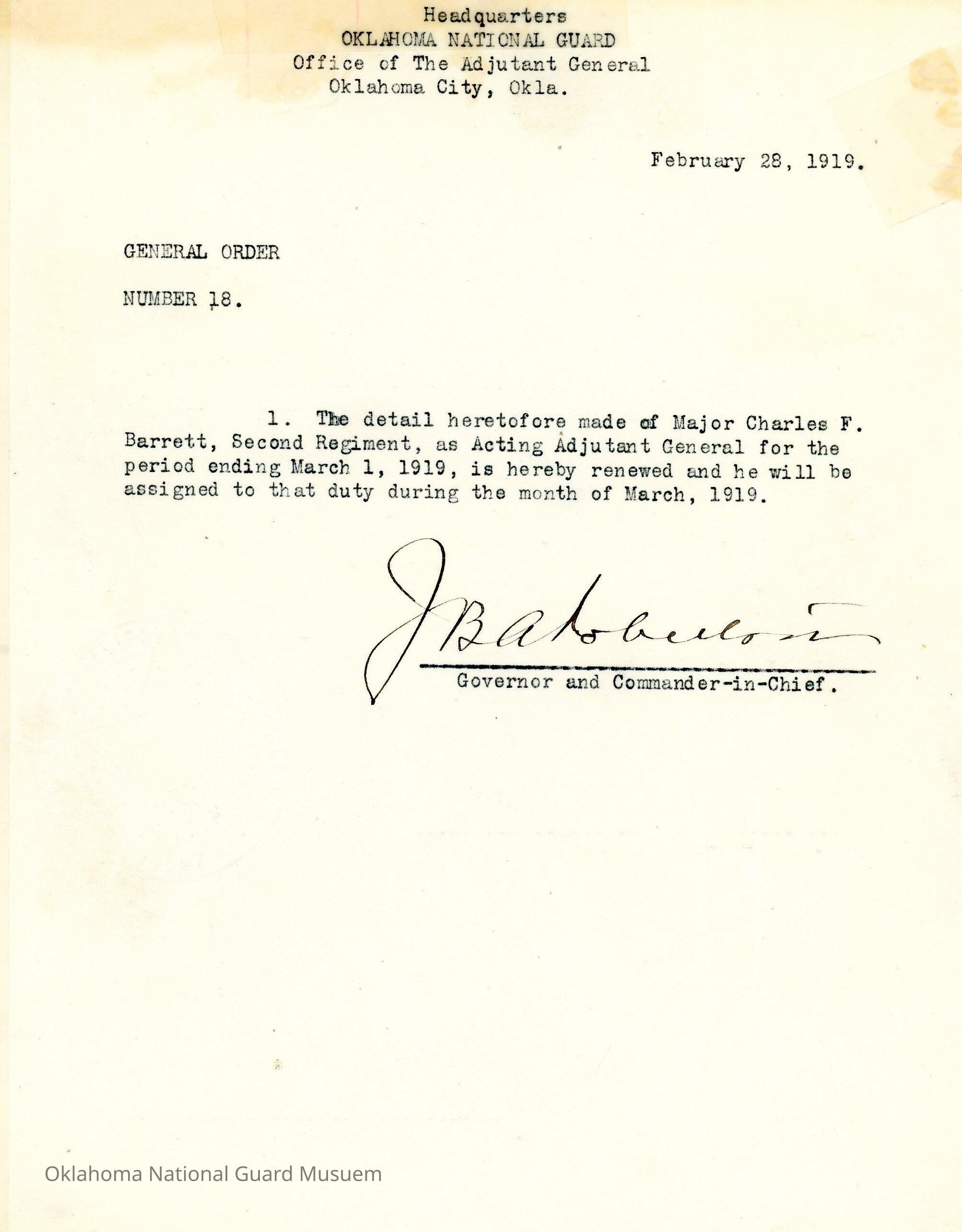 General Order #18 from Headquarters Adjutant General's Office in Oklahoma City. The order extends Charles Barrett as the Acting Adjutant General during March 1919Date(s) of Creation
