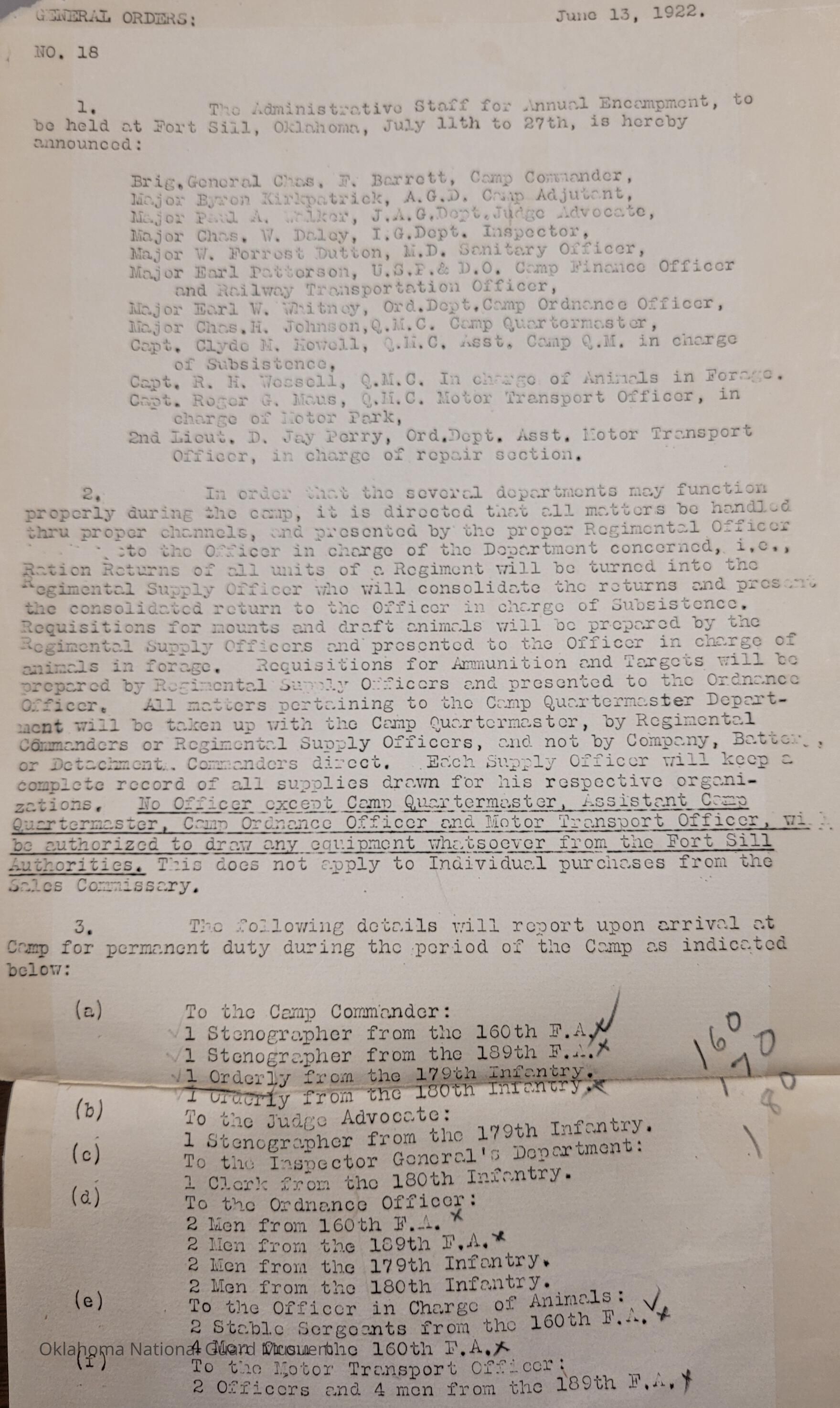 General Order #18 from Headquarters Adjutant General's Office in Oklahoma City. The order details the Administrative Staff for the Annual Encampment at Fort Sill.Date(s) of Creation