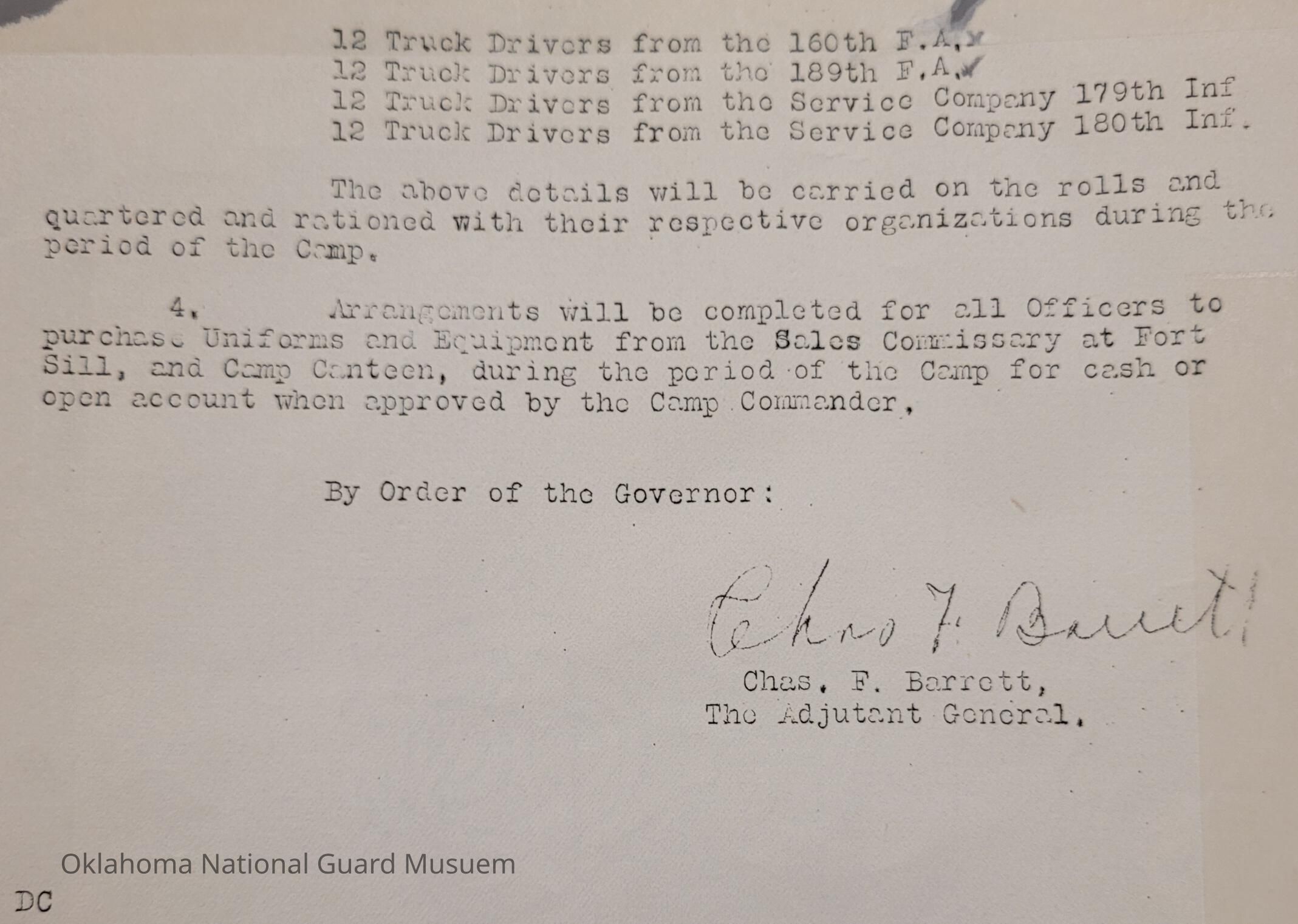 Adjutant General, Oklahoma City, Charles F. Barrett, Fort Sill, Administrative Staff, Annual Encampment, Byron Kirkpatrick, Paul A. Walker, Charles W. Daley, W. Forrest Dutton, Earl Patterson, Earl W. Whitney, Charles H. Johnson, Clyde M. Howell, R.H. Wessell, Roger G. Maus, D. Jay Perry, 160th Field Artillery, 189th Field Artillery, 179th Infantry, 180th Infantry