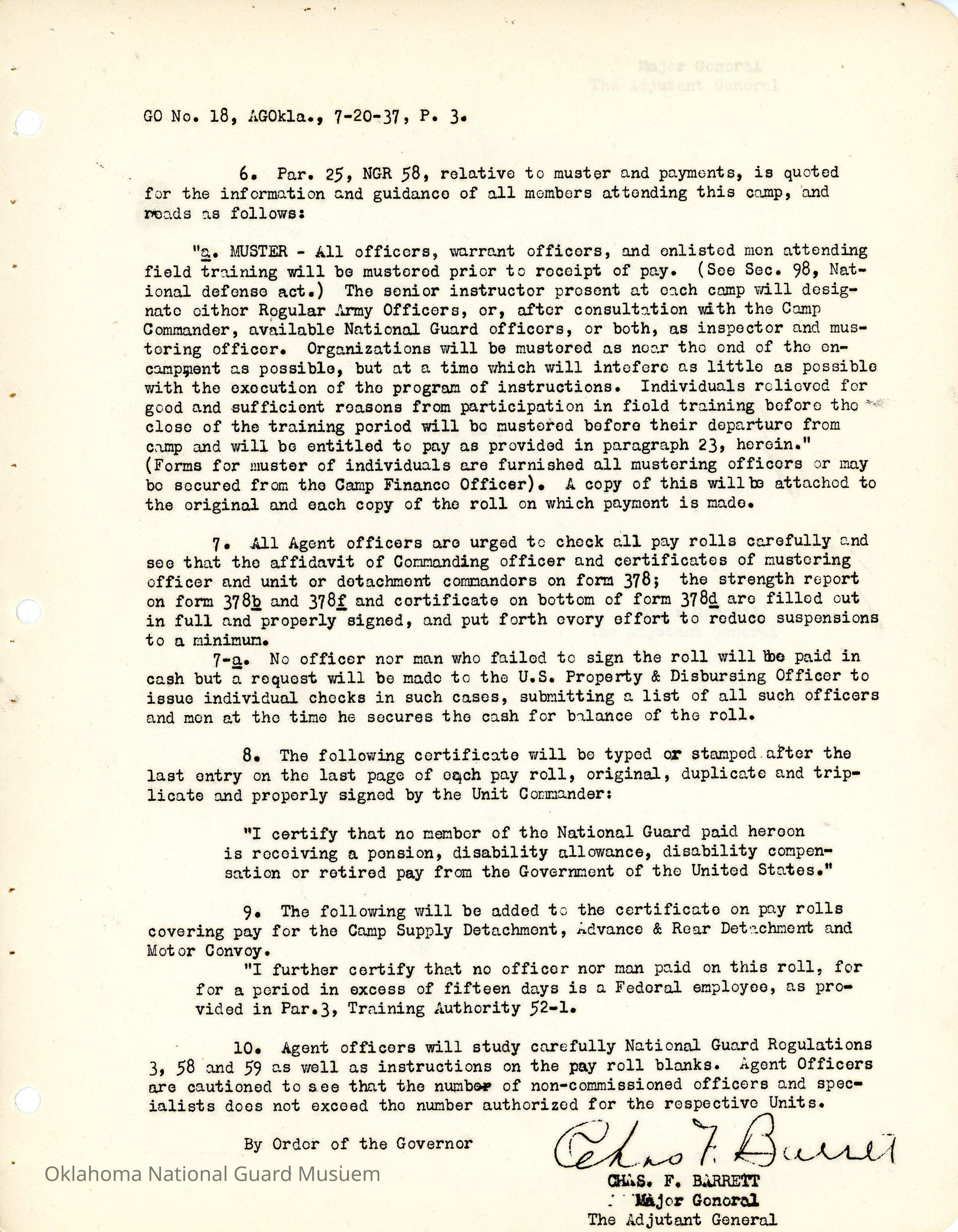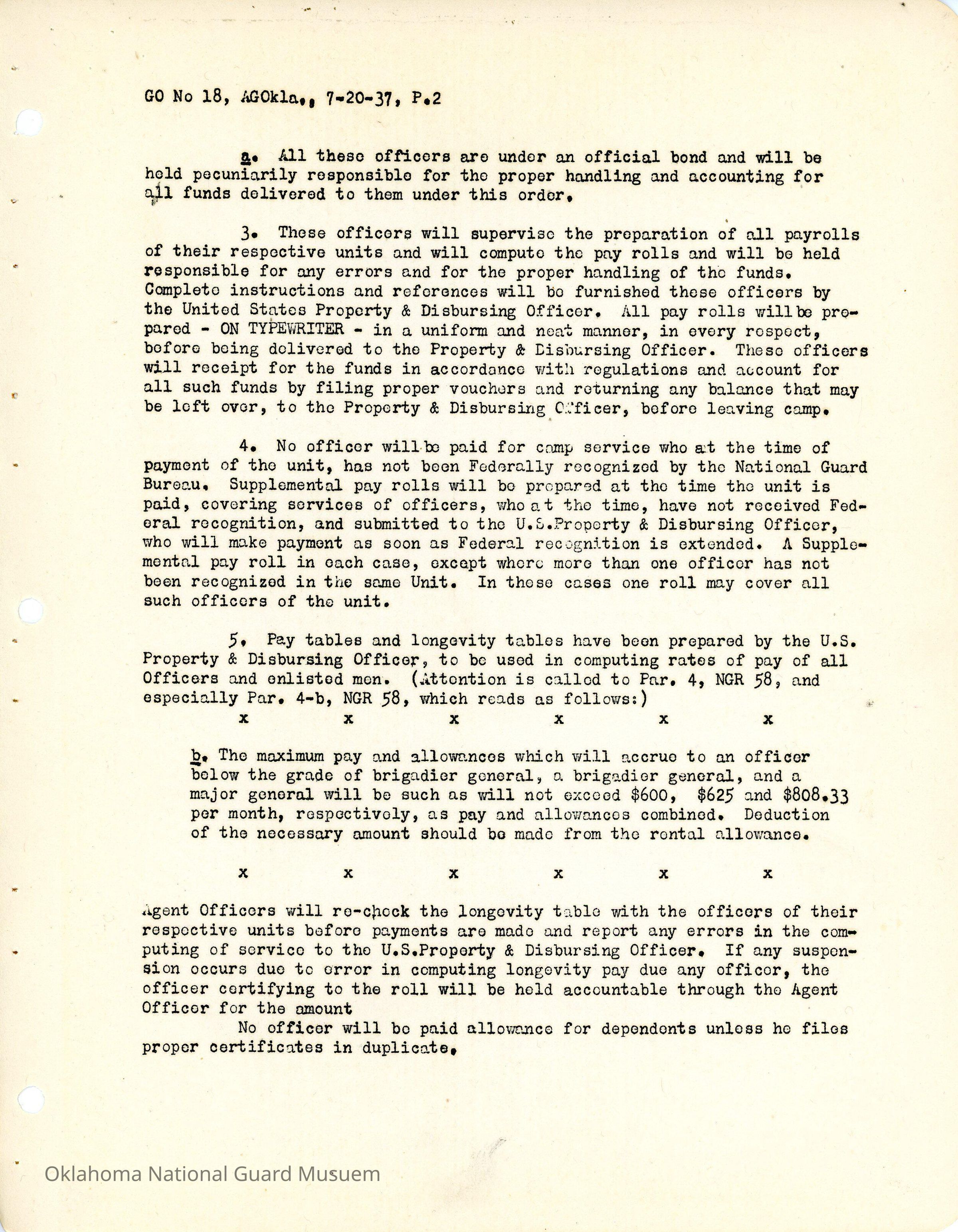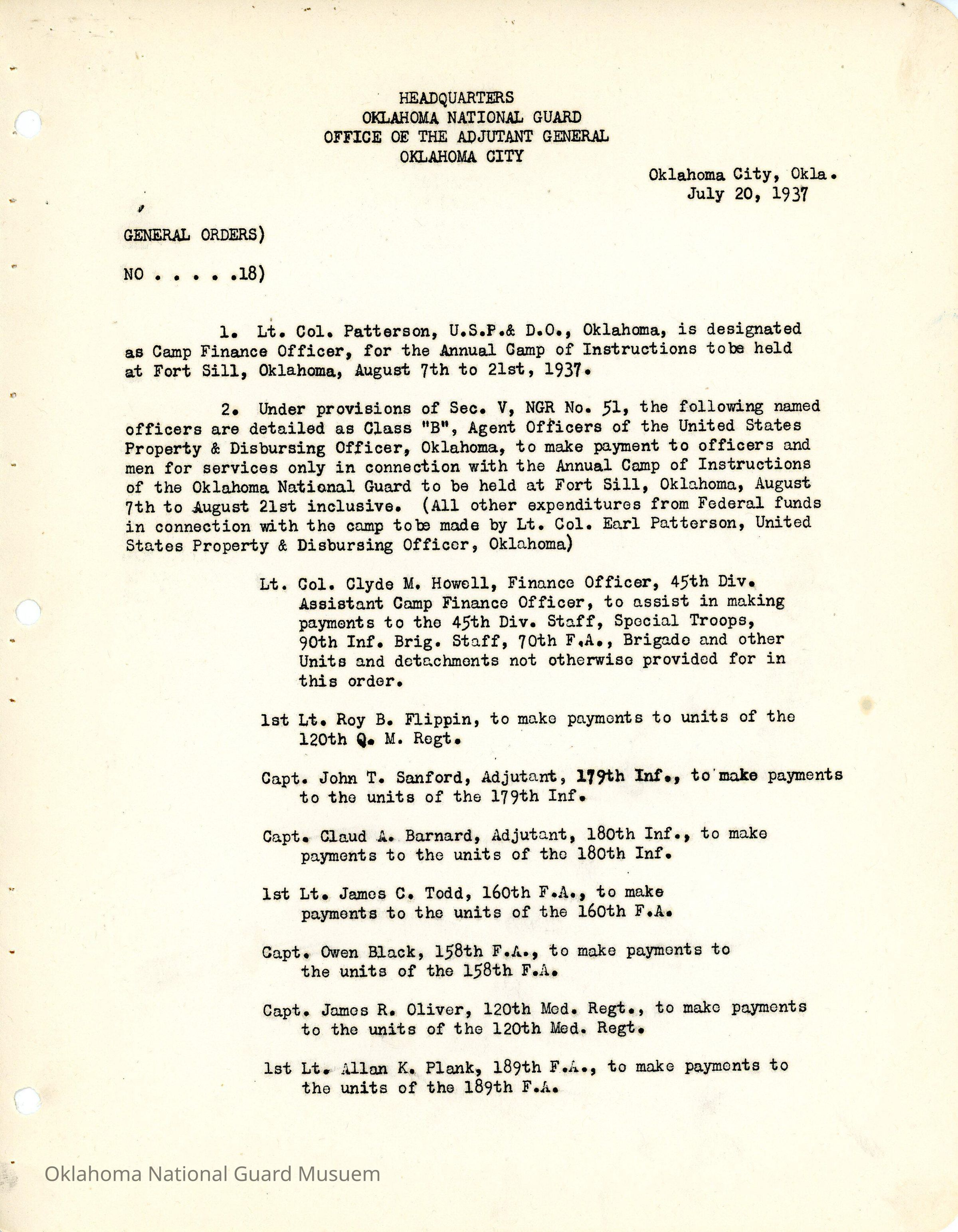 Adjutant General, Oklahoma City, Charles F. Barrett, Finance Officer, Class B Agents, Earl Patterson, Clyde M. Howell, Roy B. Flippin, 70th Field Artillery Brigade, 90th Infantry Brigade, 120th Medical Regiment, John T. Sanford, 179th Infantry, Claud A. Barnard, 180th Infantry, James C. Todd, 160th Field Artillery, Owen Black, 158th Field Artillery, James R. Oliver, 120th Quartermaster Regiment, Allan K. Plank, 189th Field Artillery, Pay, Money