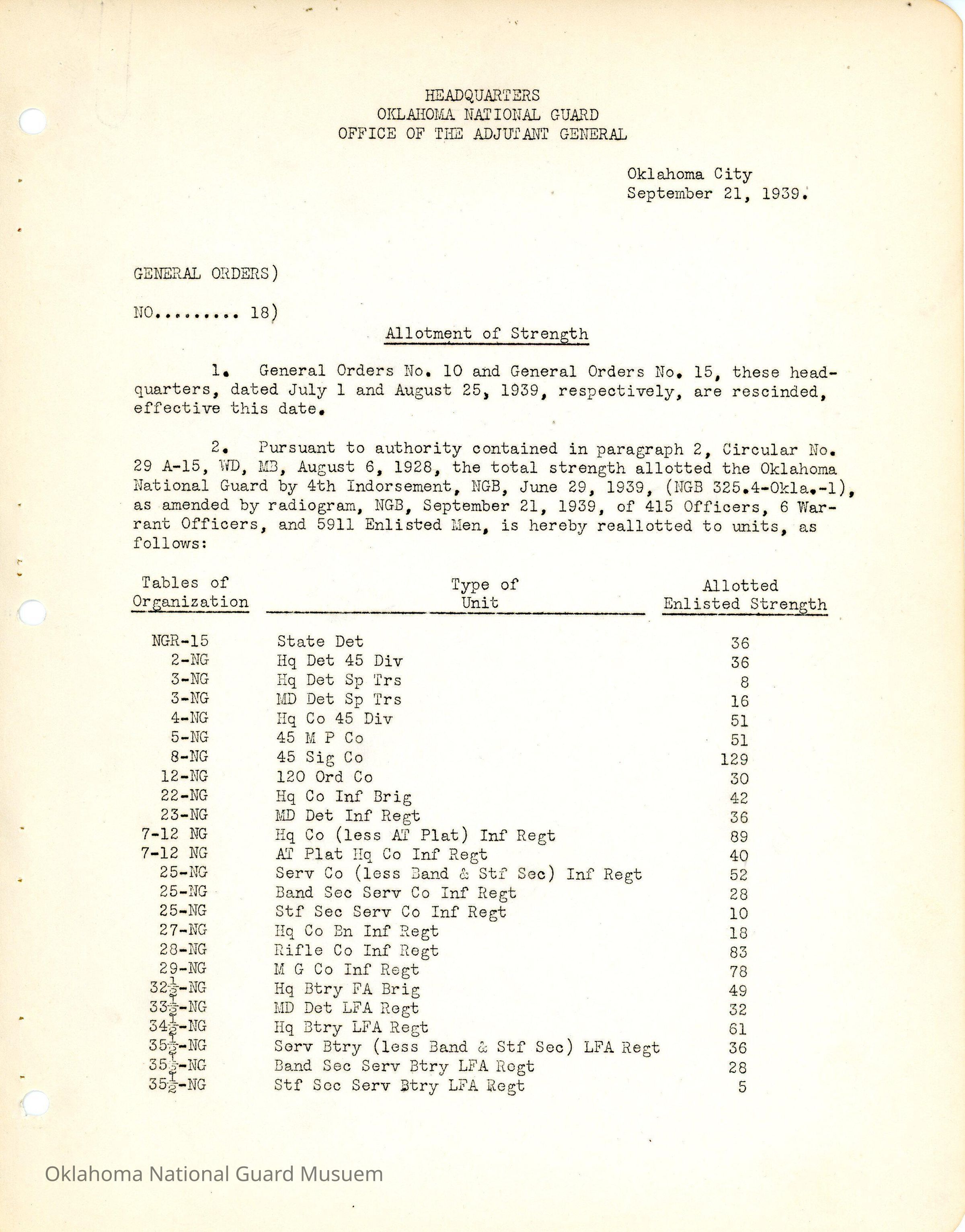 General Order #18 from Headquarters Adjutant General's Office in Oklahoma City. The order rescinds General Order #10 1939 and General Order #15 1939 and establishes new strength allotment numbers for the Oklahoma GuardDate(s) of Creation
