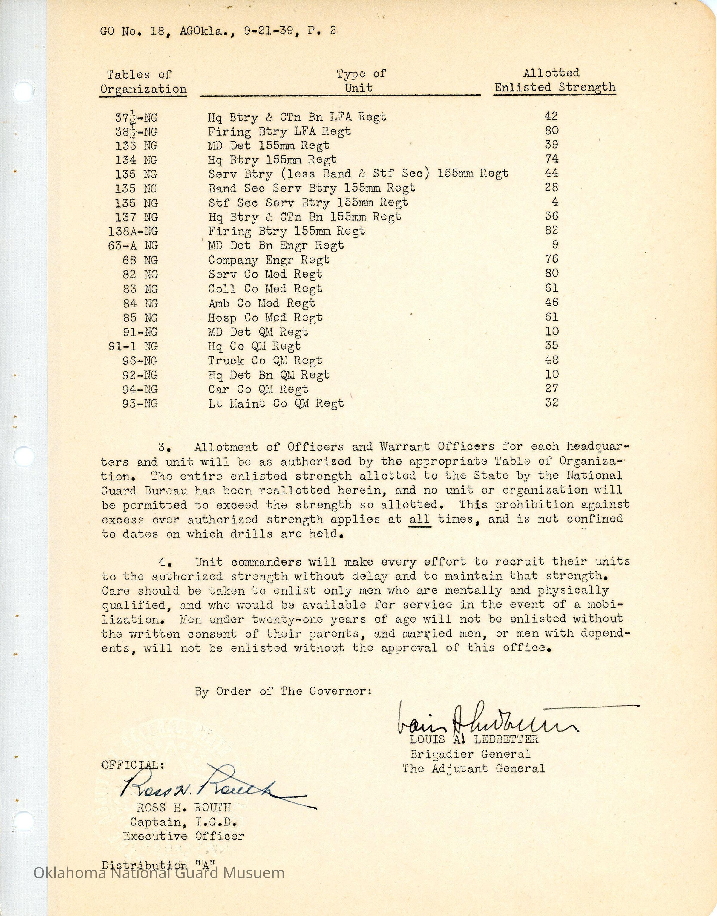 Adjutant General, Oklahoma City, Louis Ledbetter, Ross H. Routh, Rescinds, Allotment of Strength, 45th Division, 90th Infantry Brigade, 179th Infantry, 180th Infantry, 70th Field Artillery Brigade, 158th Field Artillery, 160th Field Artillery, 189th Field Artillery, 120th Engineers, 120th Medical Regiment, 120th Quartermaster Regiment