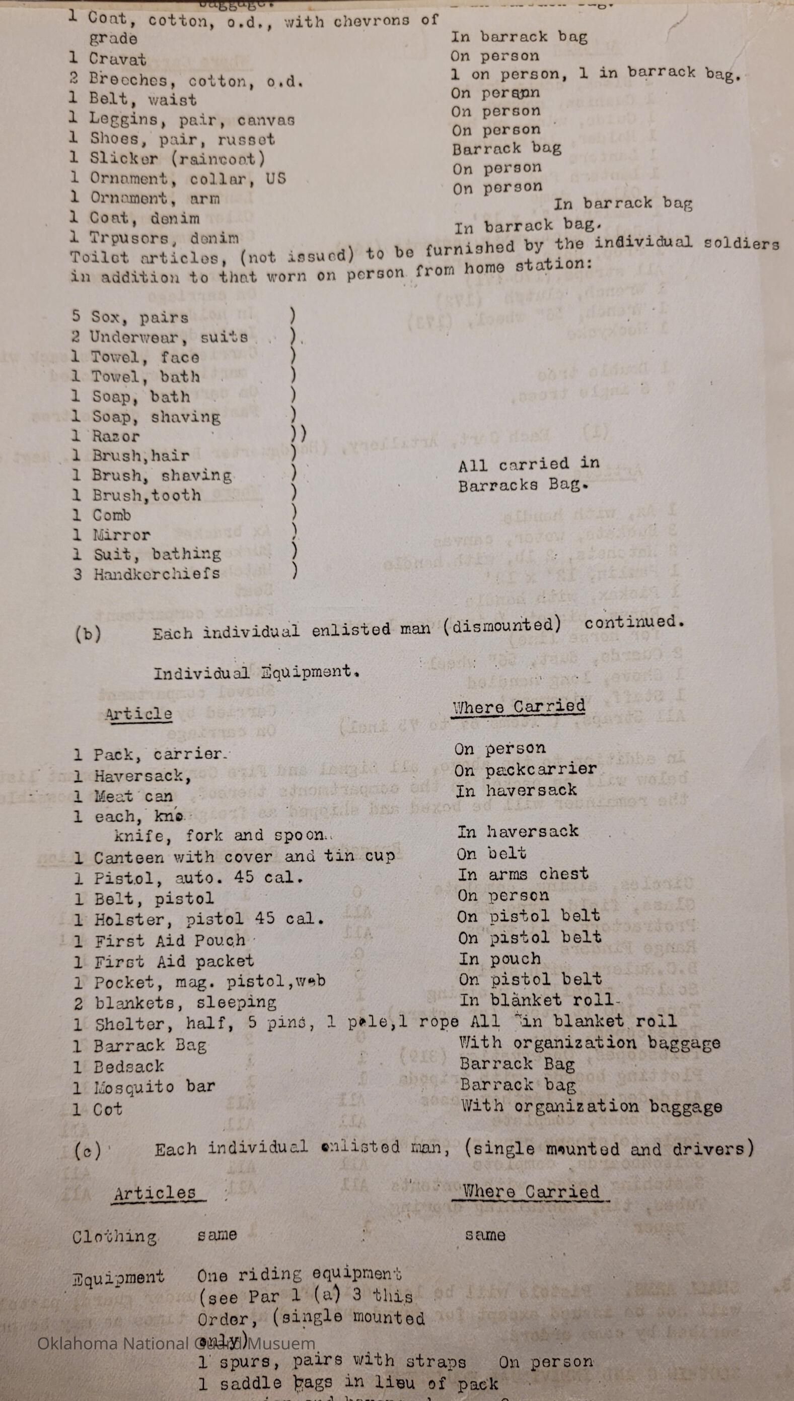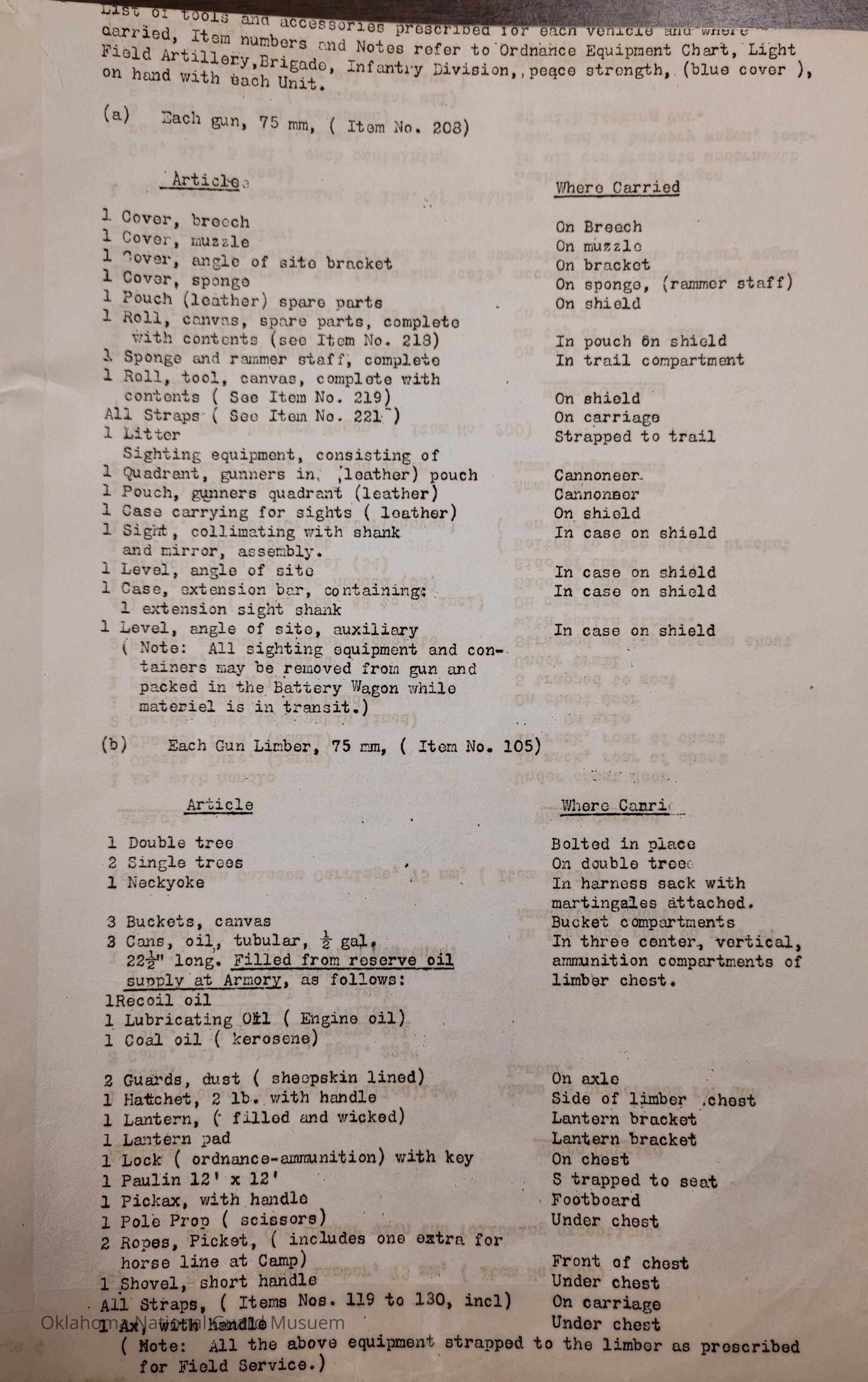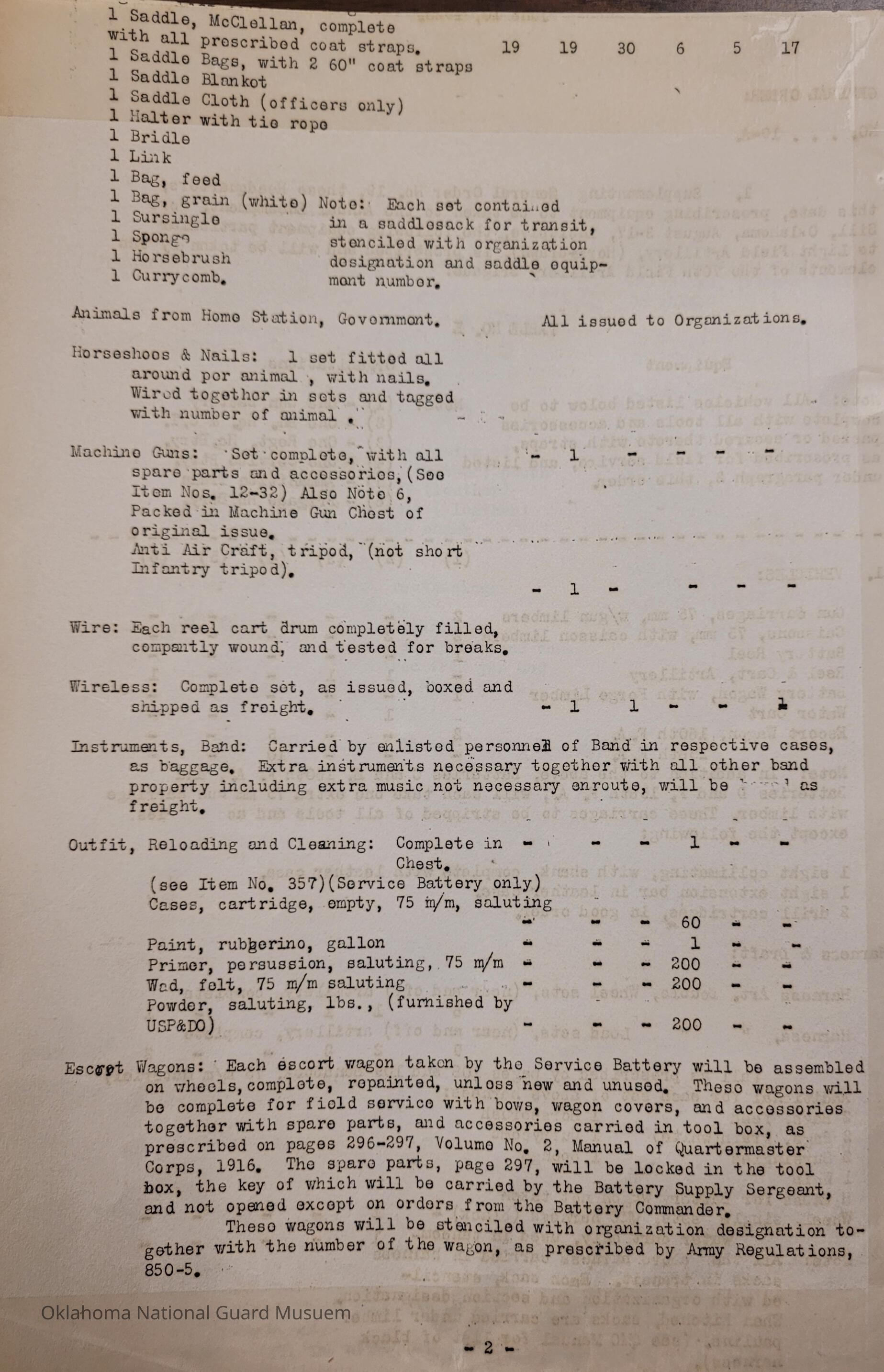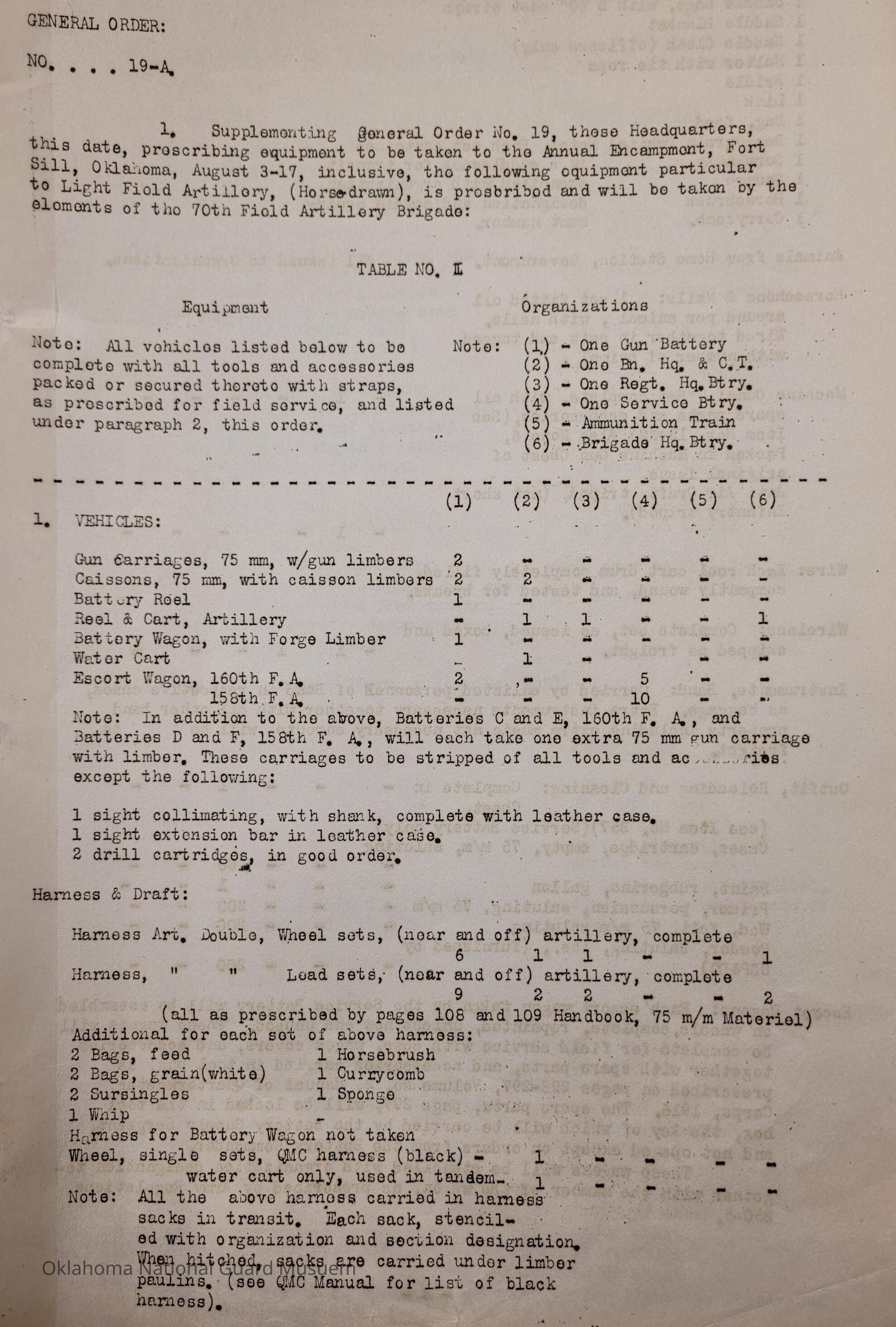General Order #19-A from Headquarters Adjutant General's Office in Oklahoma City. The order supplements General Order 19 and details what equipment, particular to Light Field Artillery, should be taken to the annual encampmentDate(s) of Creation