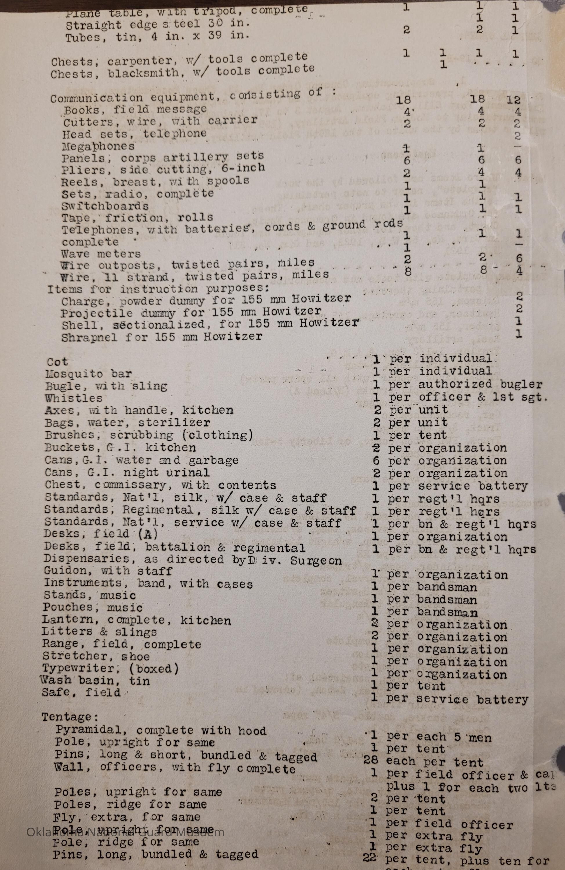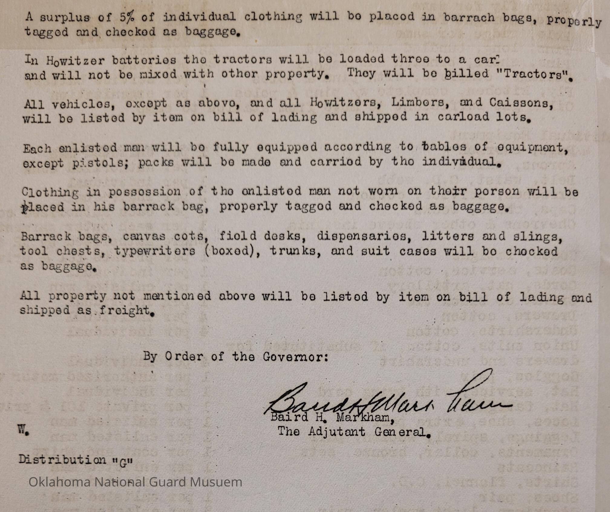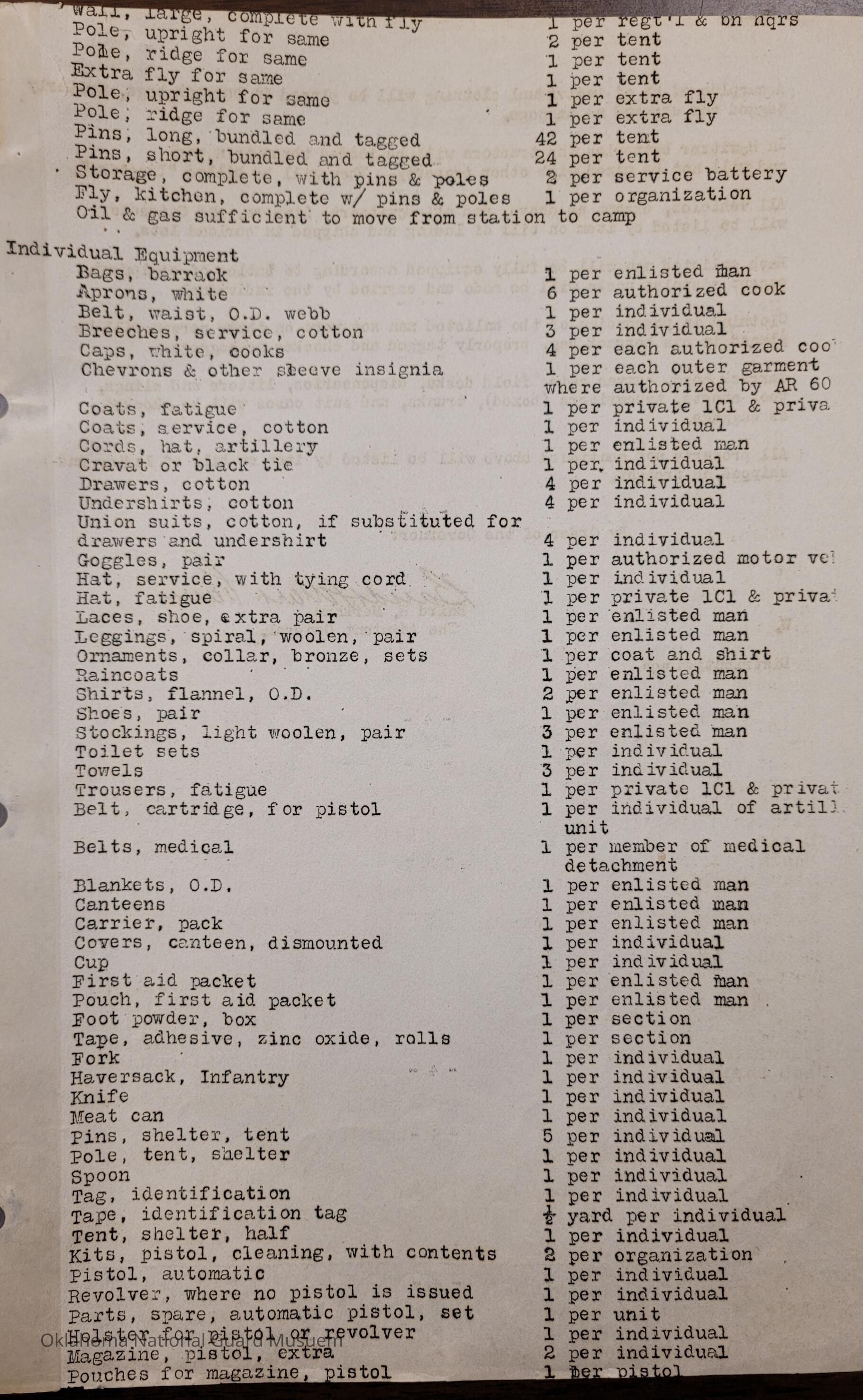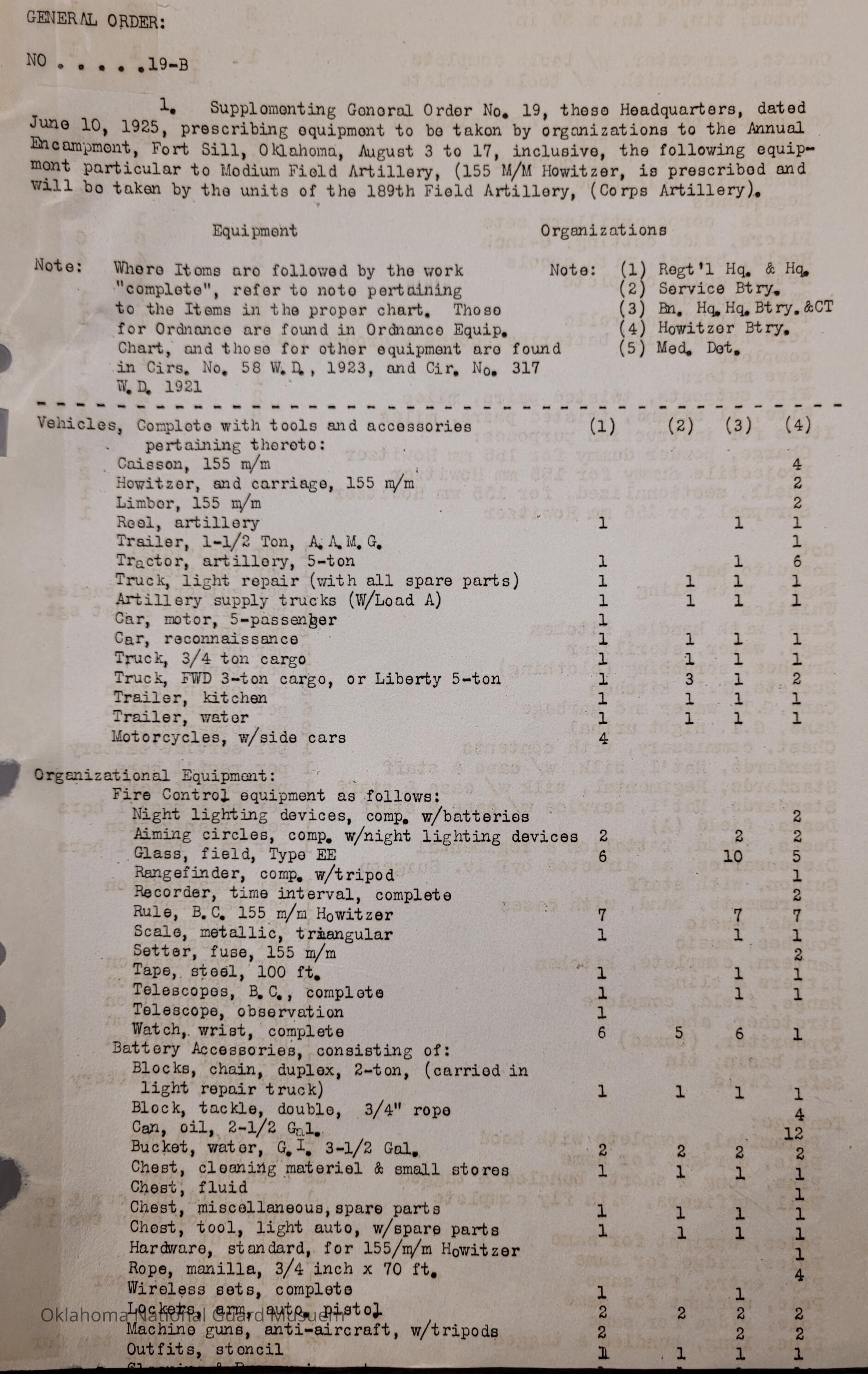 General Order #19-B from Headquarters Adjutant General's Office in Oklahoma City. The order supplements General Order 19 and details what equipment, particular to Medium Field Artillery, should be taken to the annual encampmentDate(s) of Creation